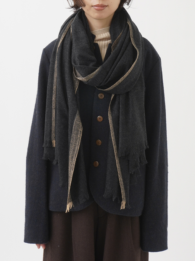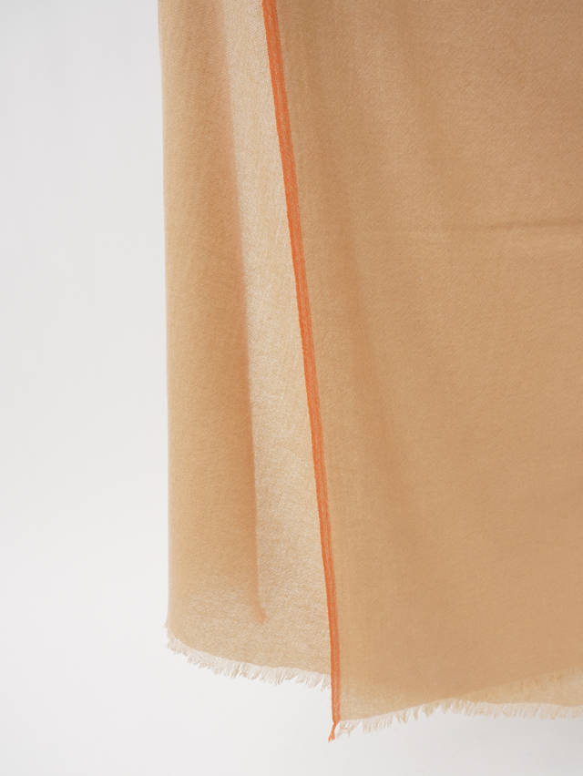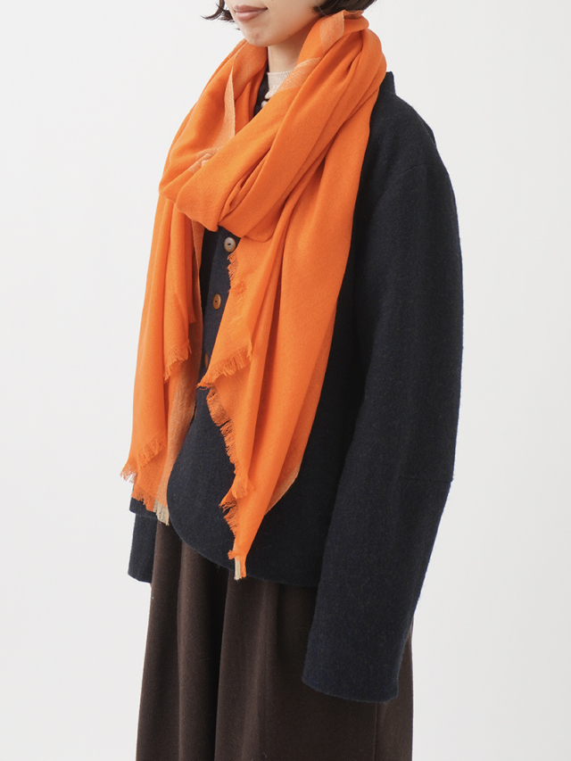 ミネラル分が豊富で、特に柔らかく艶があるのが特徴の、内モンゴルのハンシャン山脈で育つハンシャンカシミヤを使用し、空気を含むよう甘く織り上げたガーゼストール。