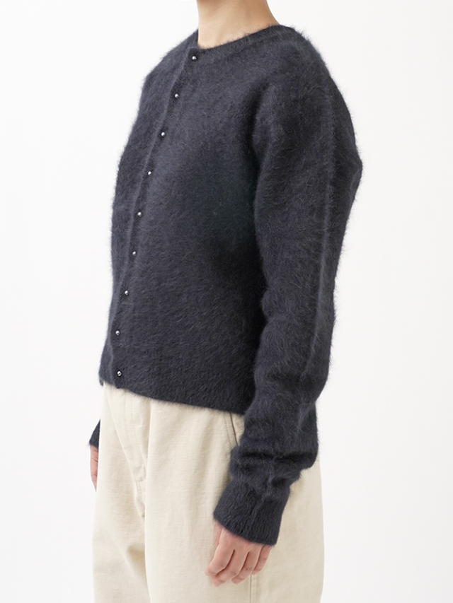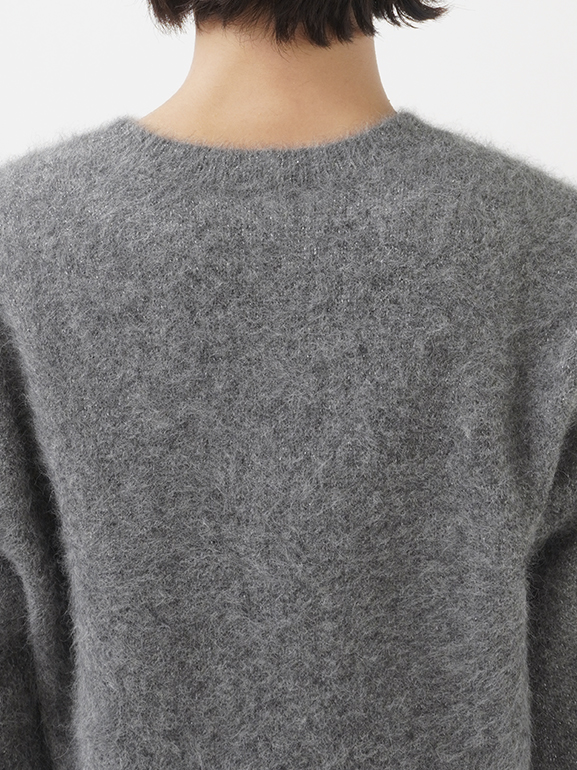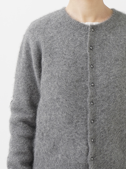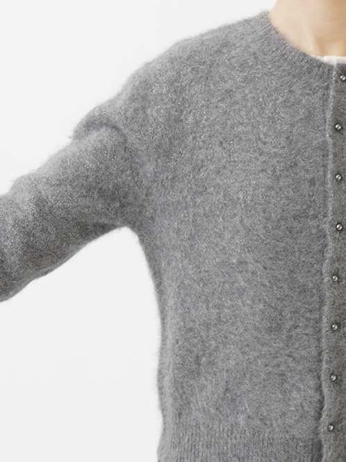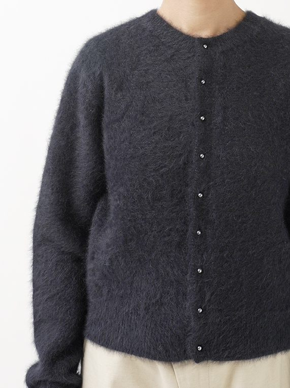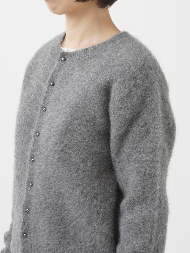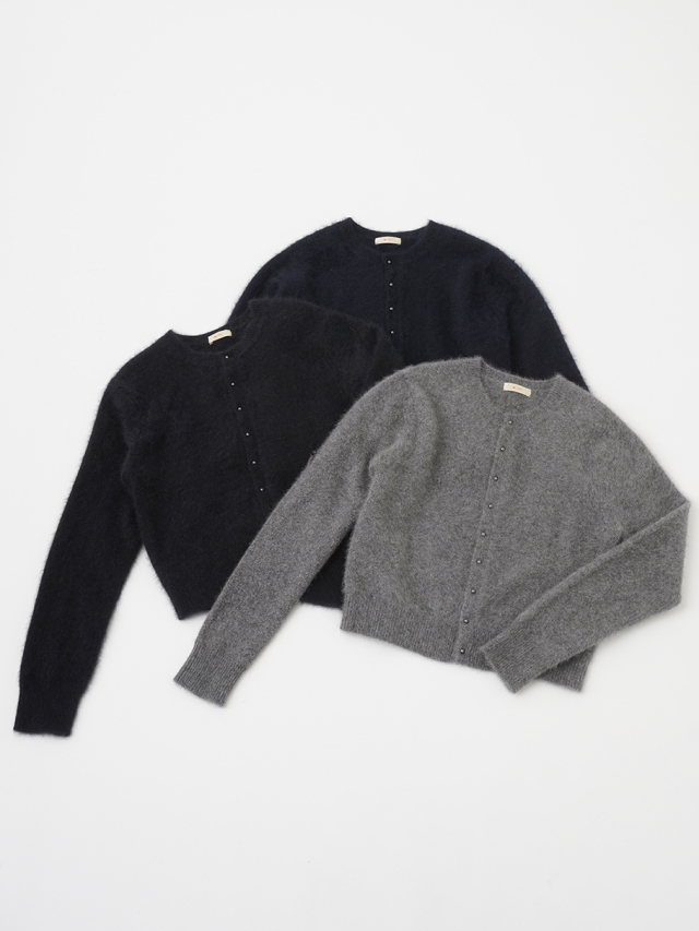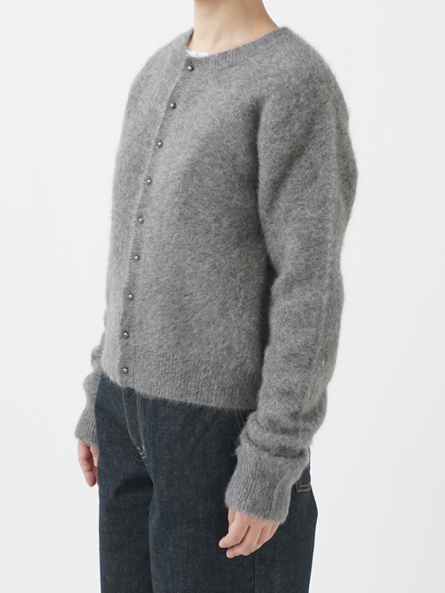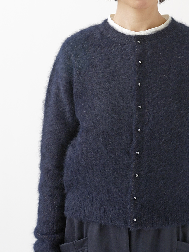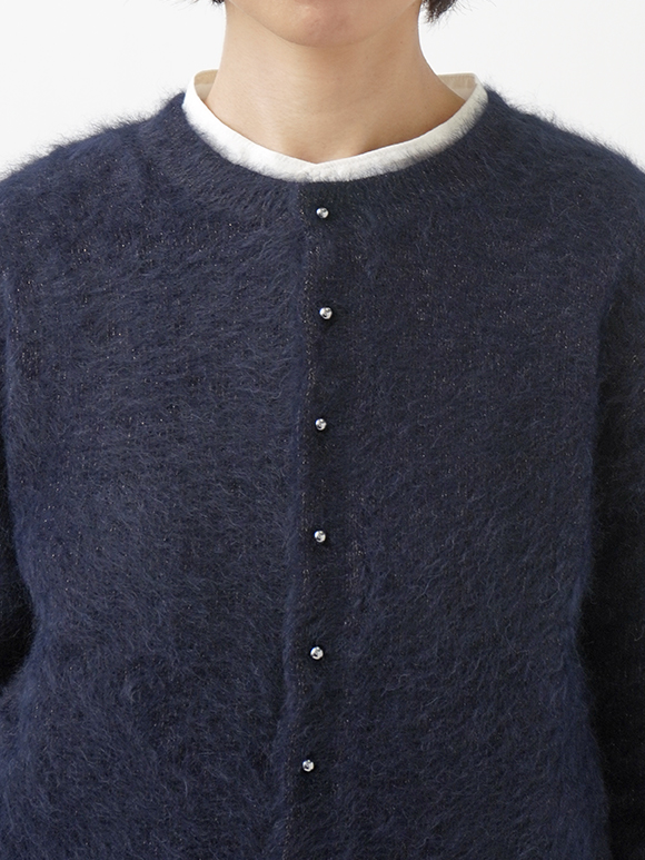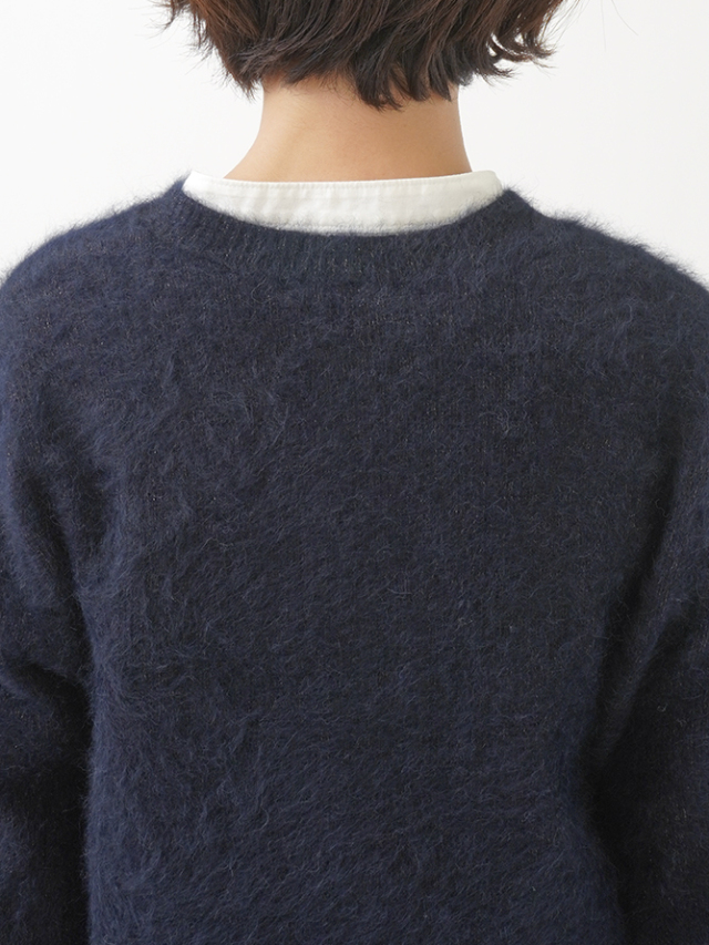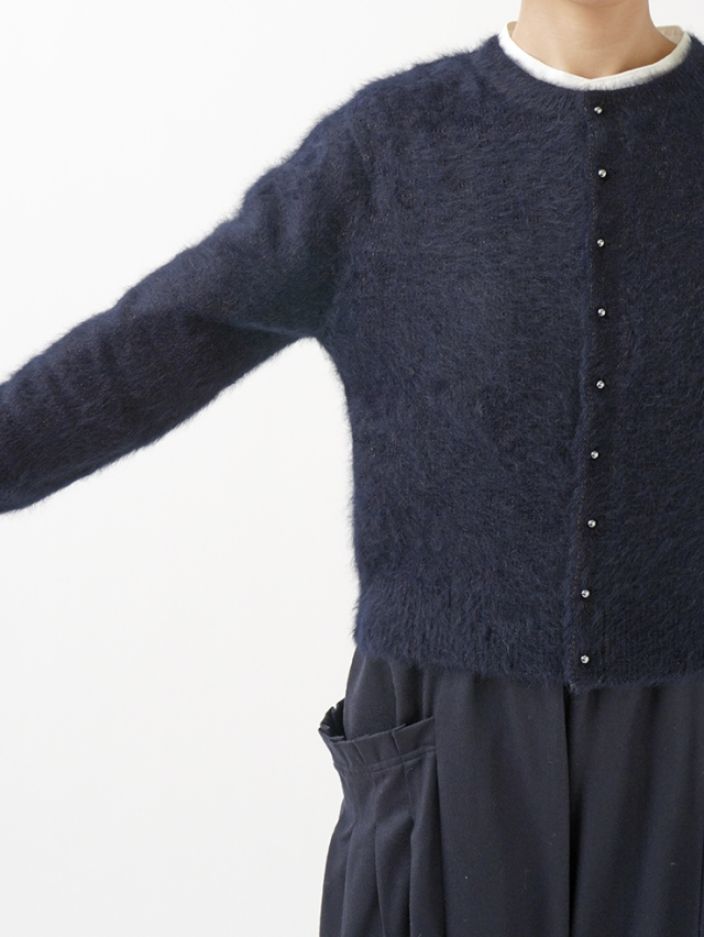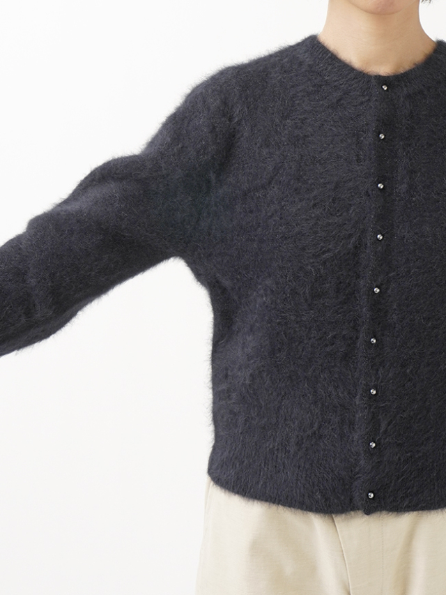フォックスとカシミヤを使い、あえて整いすぎずランダムな向きのまま紡いだ糸で編みあげたクルー襟カーディガン。