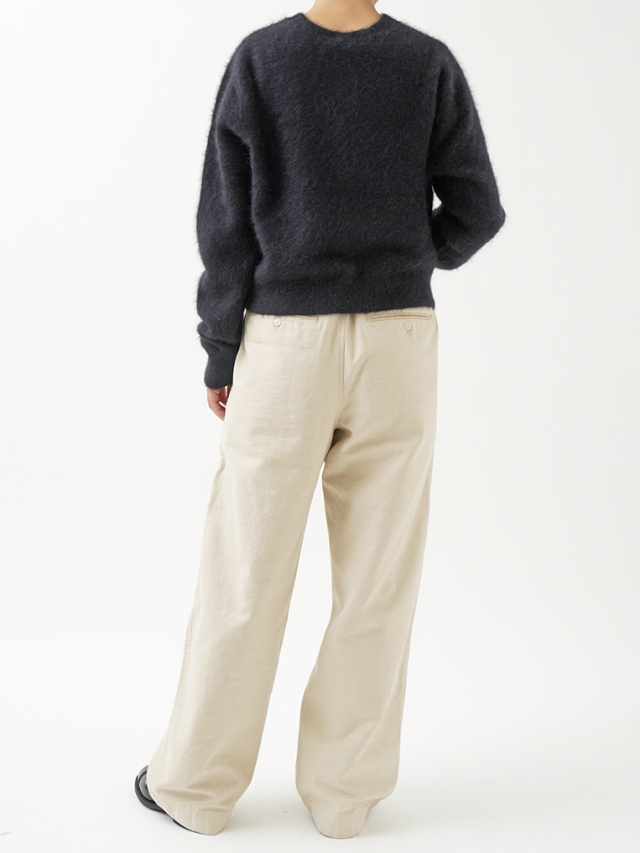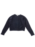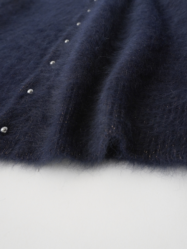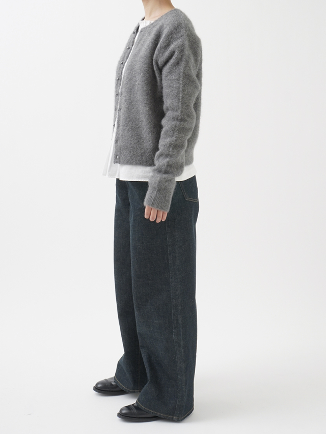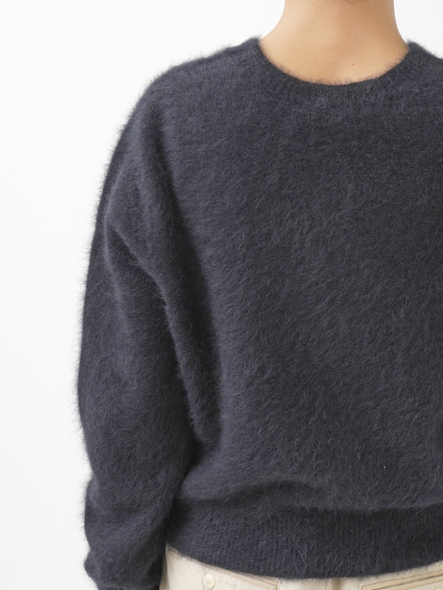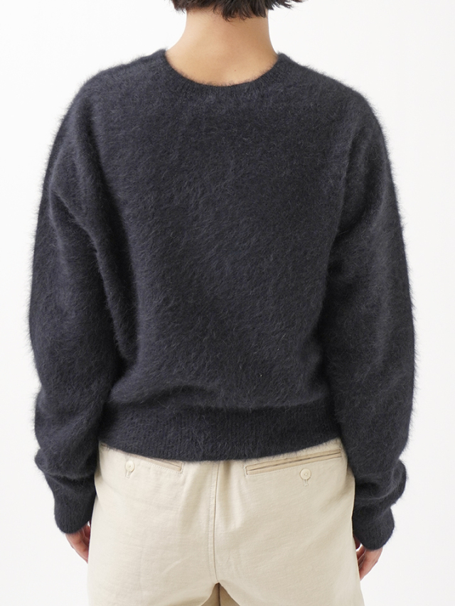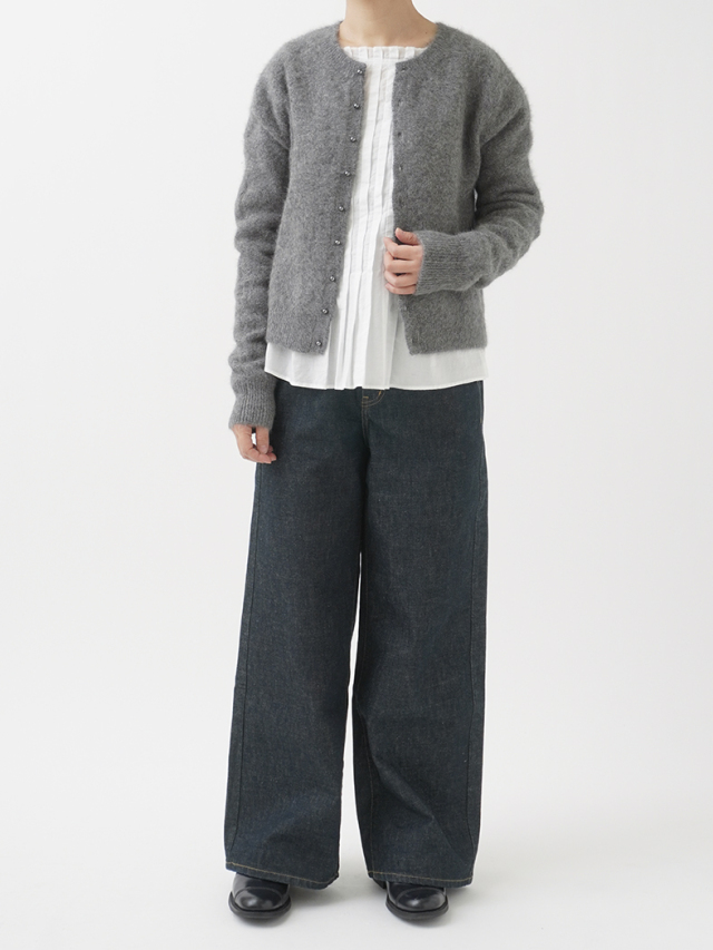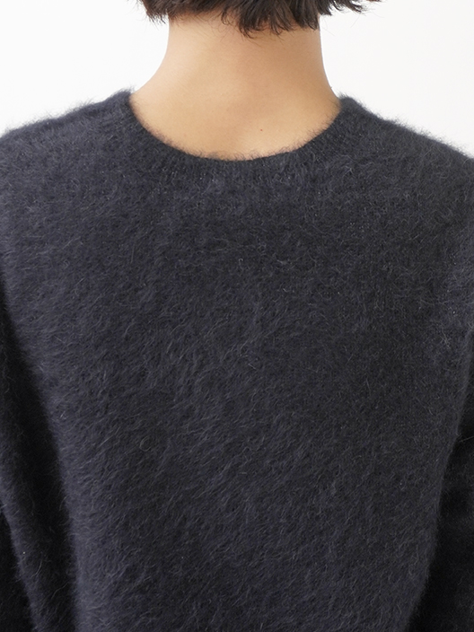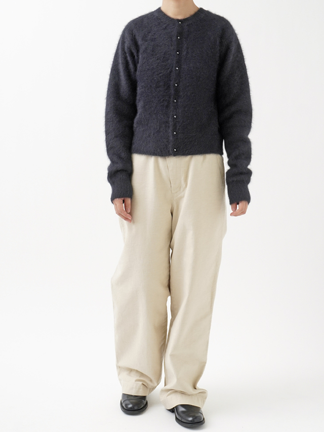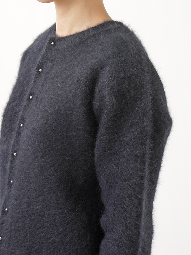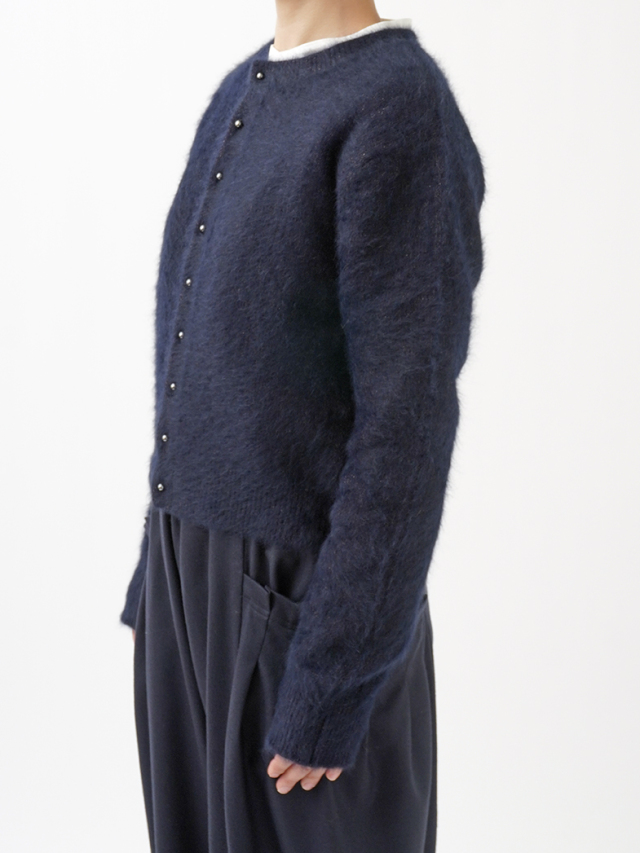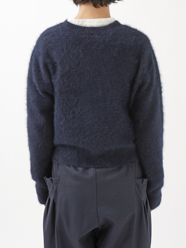 フォックスとカシミヤを使い、あえて整いすぎずランダムな向きのまま紡いだ糸で編みあげたクルー襟カーディガン。