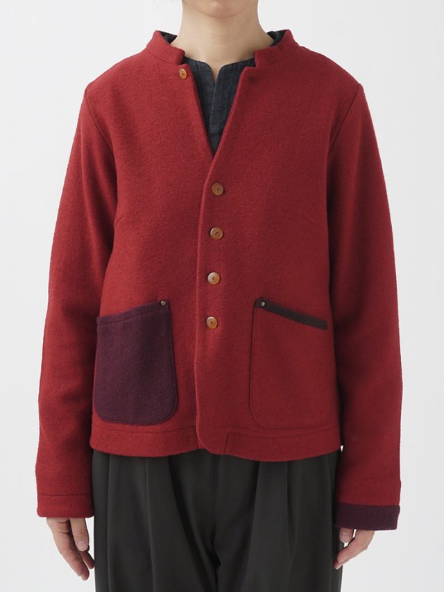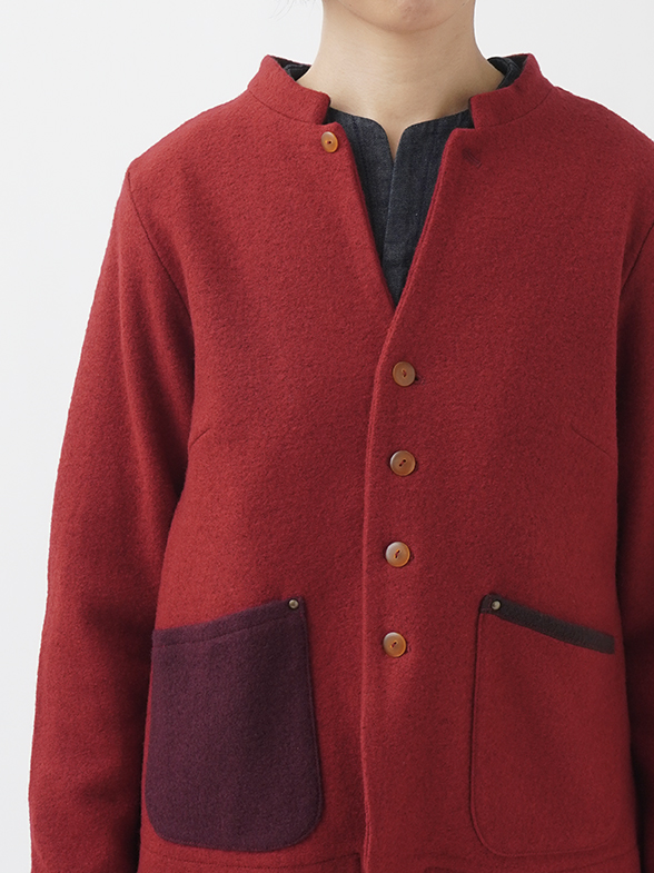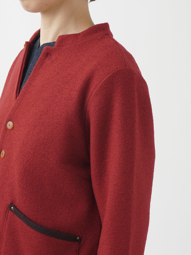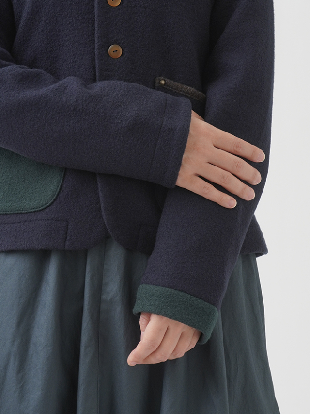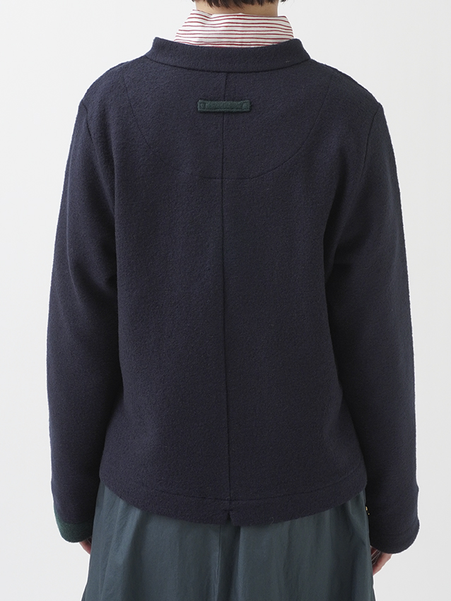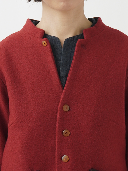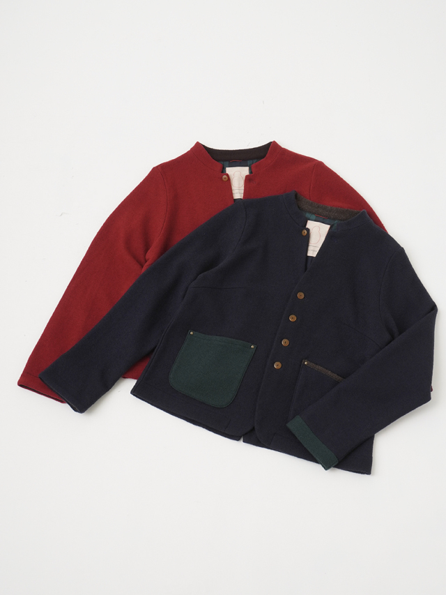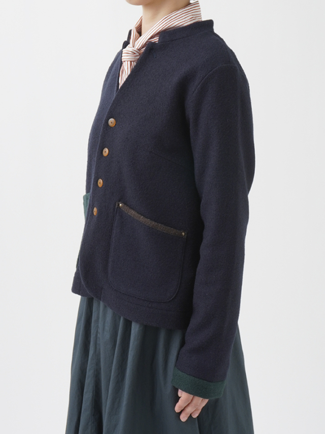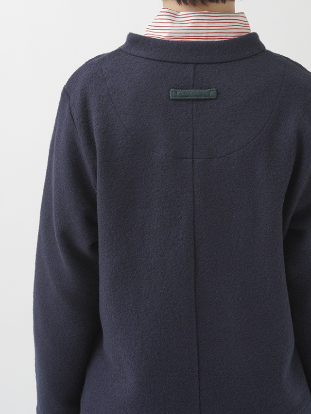 2種類のウール糸を使い、梨地に編んだ編地を縮絨加工したスタンド襟ジャケット。