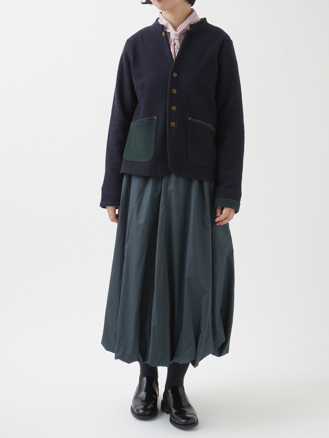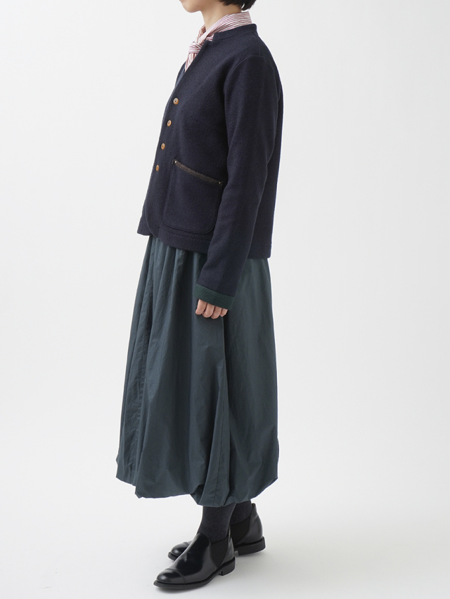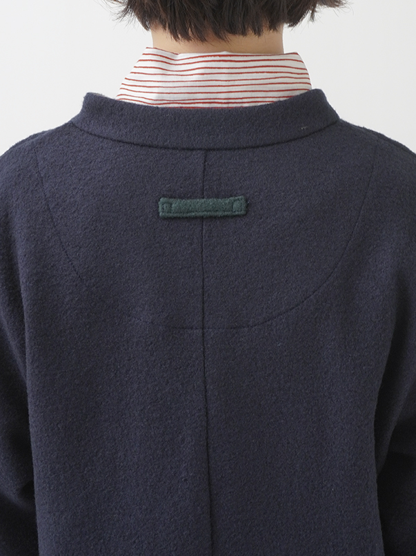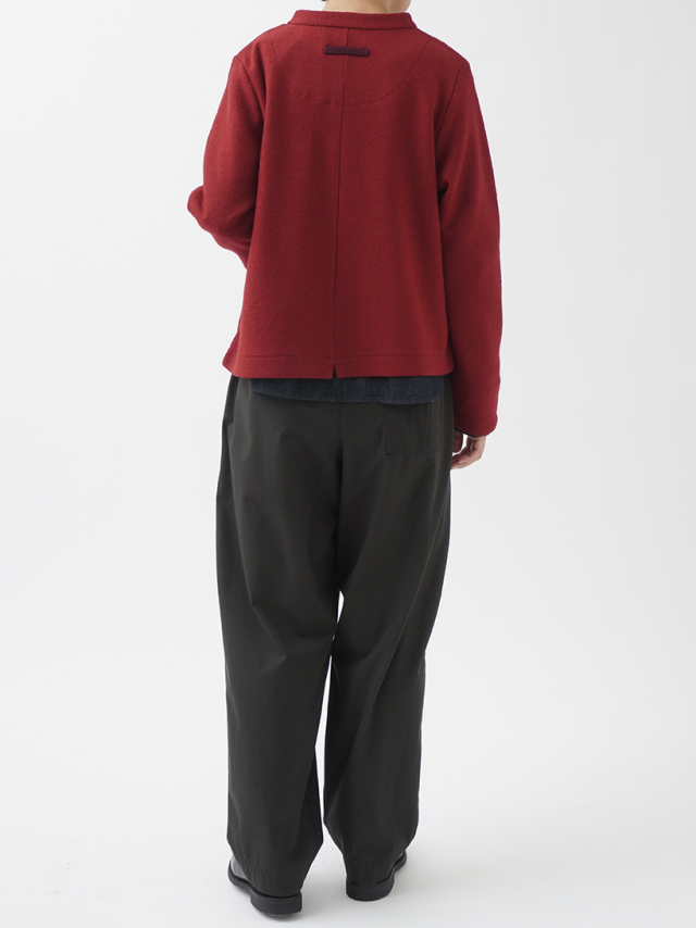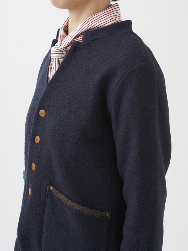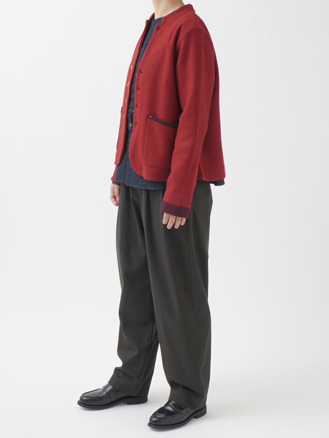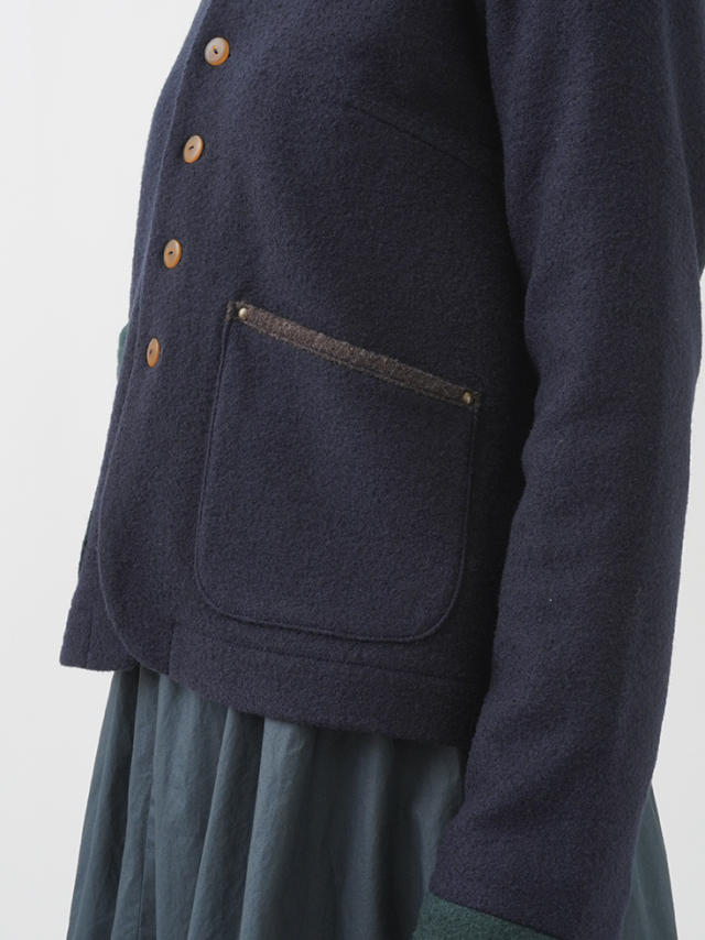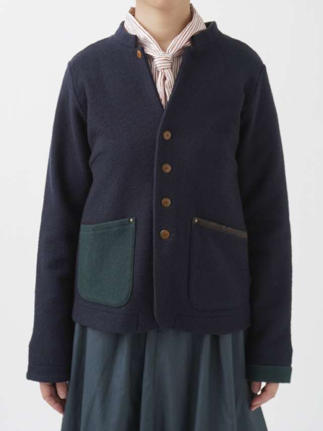 2種類のウール糸を使い、梨地に編んだ編地を縮絨加工したスタンド襟ジャケット。