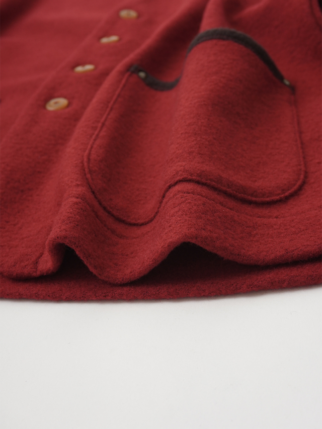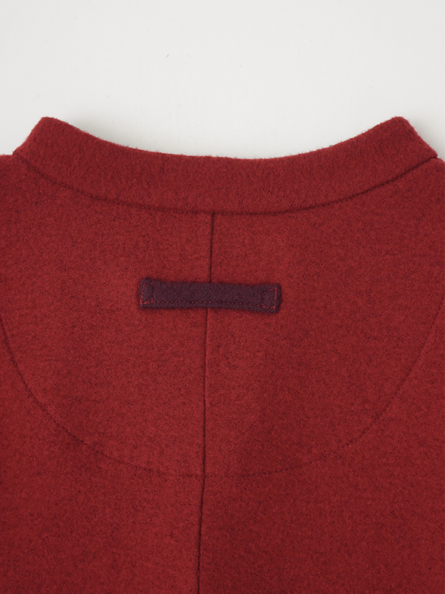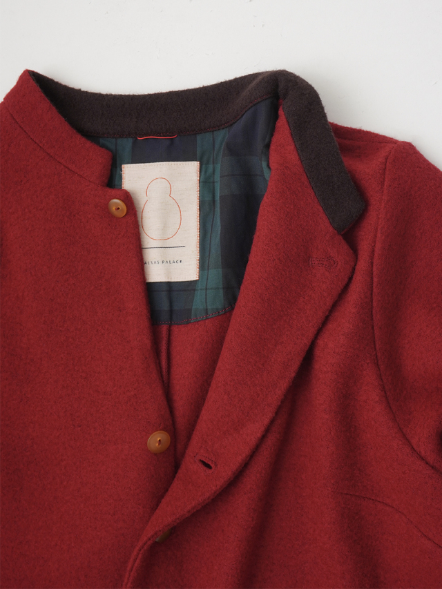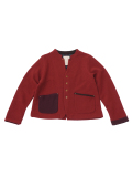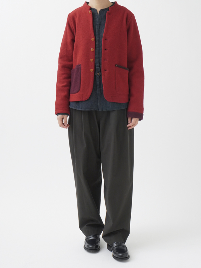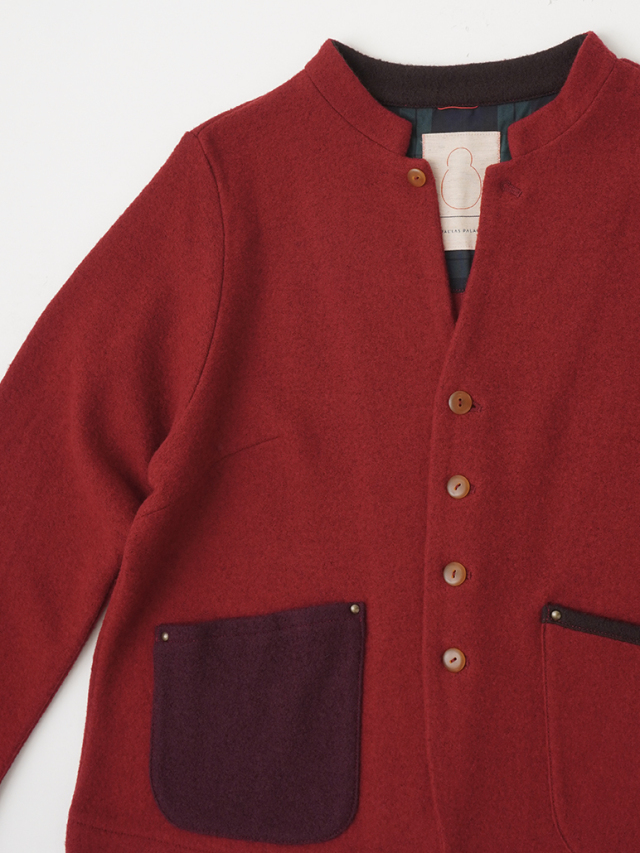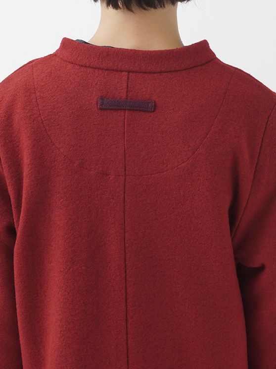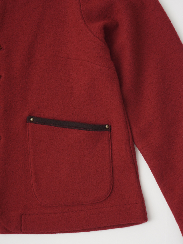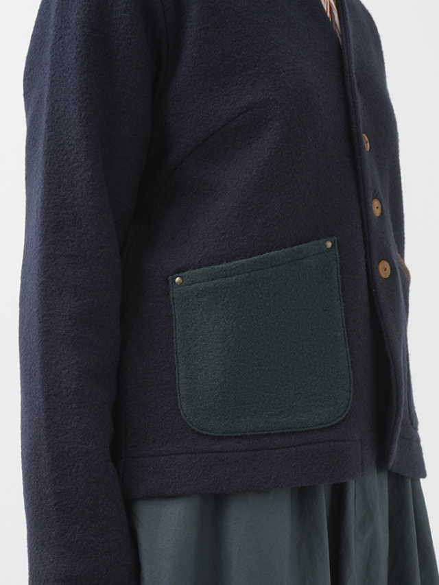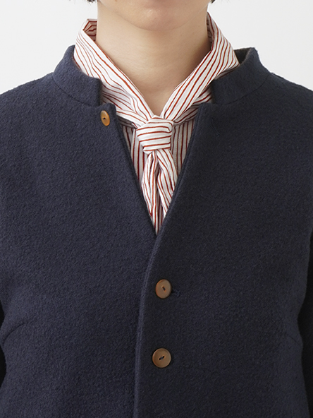 2種類のウール糸を使い、梨地に編んだ編地を縮絨加工したスタンド襟ジャケット。