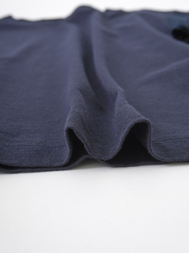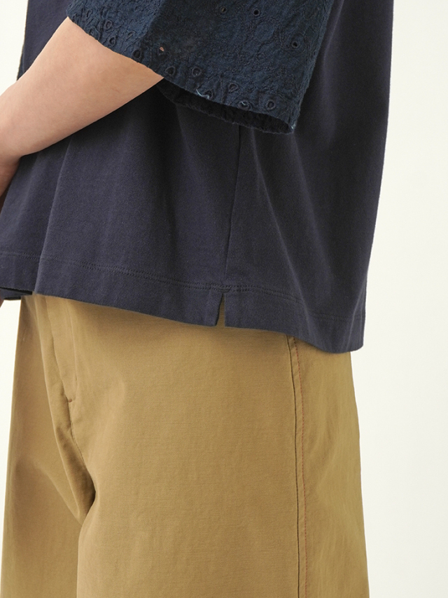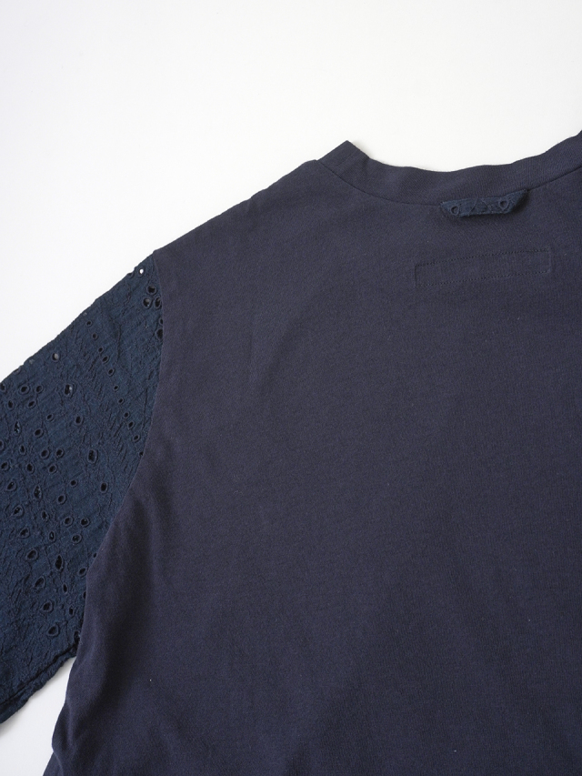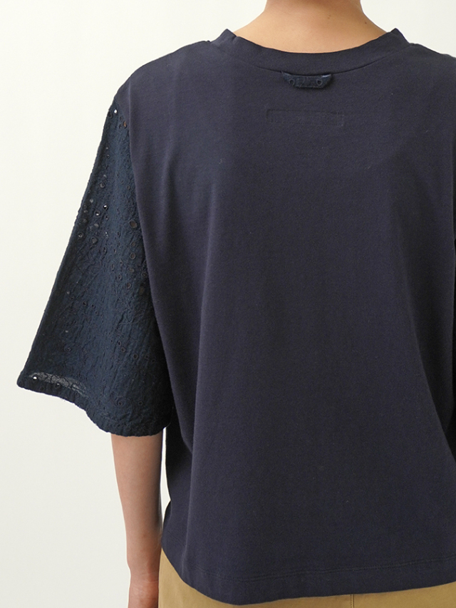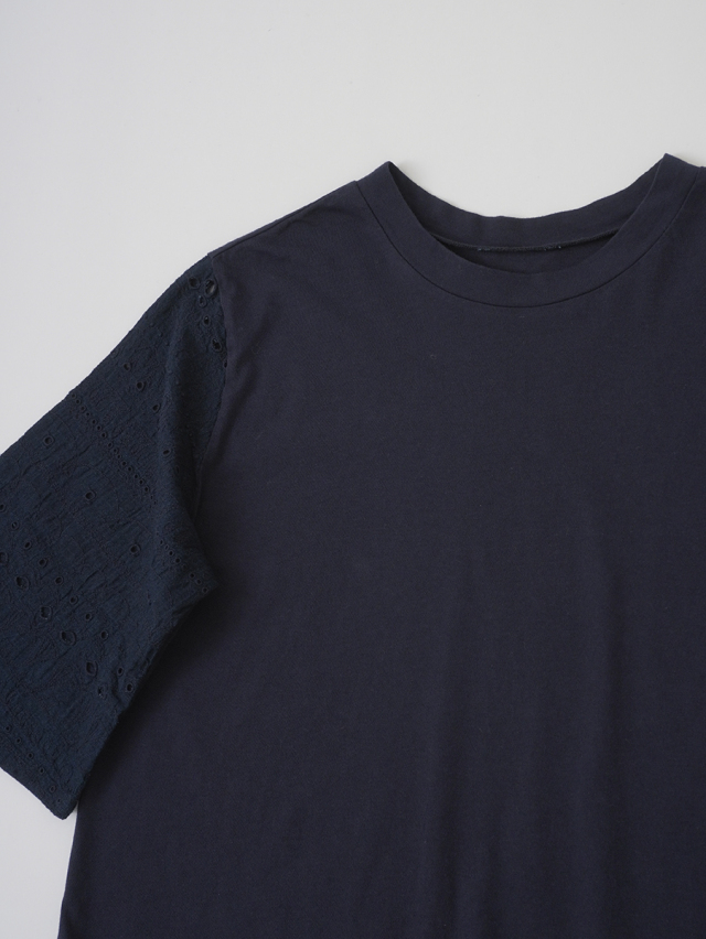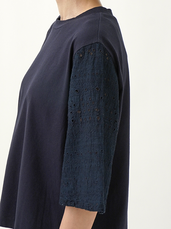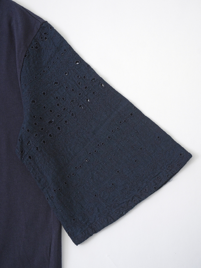 袖にボーラ刺繍のインディゴガーゼ地、身頃はなめらかな天竺素材を使ったコンビTシャツ。