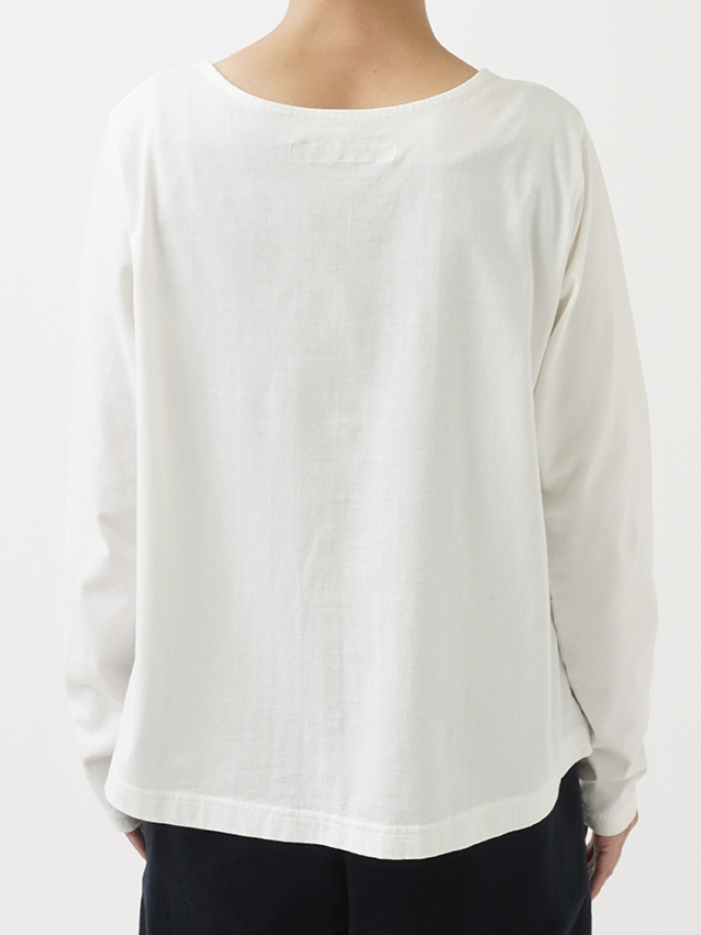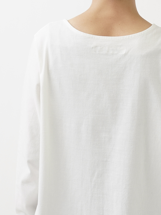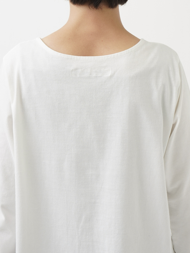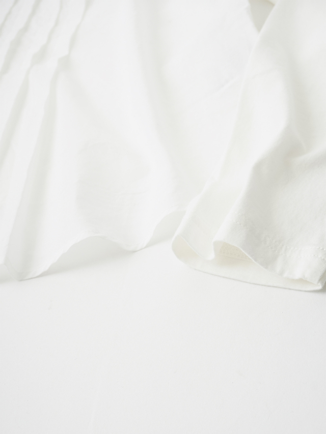 透け感あるやわらかなシャツ生地を前身頃に、袖と後ろ身頃にさらりとした手触りのハイゲージのカットソーを組み合わせたハイブリットTシャツ。