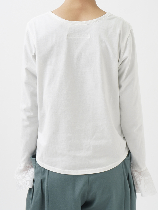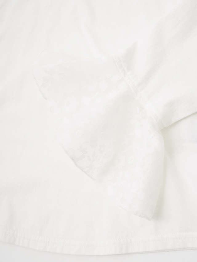 さらりとした手触りのカットソーの身頃に、柄のシャツ生地の袖を組み合わせたニットとの重ね着が楽しくなるTシャツ。
