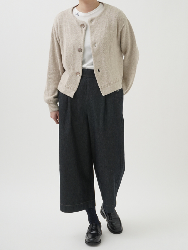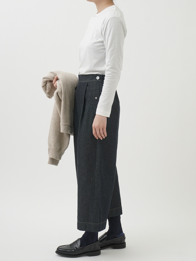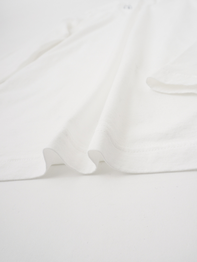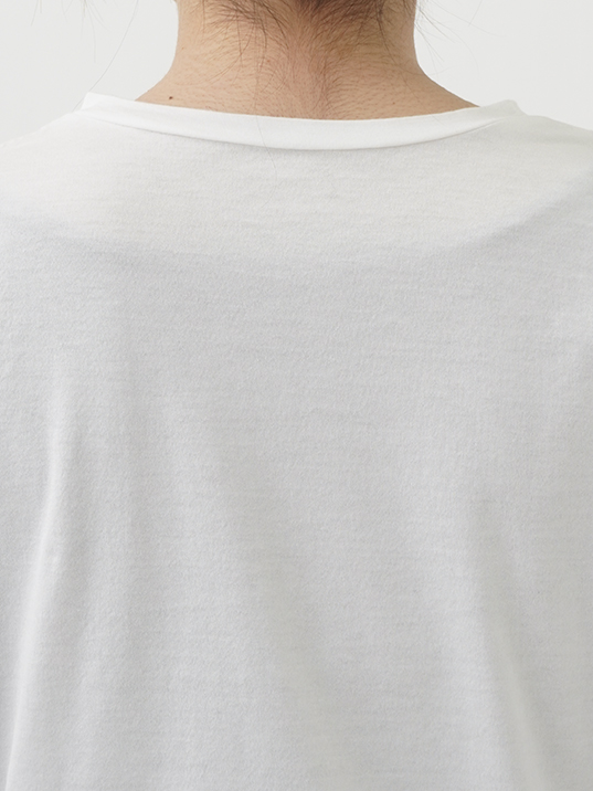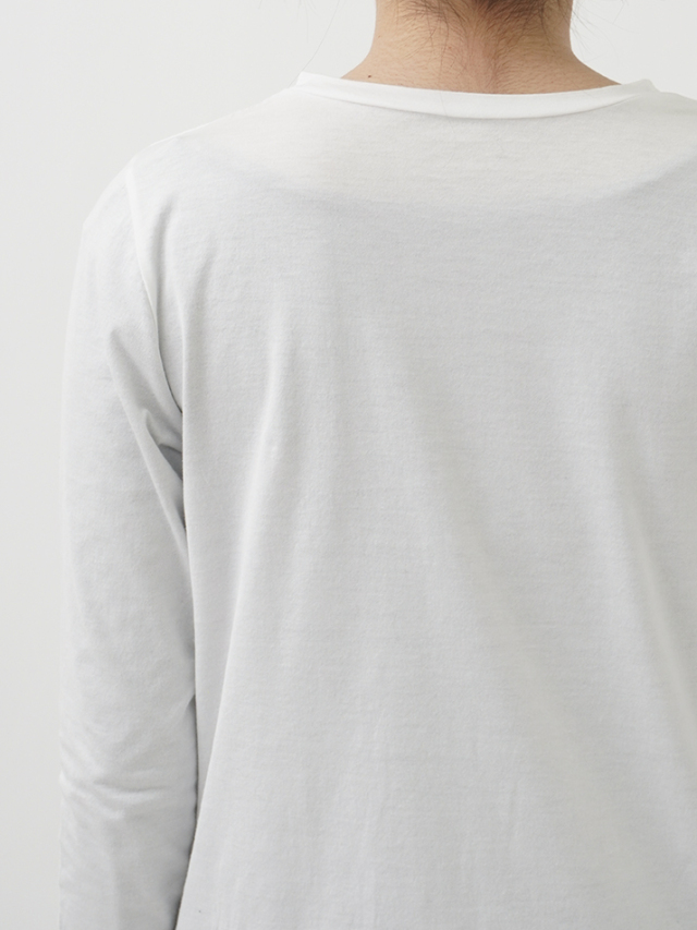 カーディガンやジャケットのインナーとしても活躍する薄手な風合いの、ベーシックなシルエットです。