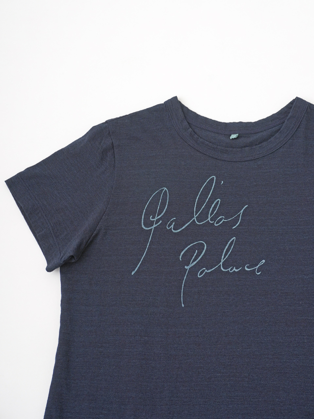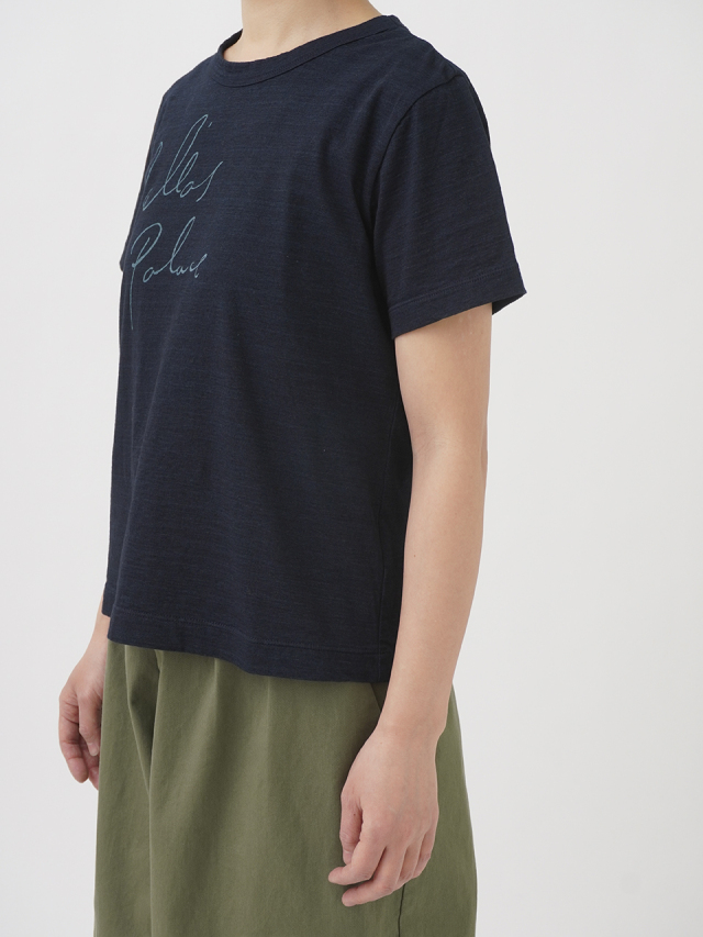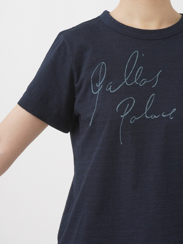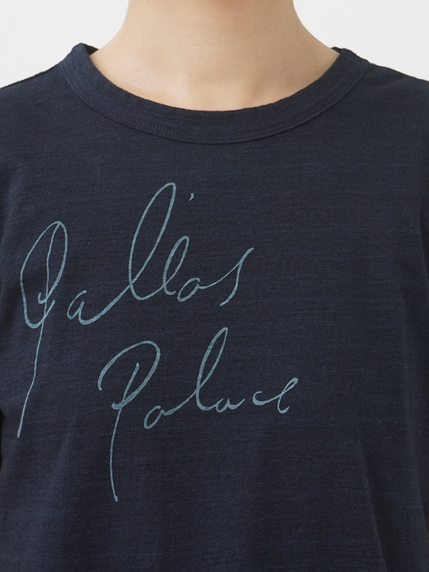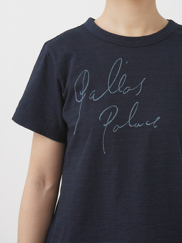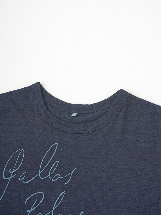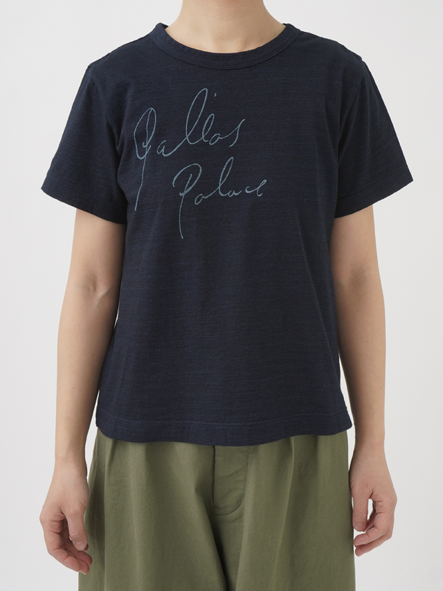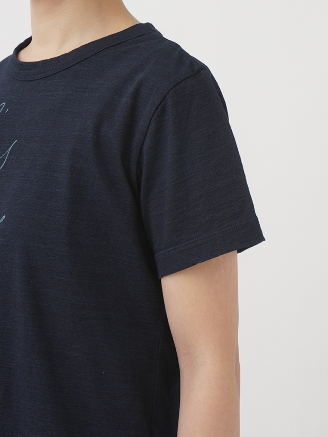 薄手でソフトな風合いのインディゴ天竺に、筆記体のロゴを抜染したTシャツ。