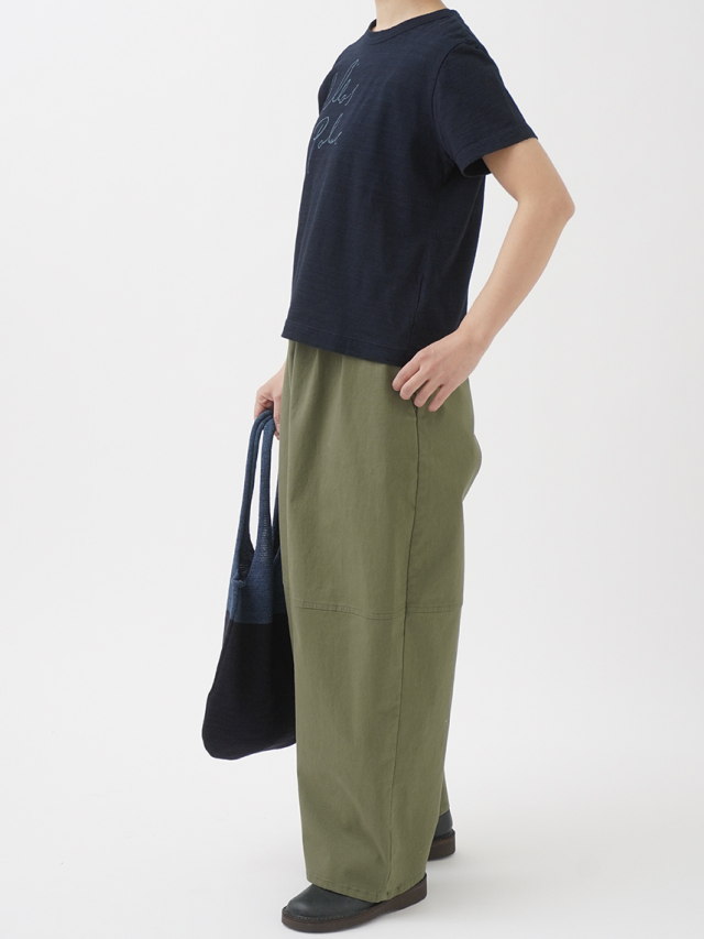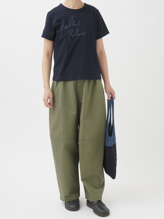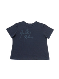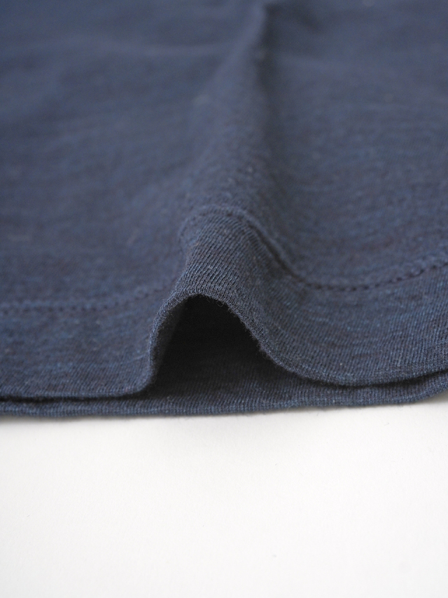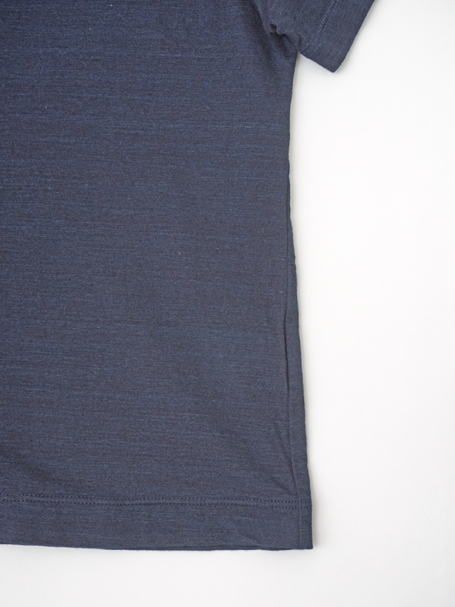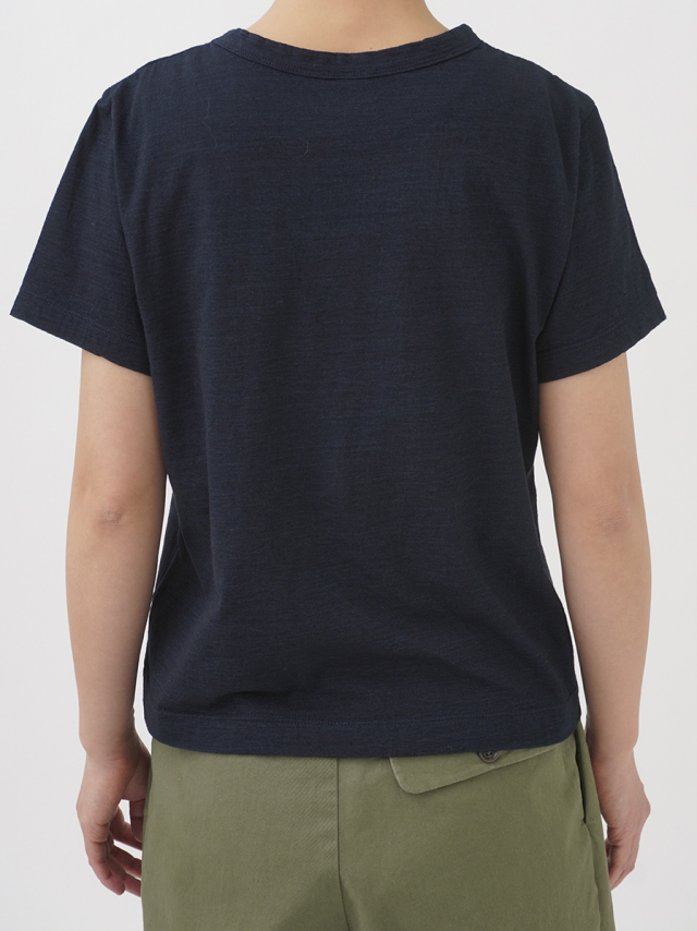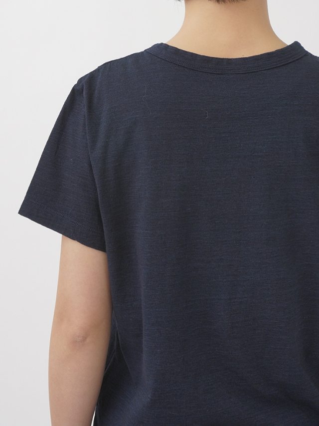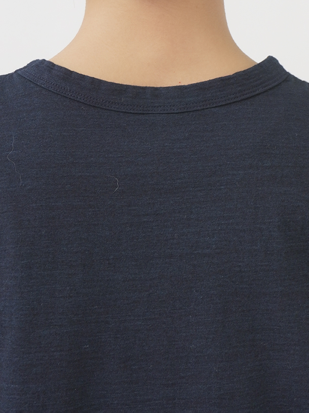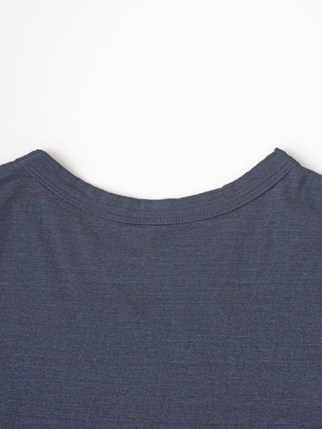 薄手でソフトな風合いのインディゴ天竺に、筆記体のロゴを抜染したTシャツ。