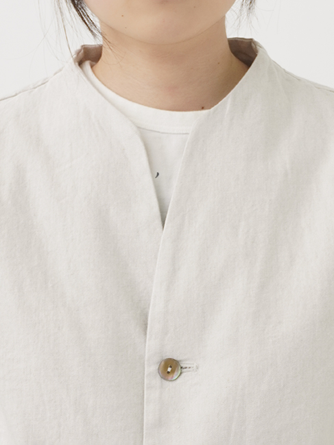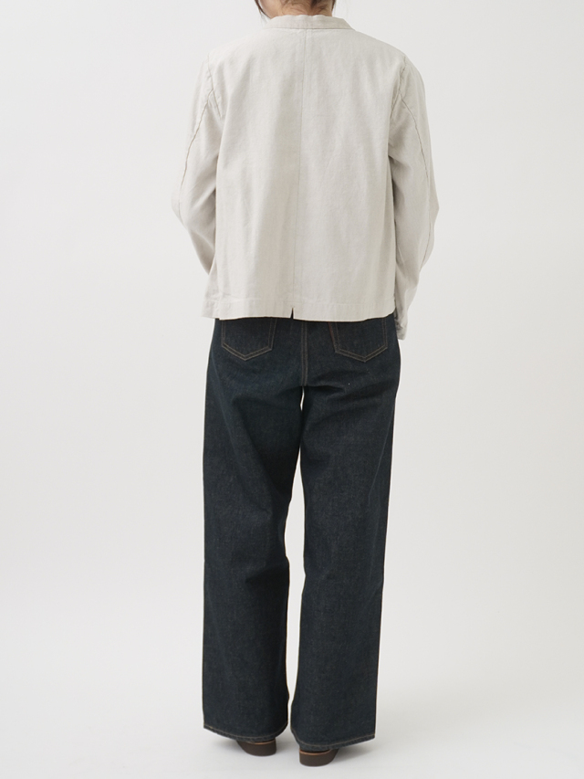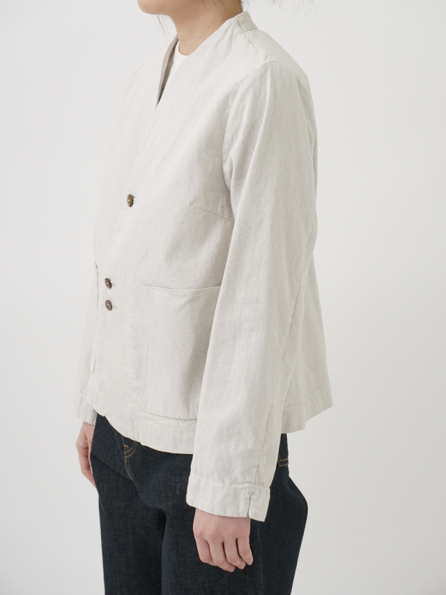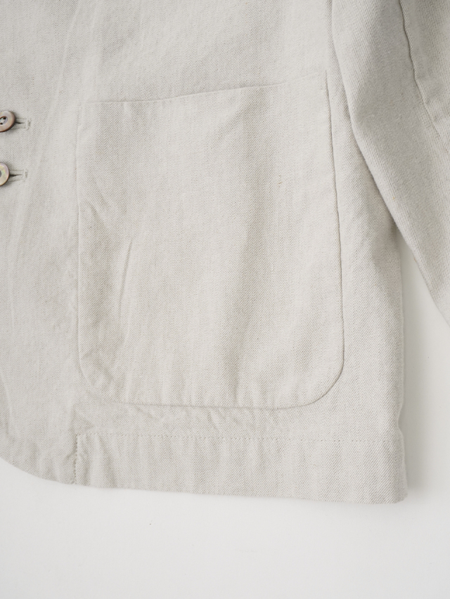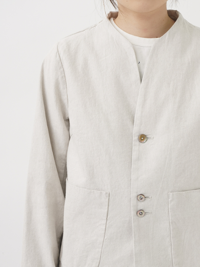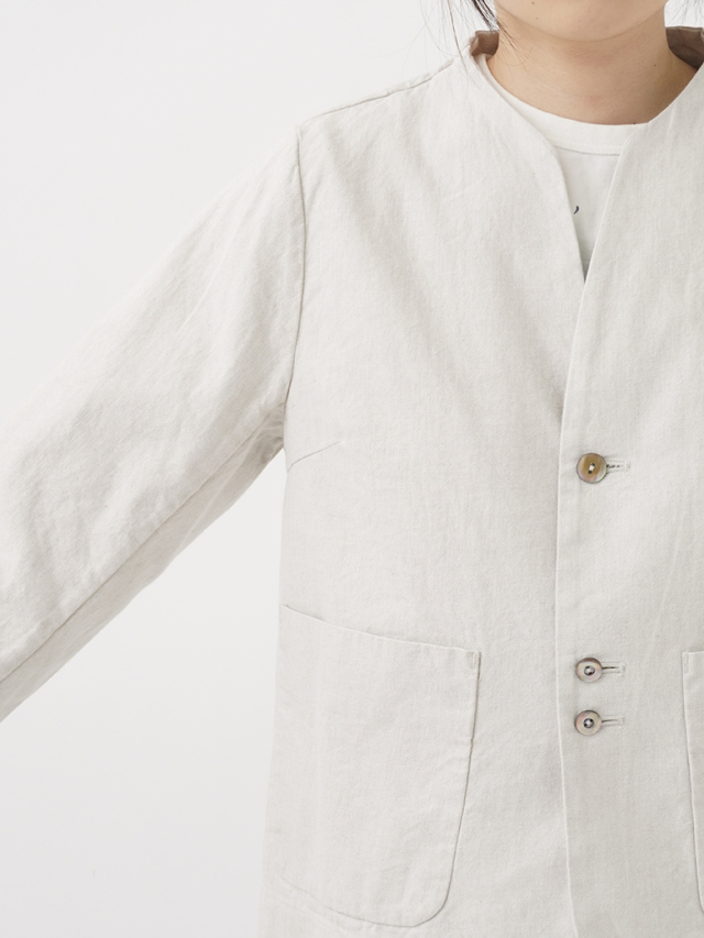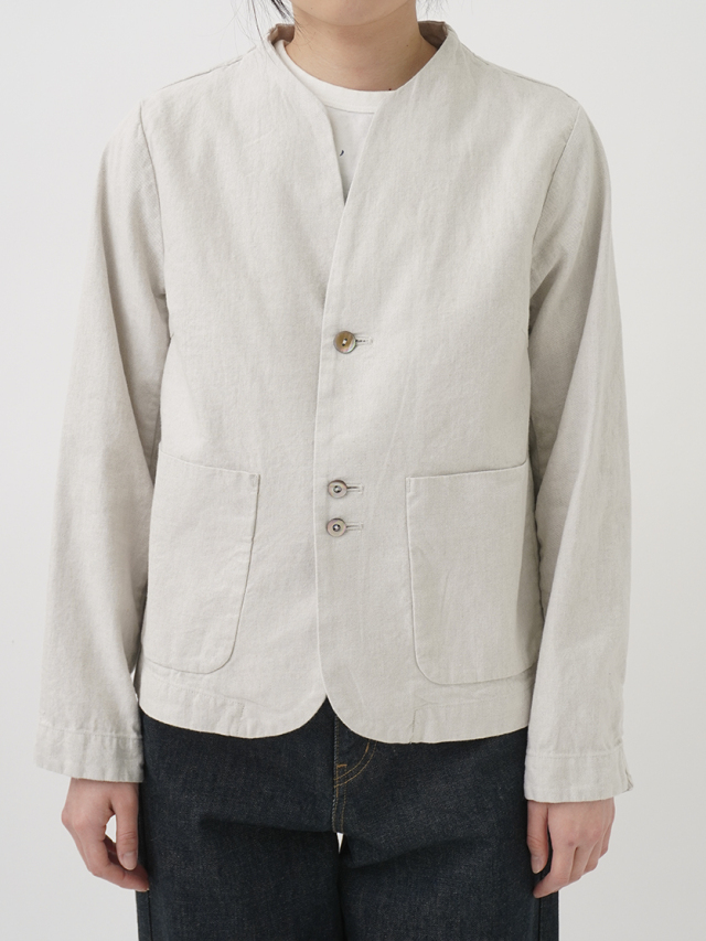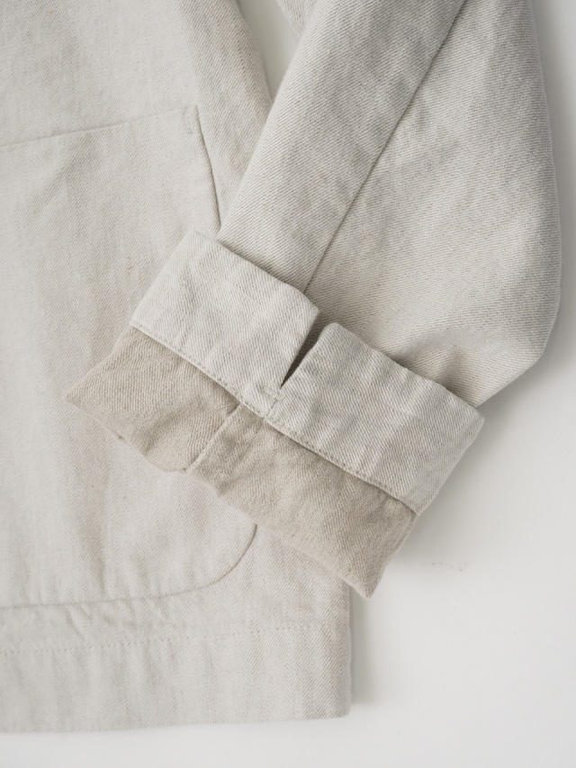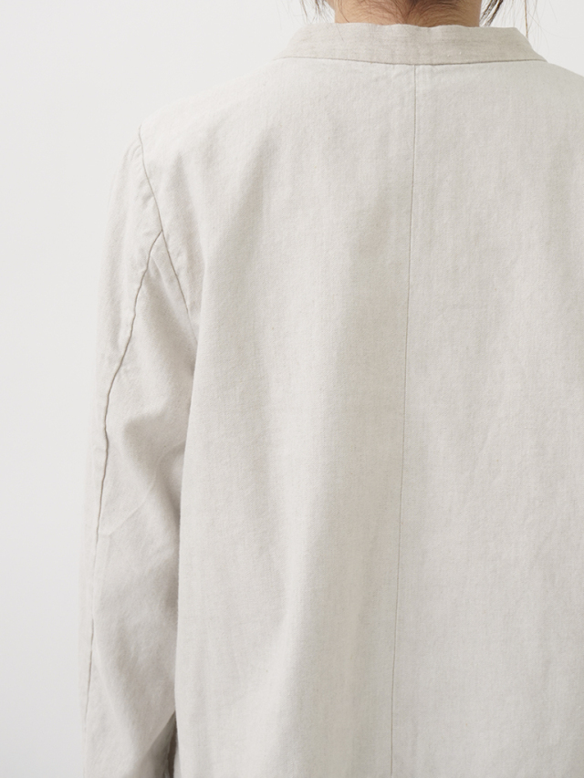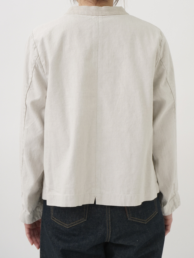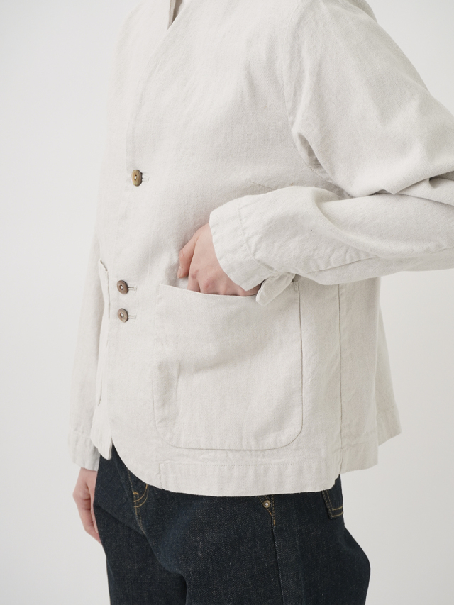 タテ糸にリネン、ヨコ糸にコットンの糸を使用し、高密度に織った、しなやかさと張り感のバランスが良い生地のジャケット。