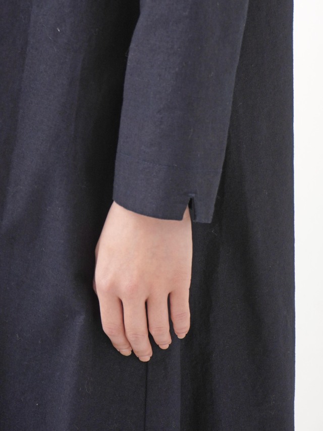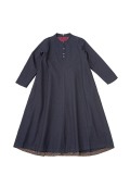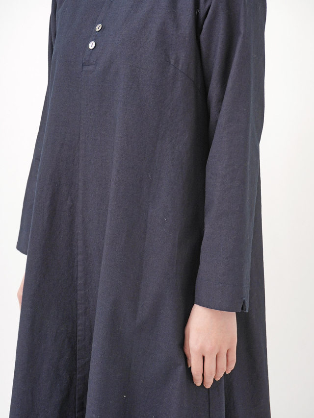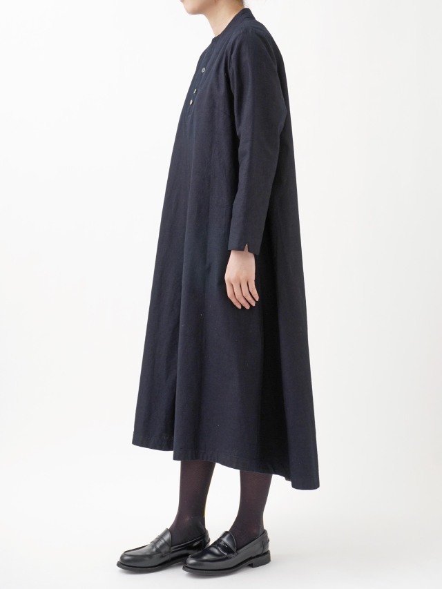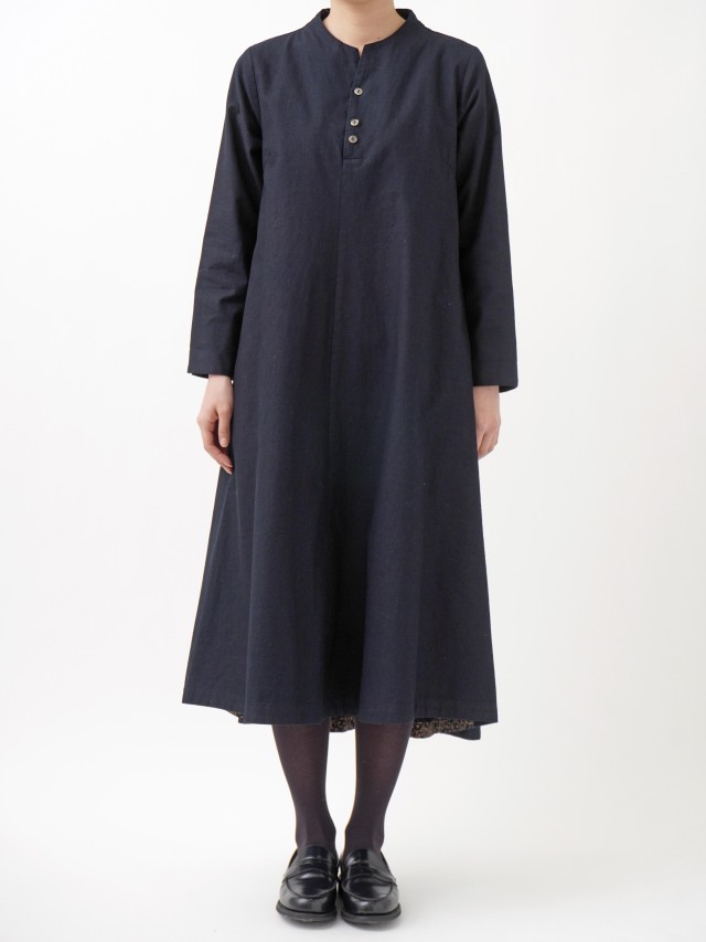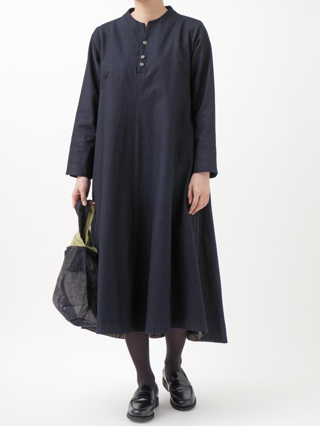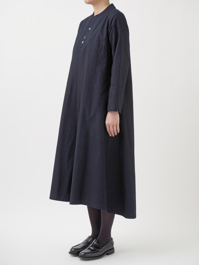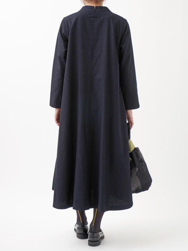 程よい張りと厚みのインディゴ生地を使用したボトル襟フレアワンピース。