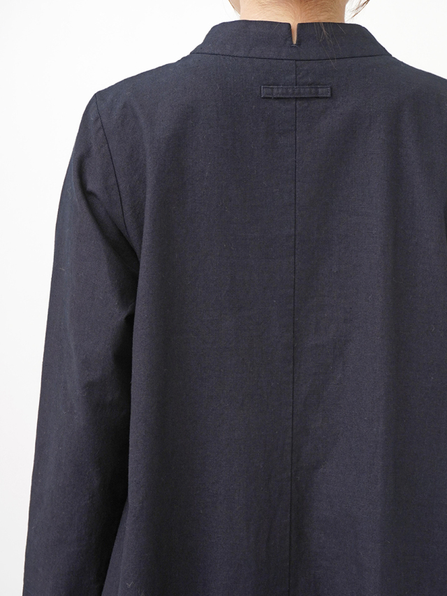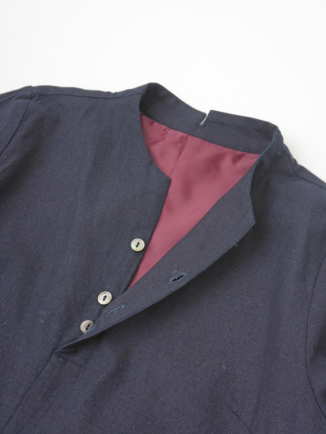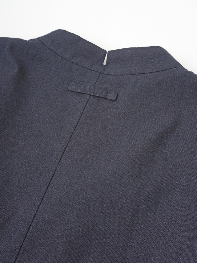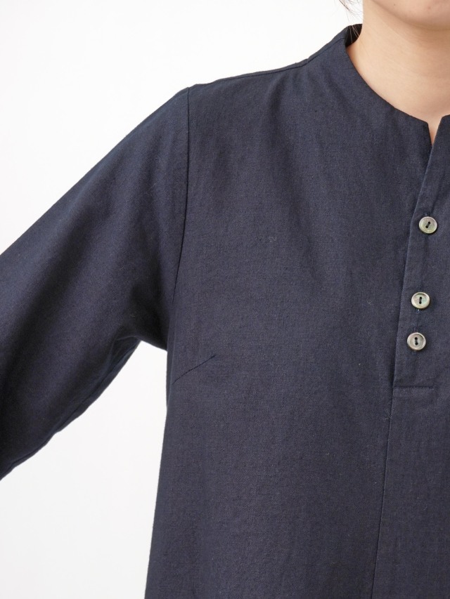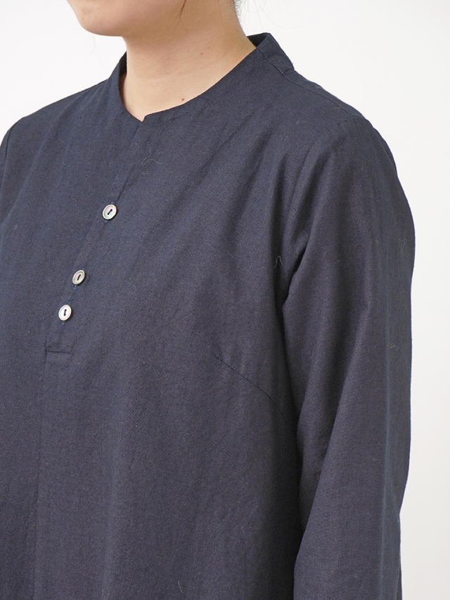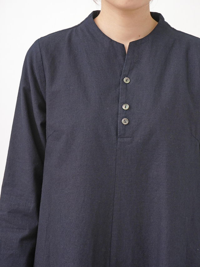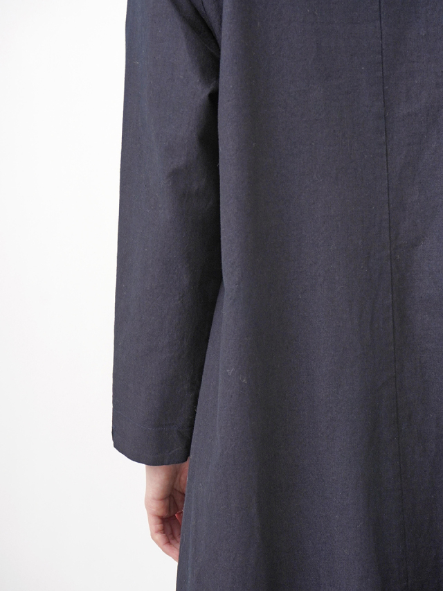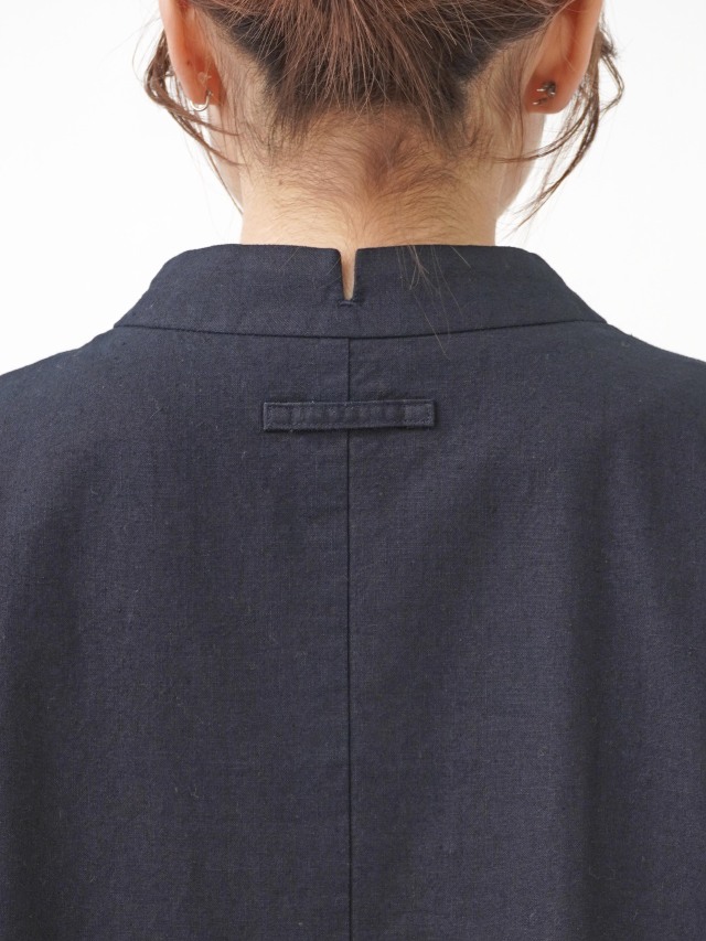 程よい張りと厚みのインディゴ生地を使用したボトル襟フレアワンピース。