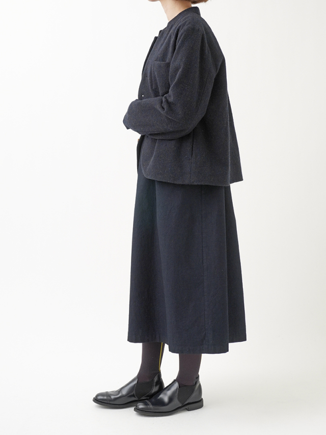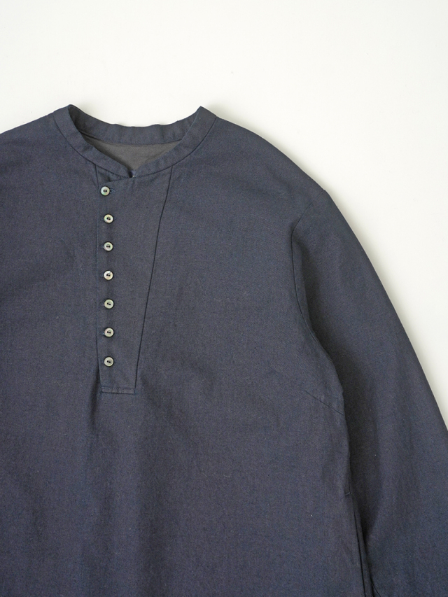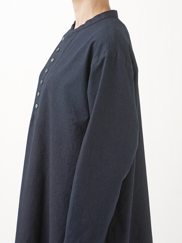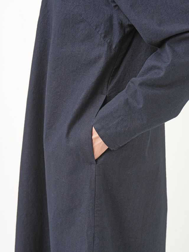 程よい張りと厚みのインディゴ生地を使用したスタンド襟ワンピース。