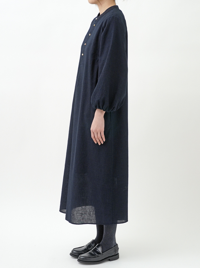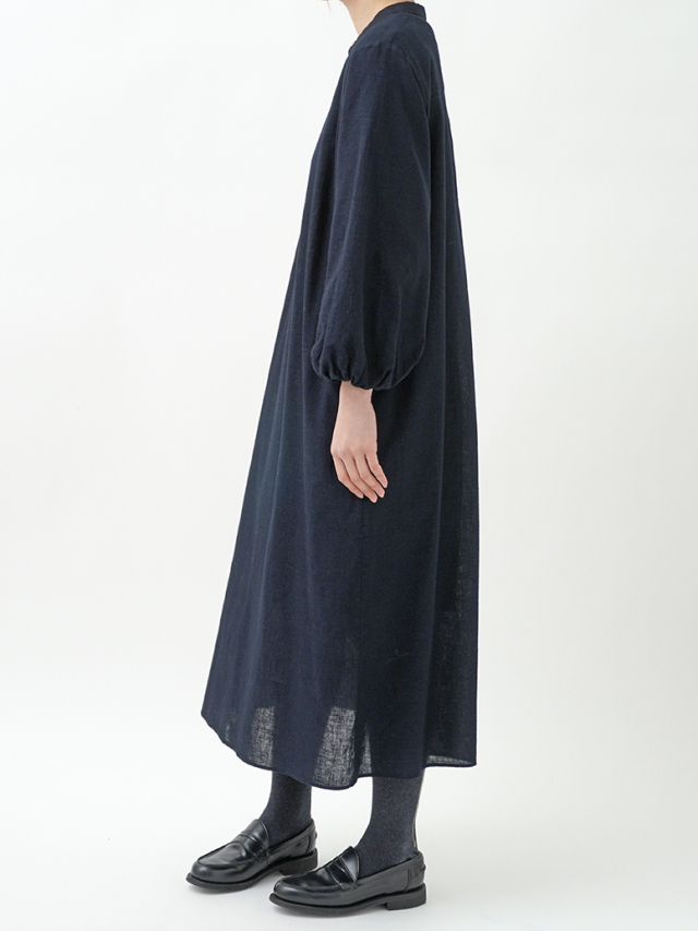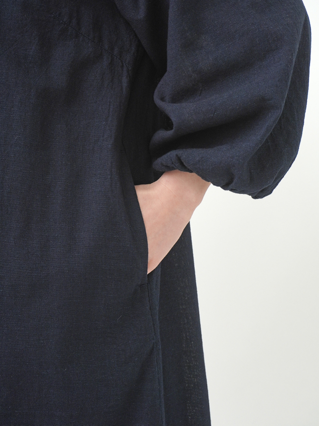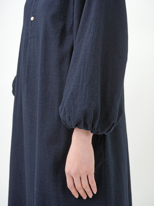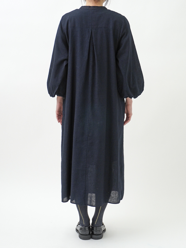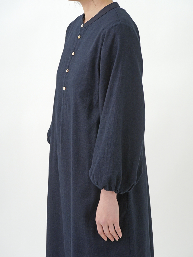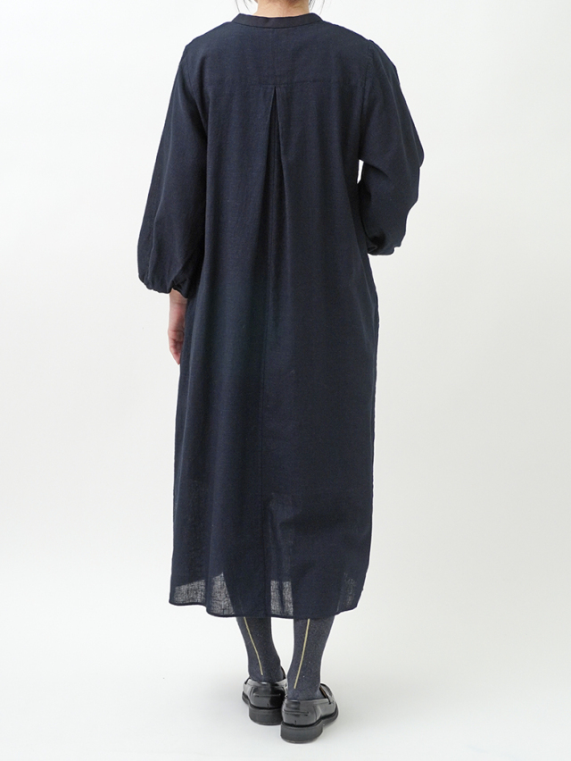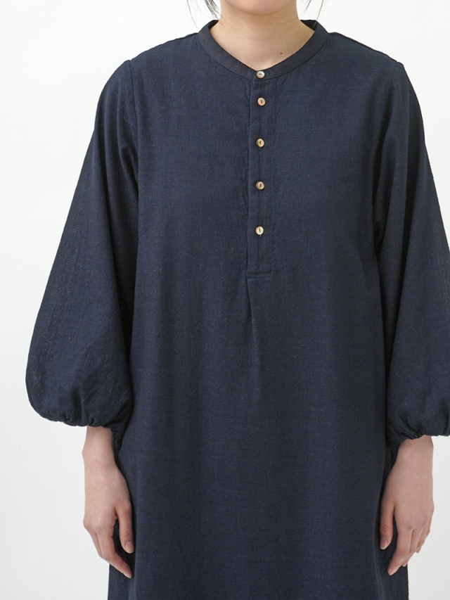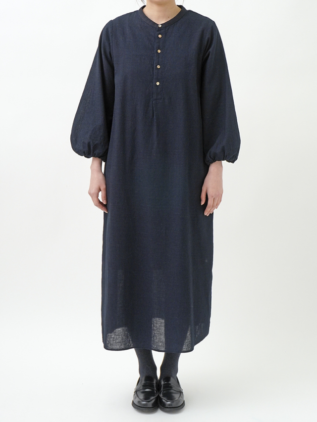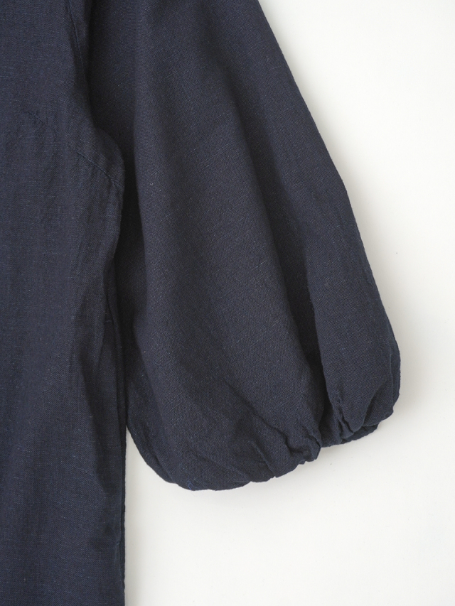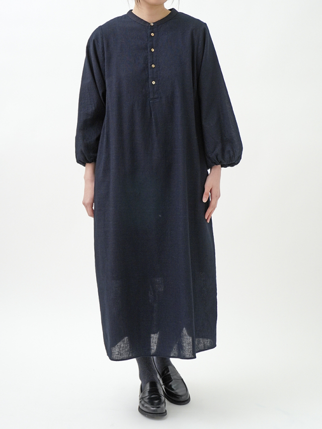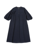 柔らかなインディゴガーゼのバルーン袖ワンピース。
