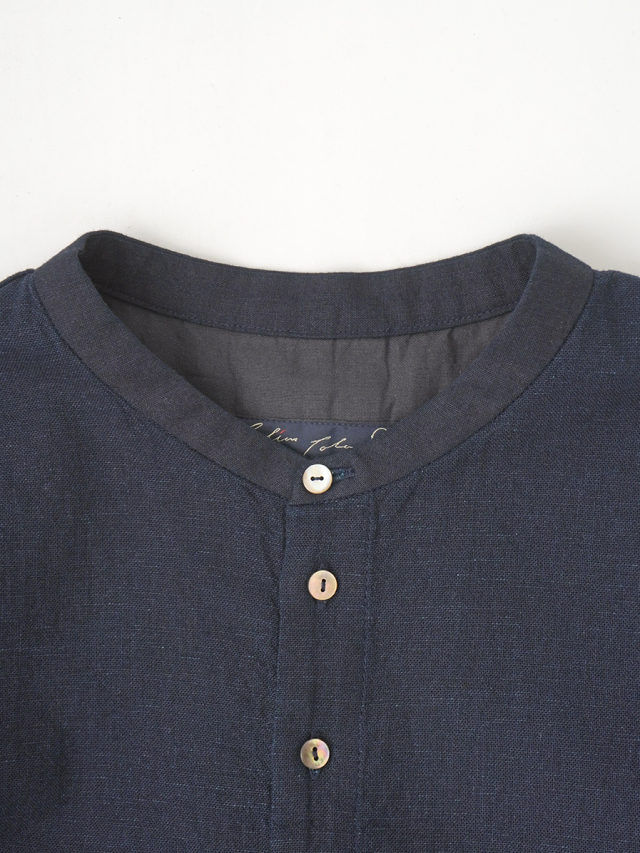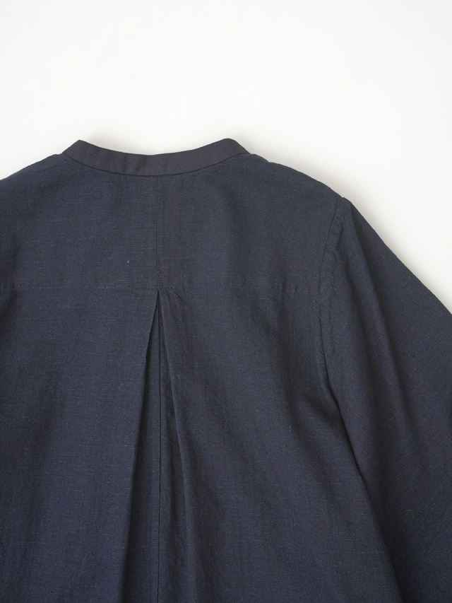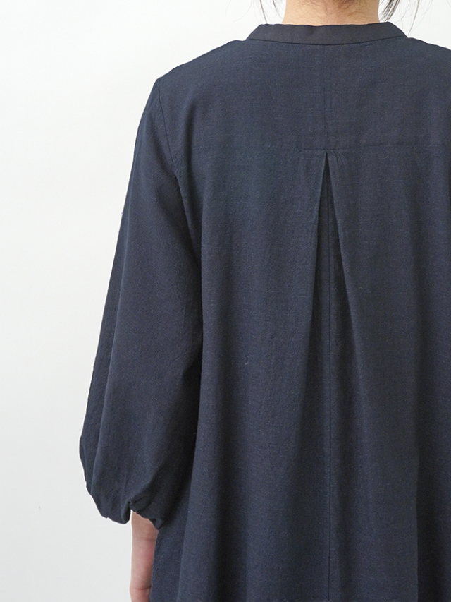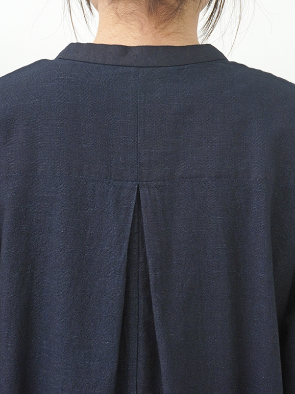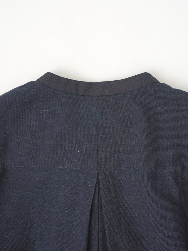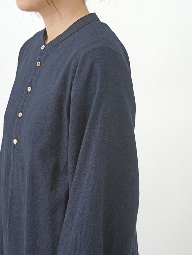 襟元に、張りのあるしっかりとした風合いのインディゴ生地を使った、素材のコントラストが楽しめるデザインです。