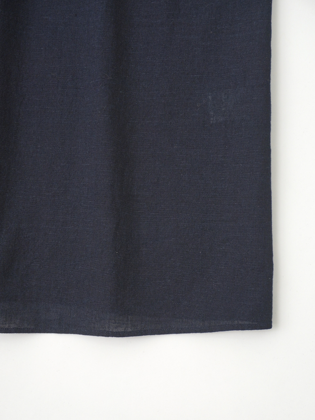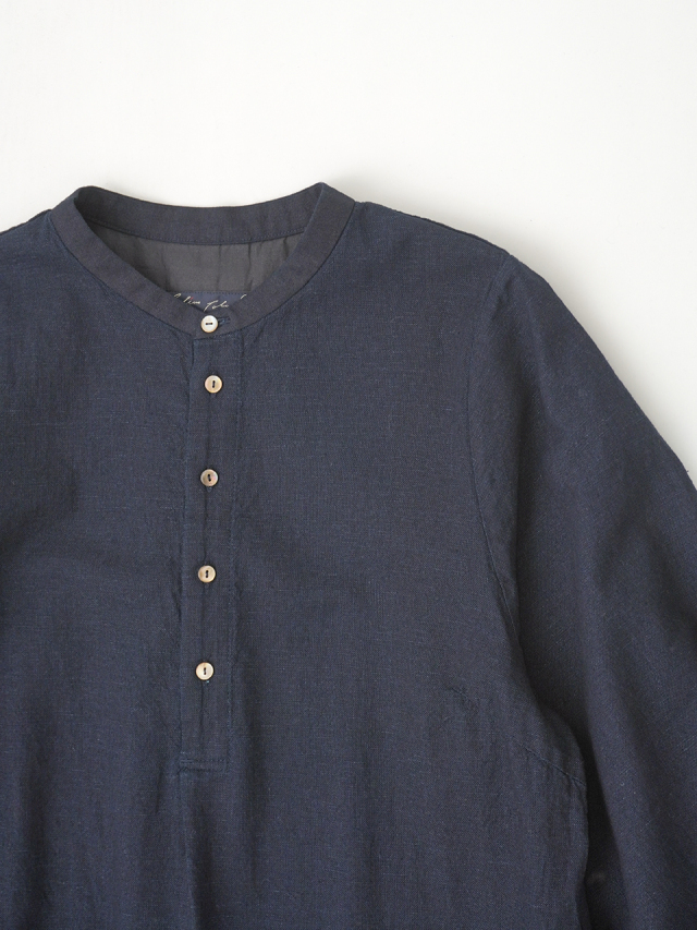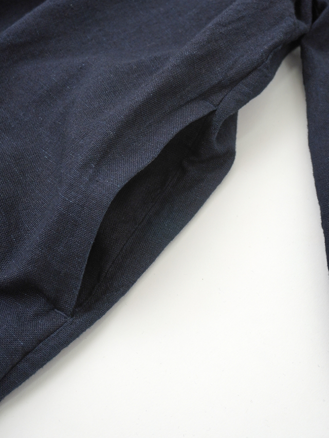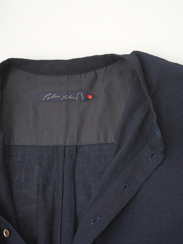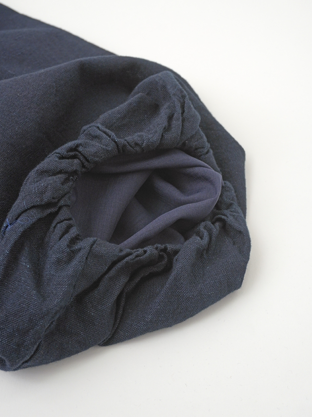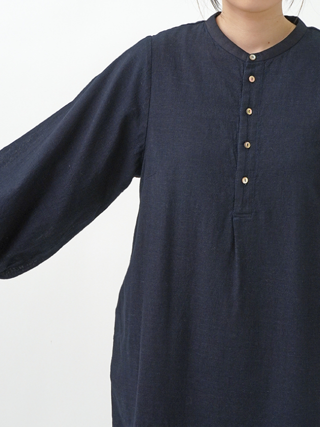 襟元に、張りのあるしっかりとした風合いのインディゴ生地を使った、素材のコントラストが楽しめるデザインです。