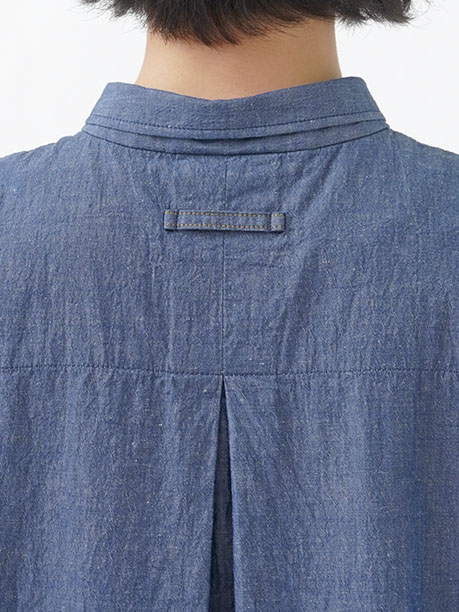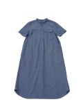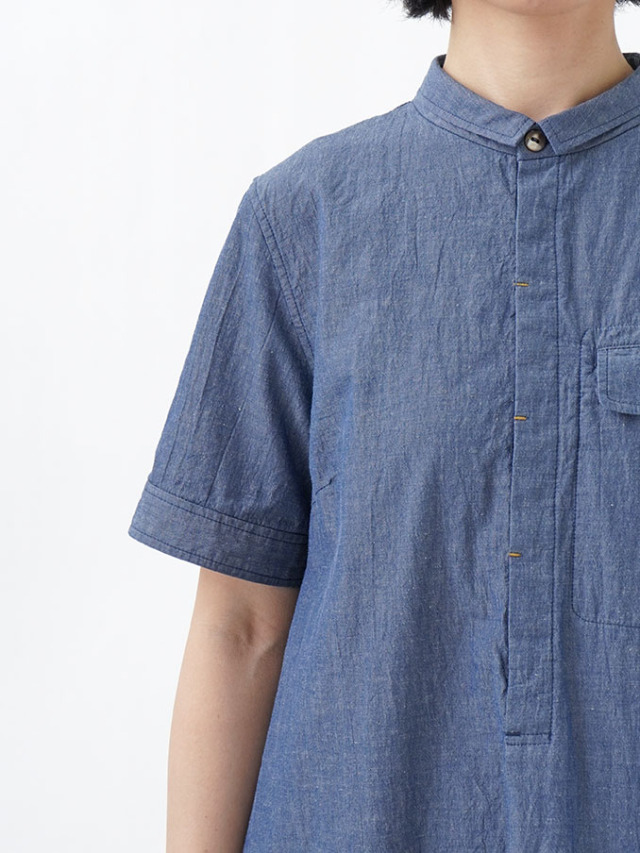 タテ糸とヨコ糸で色を変えたシャンブレー生地を、洗い加工をして、細かいシワ感のある軽やかな表情に仕立てた半袖ワンピース。