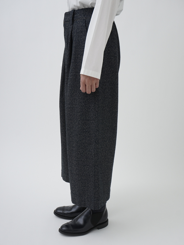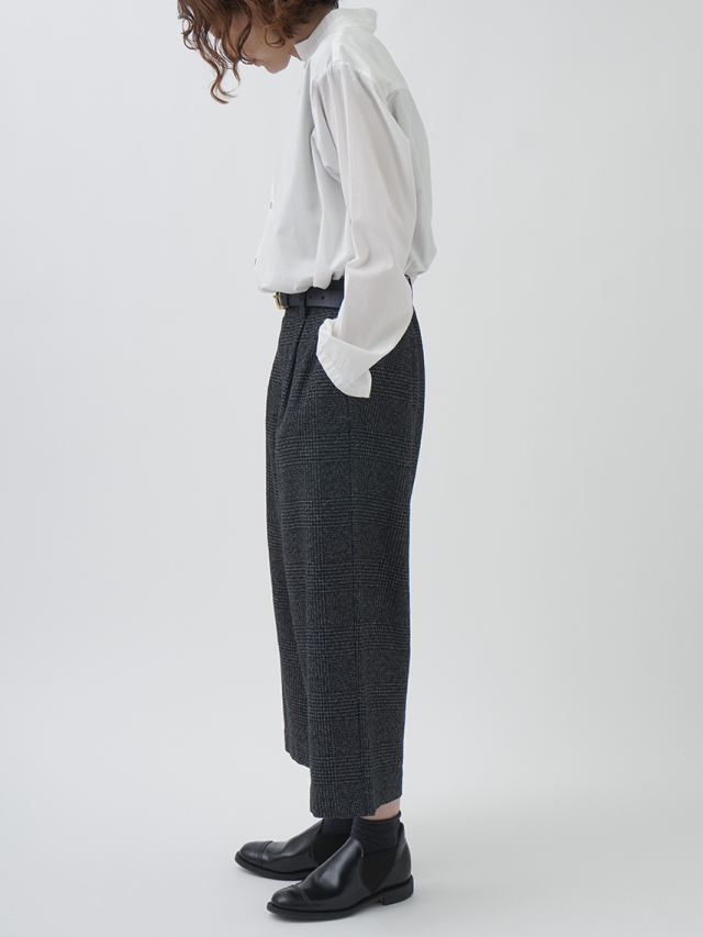 インディゴとベージュの2色でつくった杢糸を使い、ツイード風な見た目を表現したグレンチェック柄。