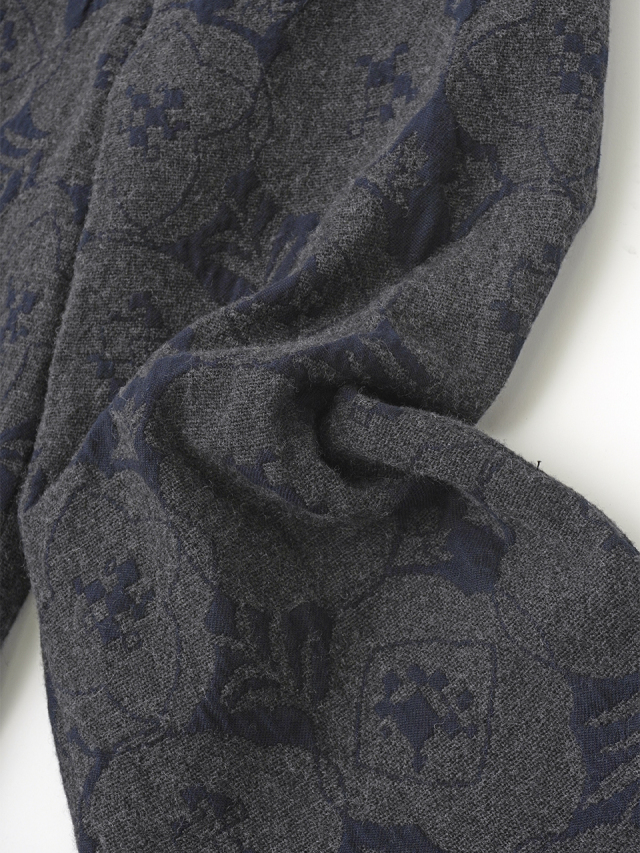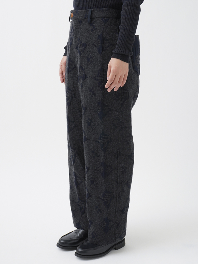 柄のネイビー部分に綿、グレー部分にウールを使用し、表と裏で柄が反転する織り方を活かして、後ろポケットの裏使いをポイントにしました。