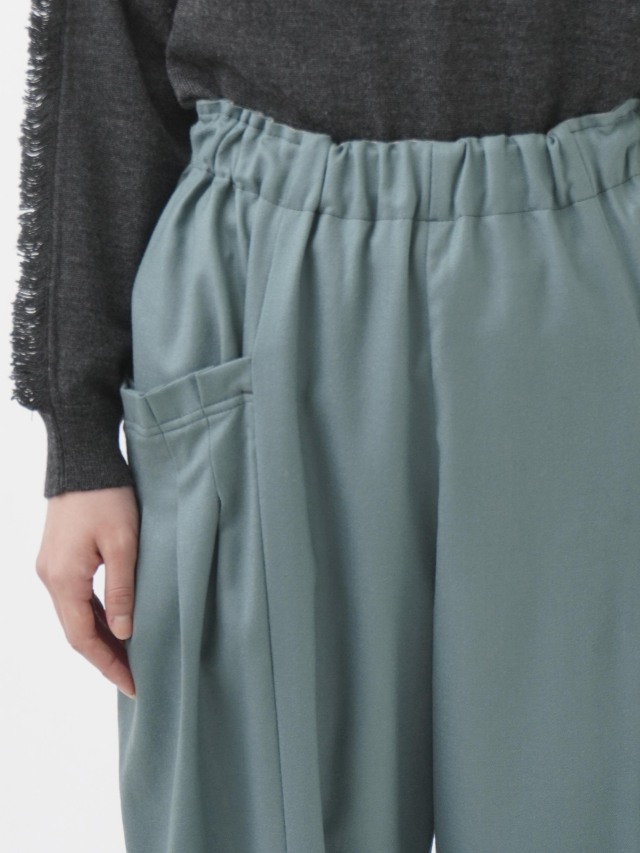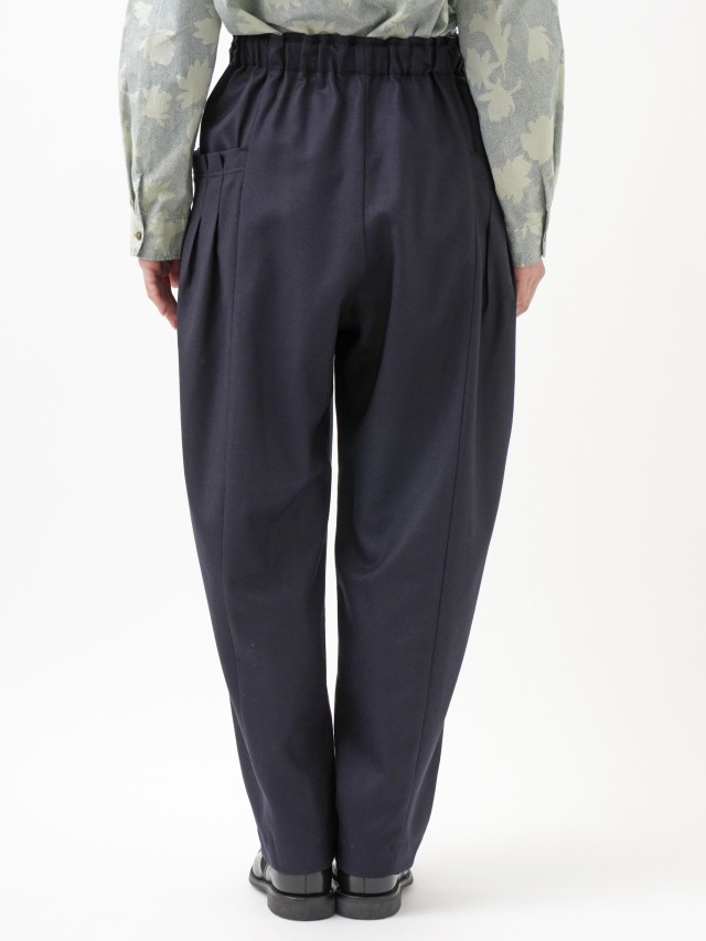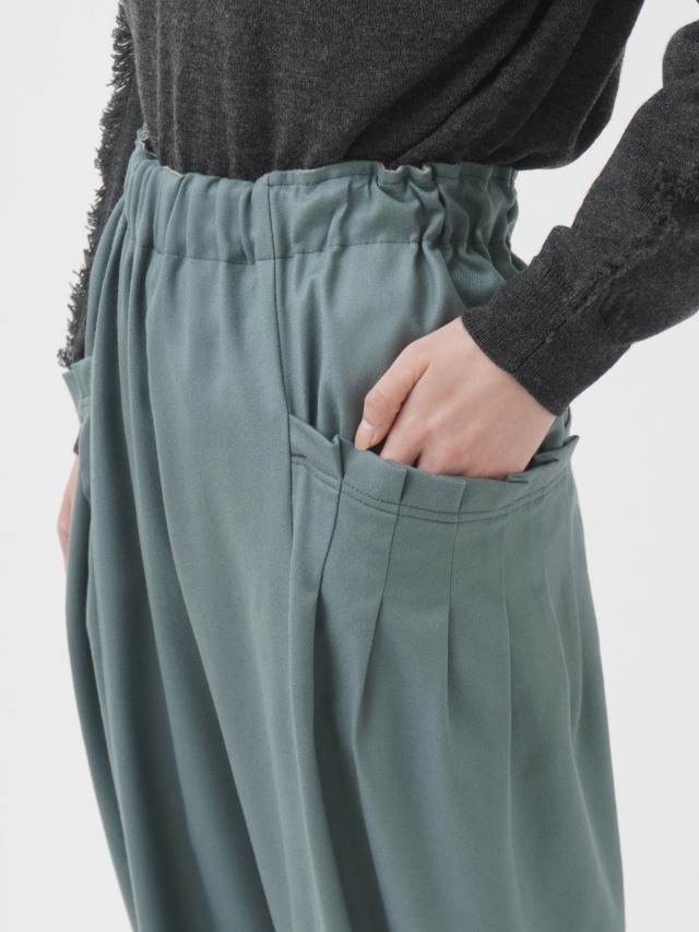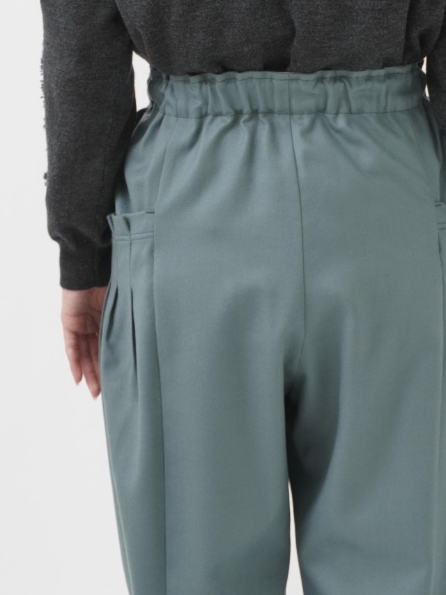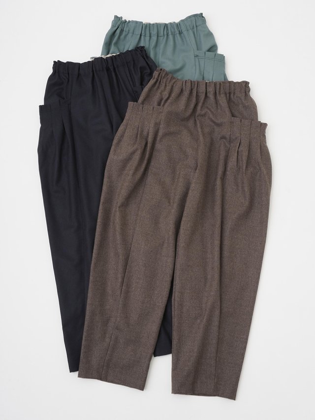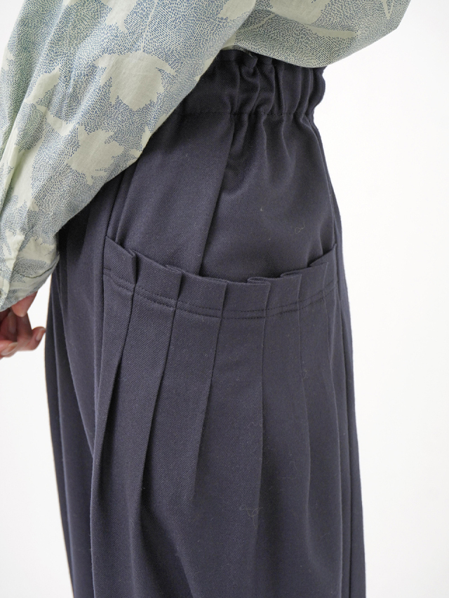 ウエストのギャザーと、ポケットのタックでゆとりを持たせながらも、裾に向かって細くなるテーパードラインがきれいなシルエット。