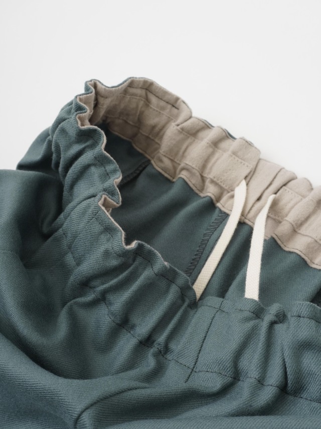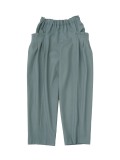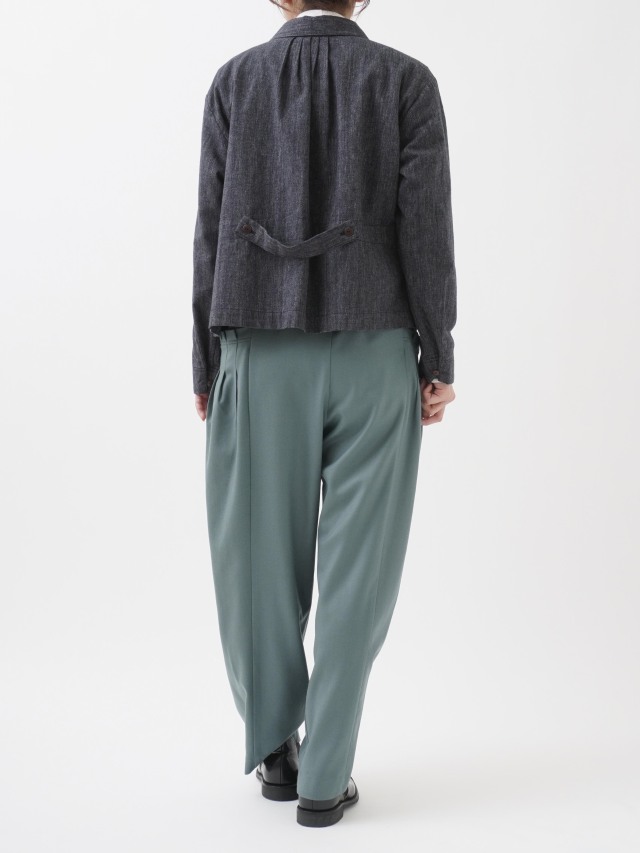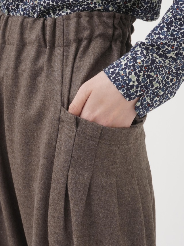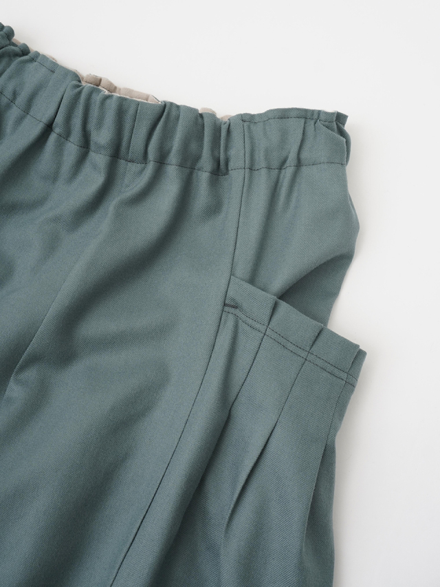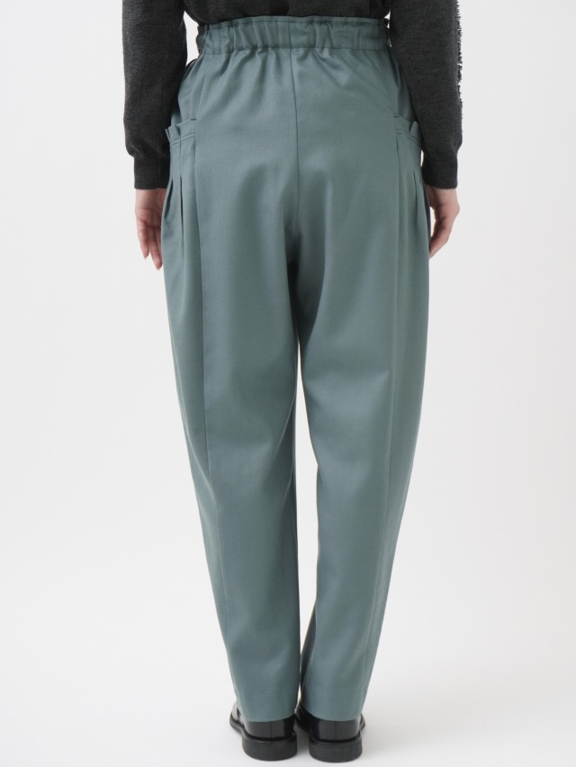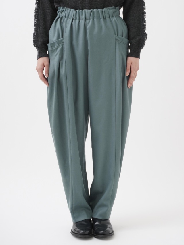 ウエストのギャザーと、ポケットのタックでゆとりを持たせながらも、裾に向かって細くなるテーパードラインがきれいなシルエット。