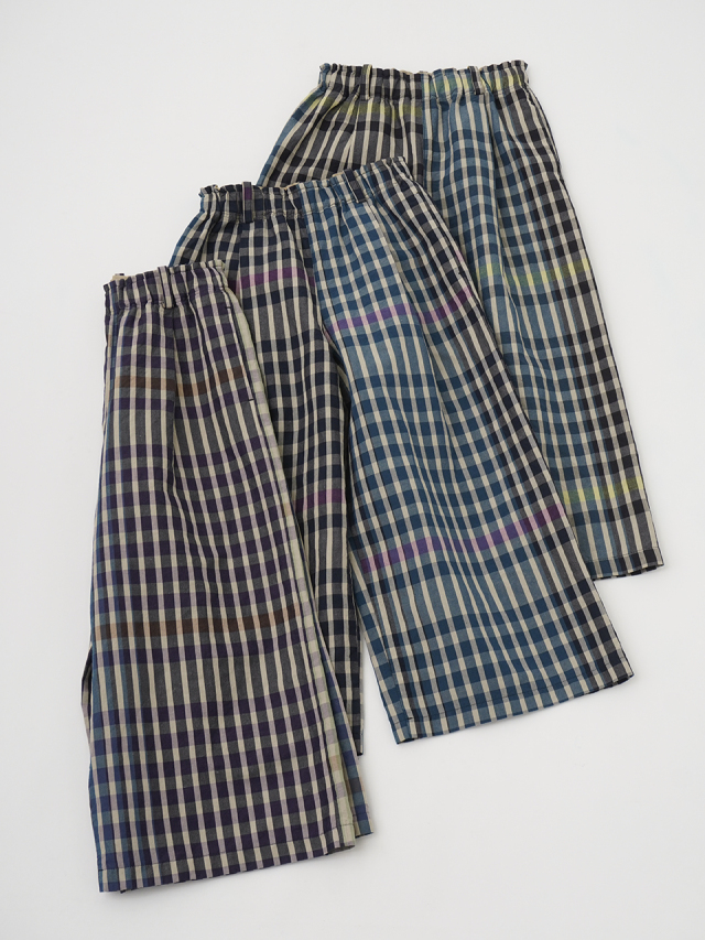 タテ糸の色は、3色展開同じ色を使用し、ヨコ糸の色を変えることで色展開を作った、オリジナルテキスタイルならではのデザインです。
