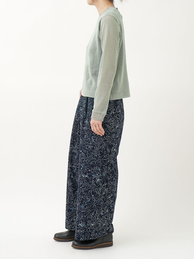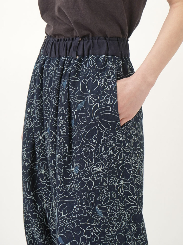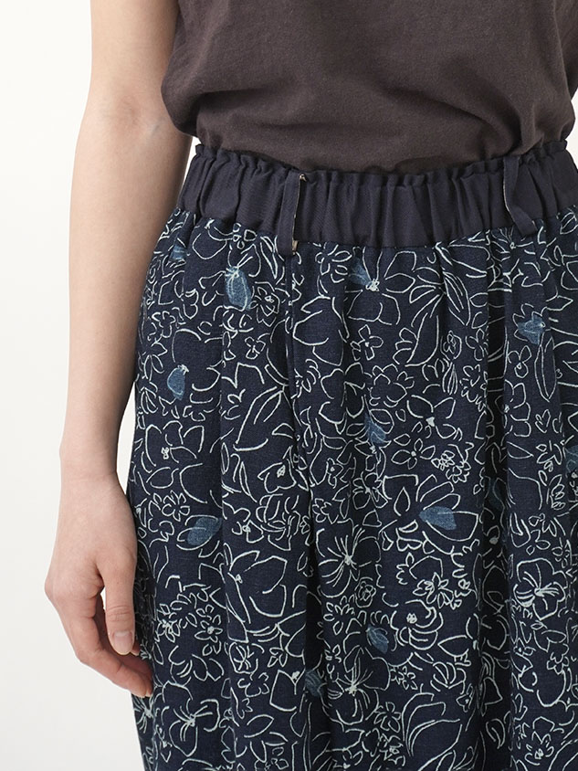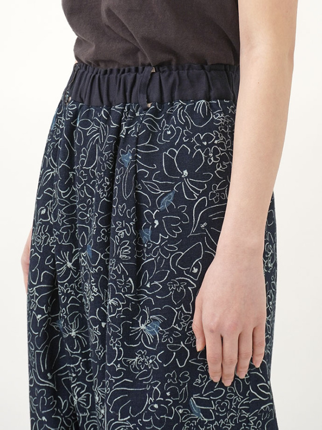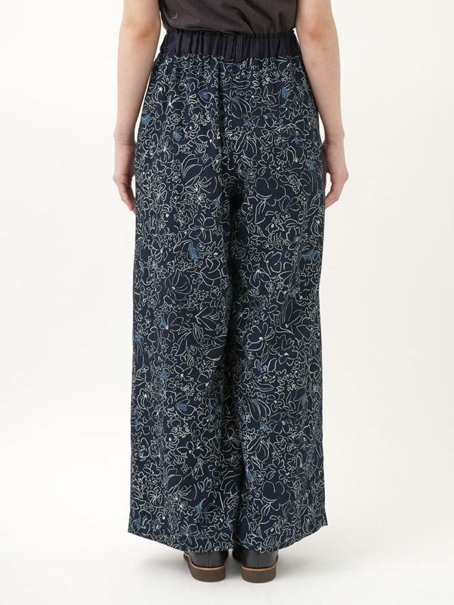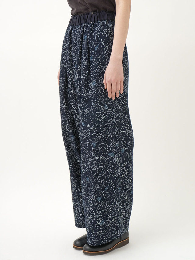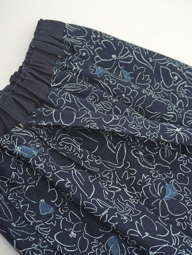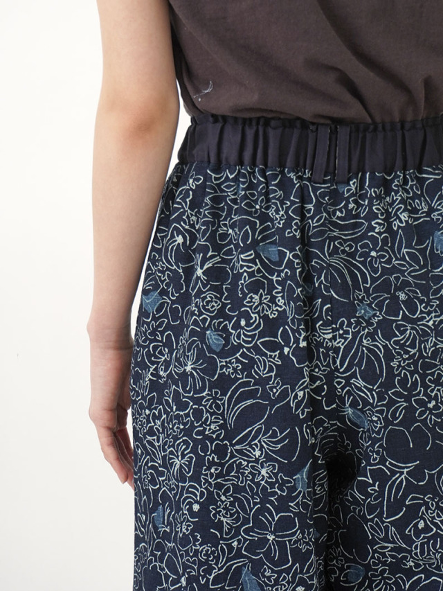 柔らかく軽やかなインディゴガーゼに、つぎつぎと蕾が花ひらく様子を抜染で表現したパンツ。