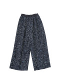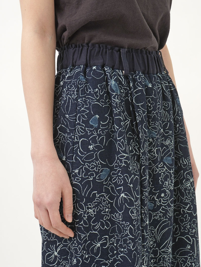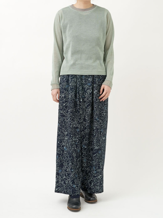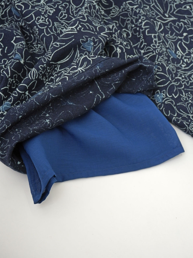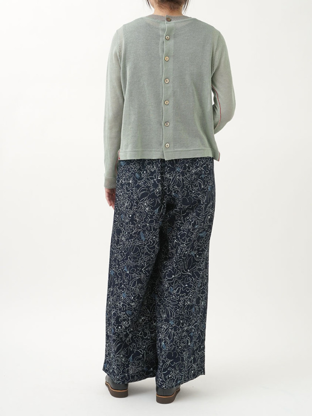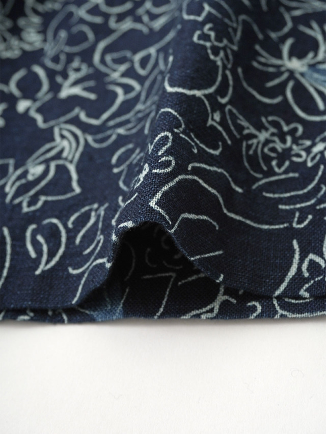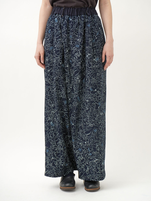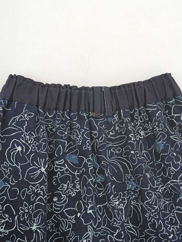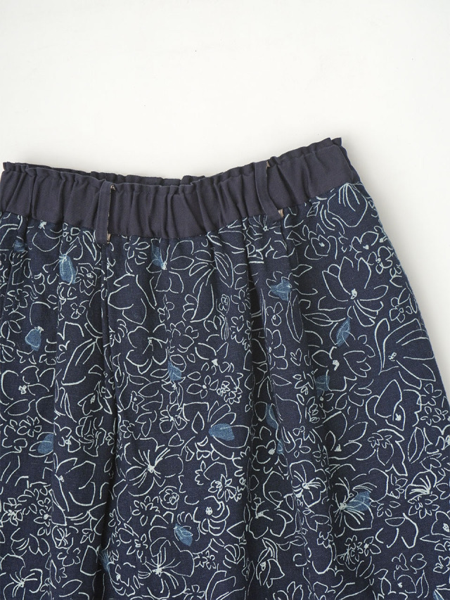 柔らかく軽やかなインディゴガーゼに、つぎつぎと蕾が花ひらく様子を抜染で表現したパンツ。