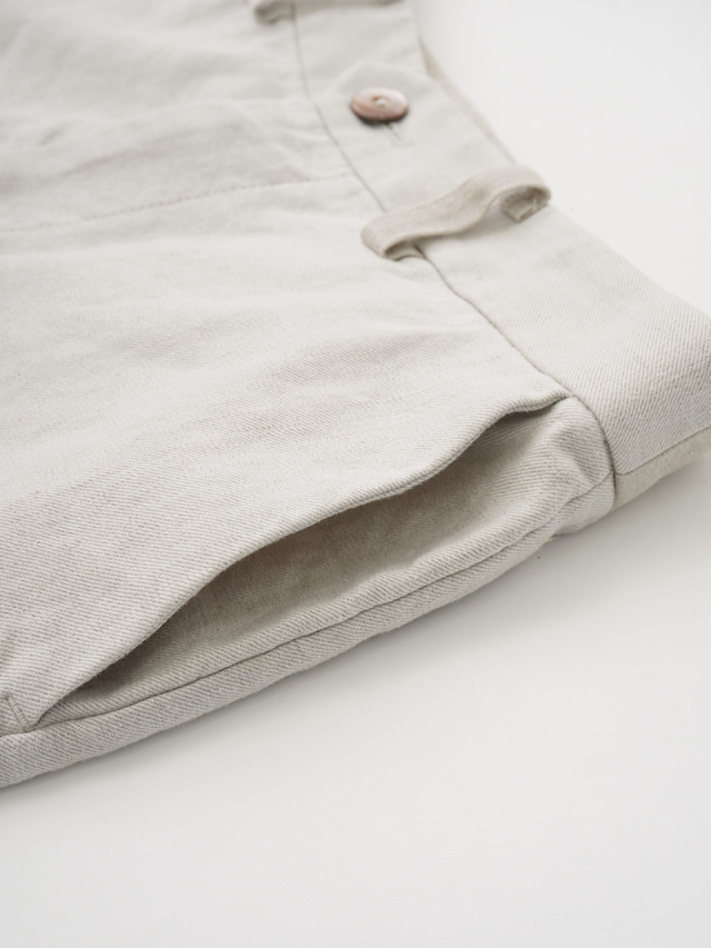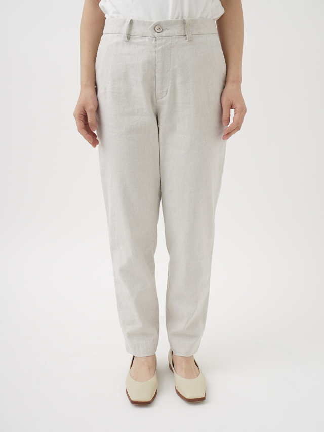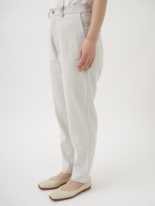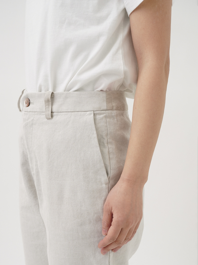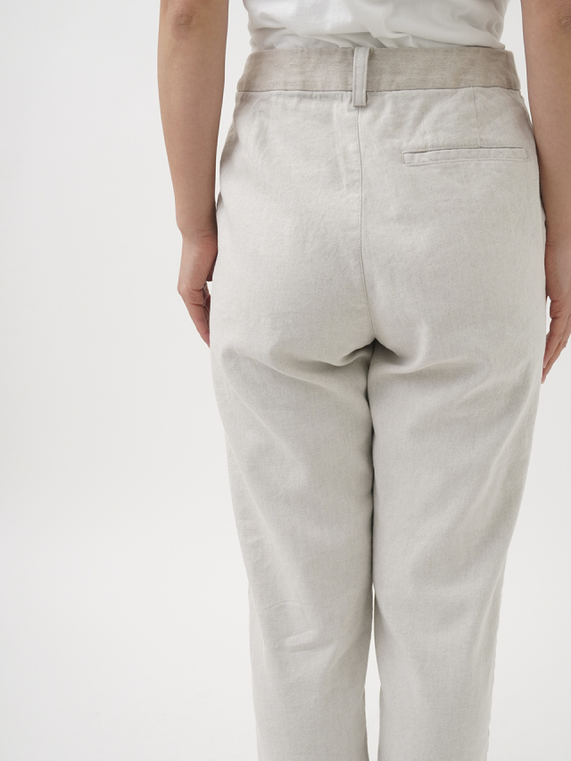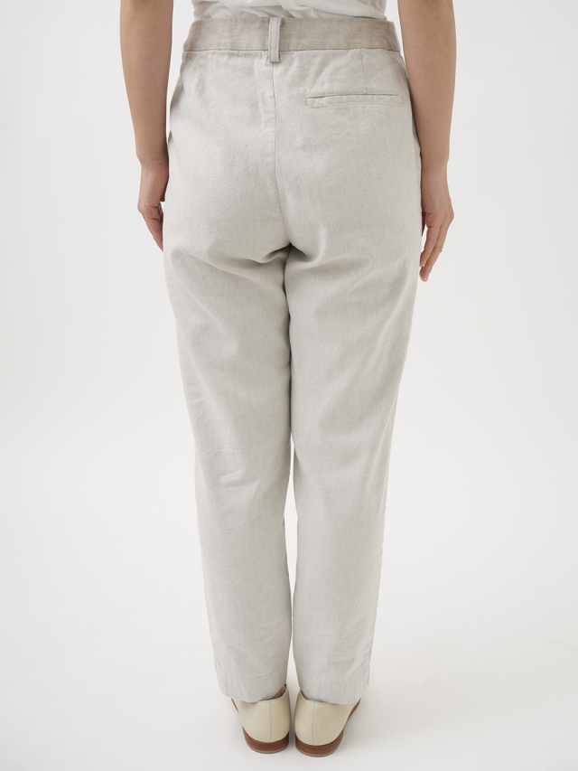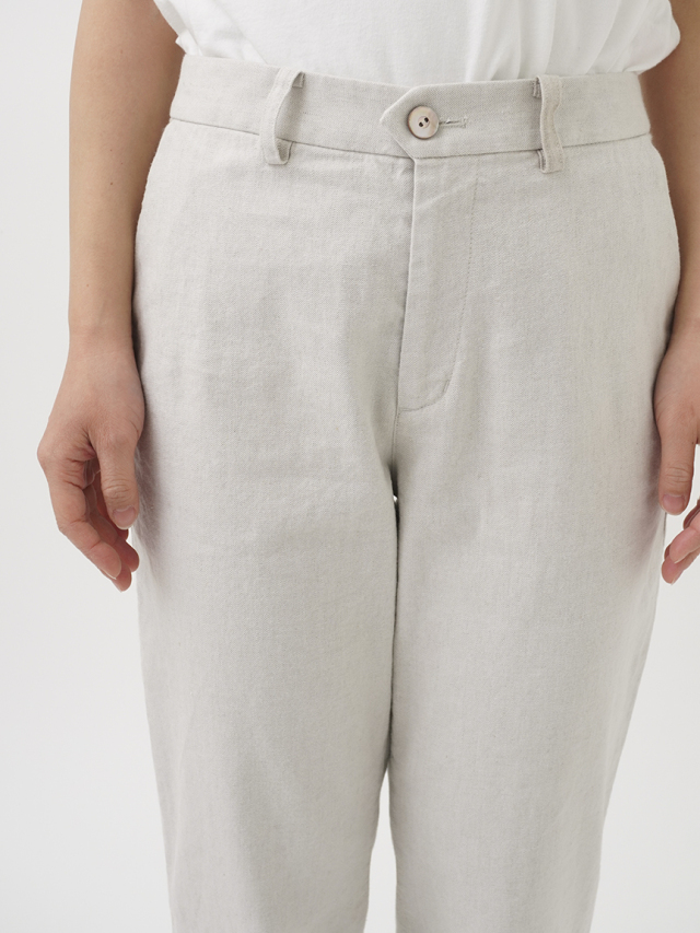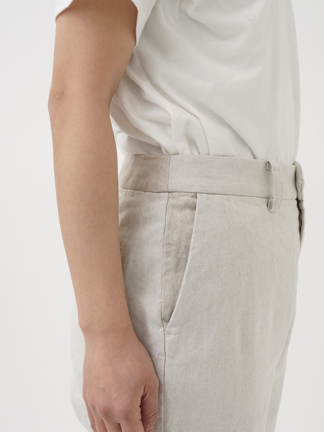 タテ糸にリネン、ヨコ糸にコットンの糸を使用し、高密度に織った、しなやかさと張り感のバランスが良い生地のパンツ。