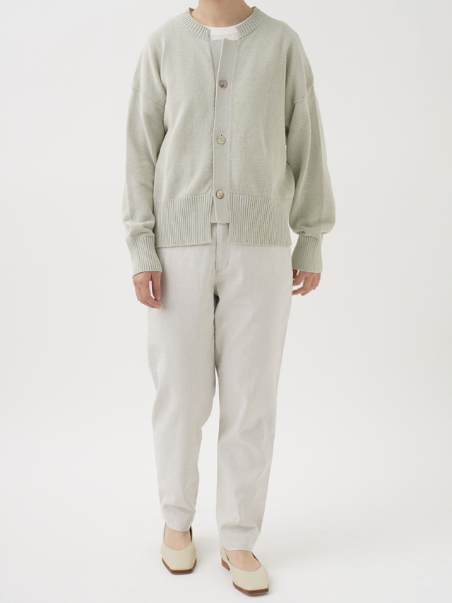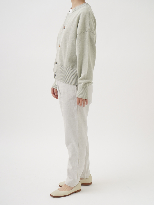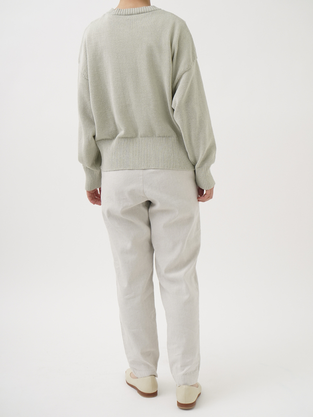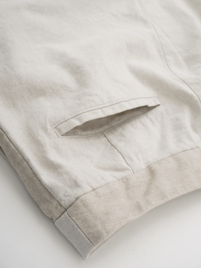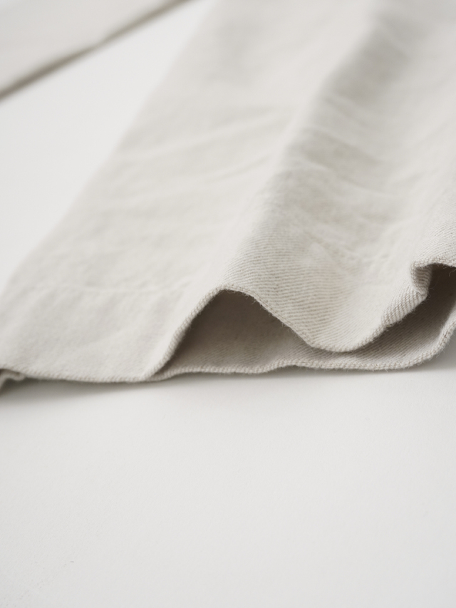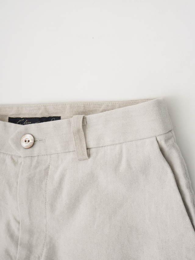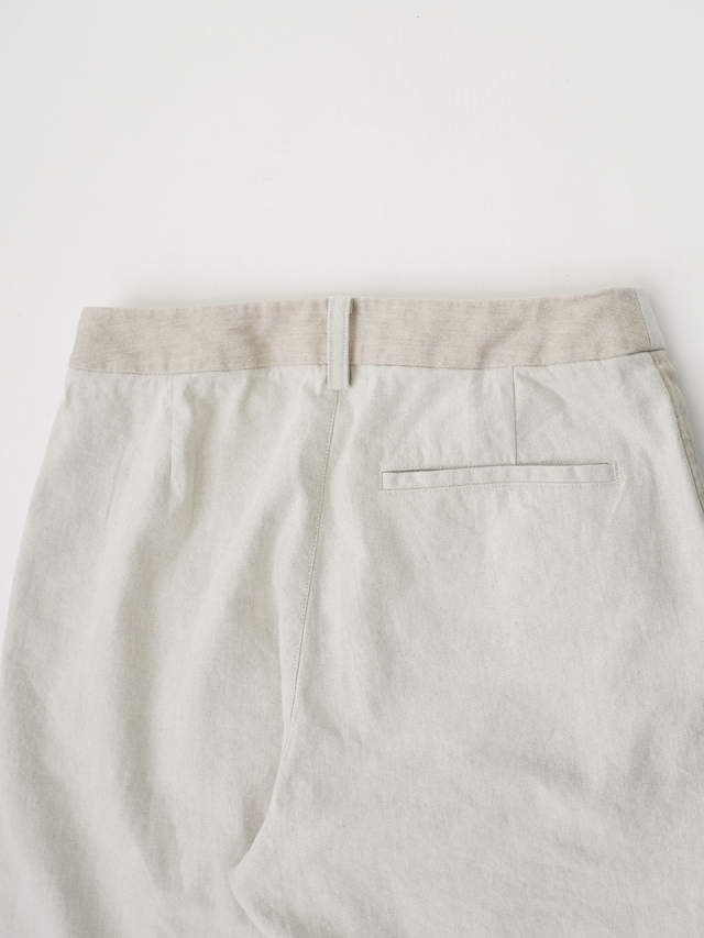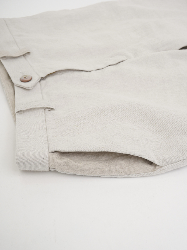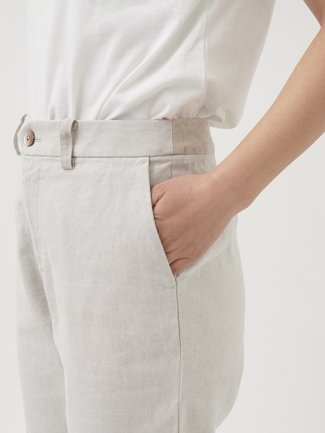 タテ糸にリネン、ヨコ糸にコットンの糸を使用し、高密度に織った、しなやかさと張り感のバランスが良い生地のパンツ。