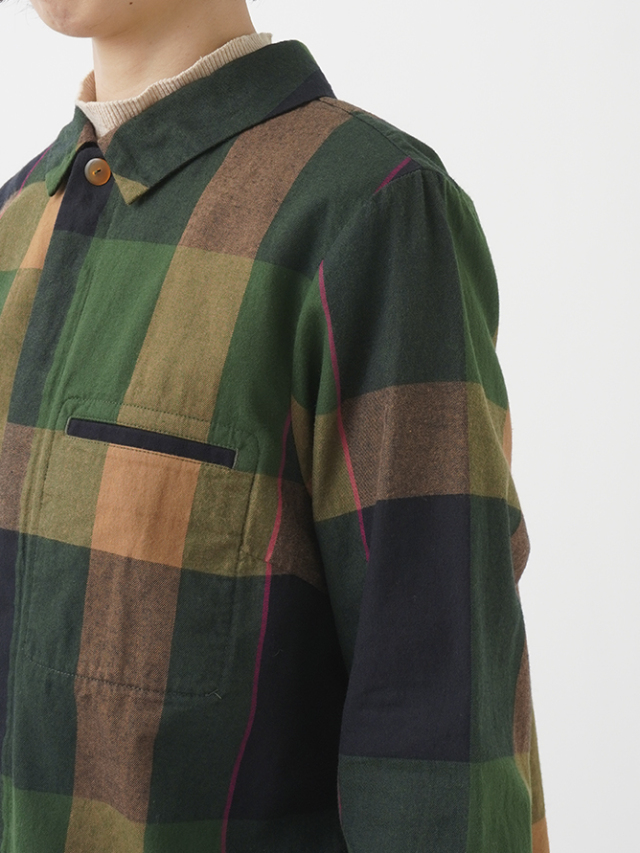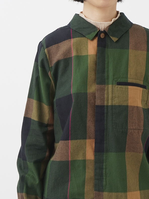 ボリュームのあるボトムやスカートにバランスよく合わせやすい、すっきりとした着丈のワークシャツです。