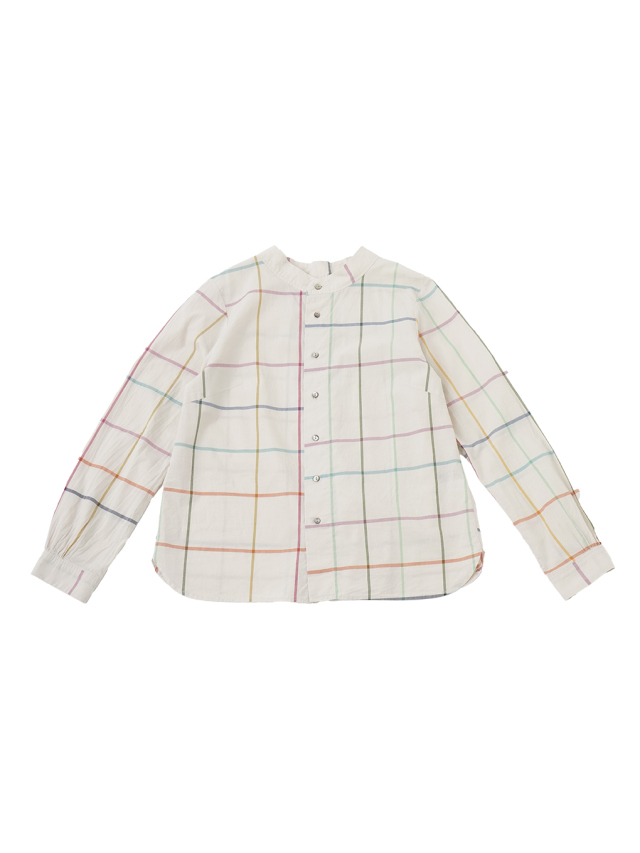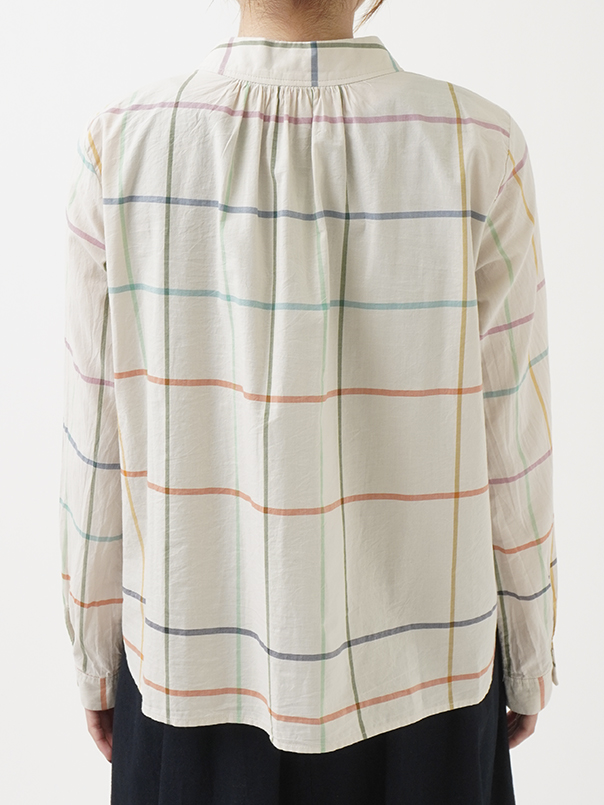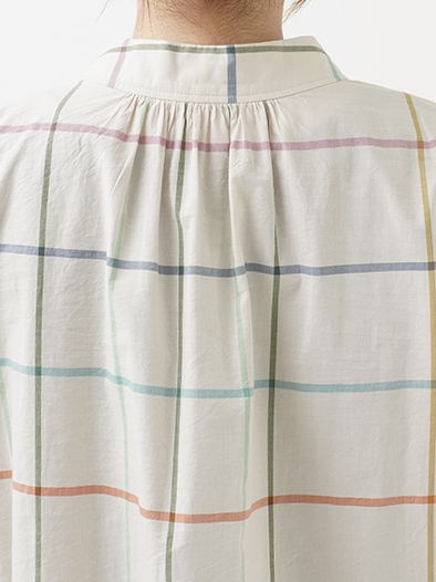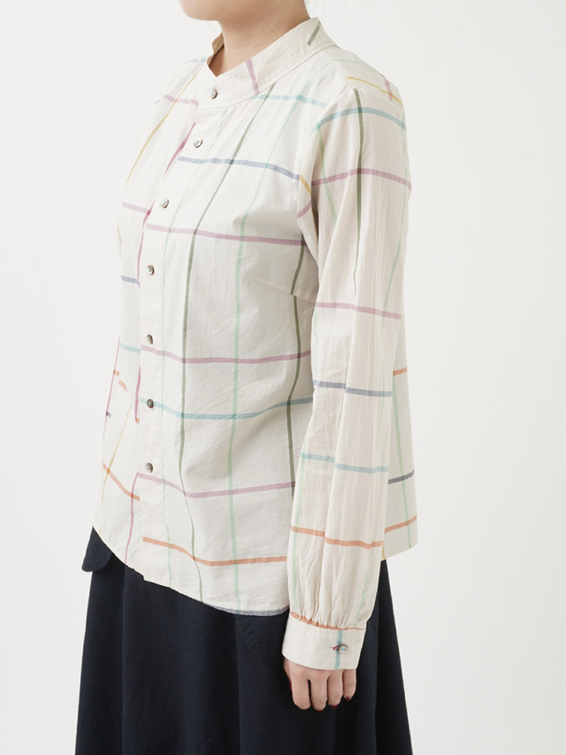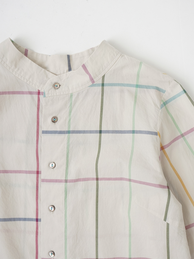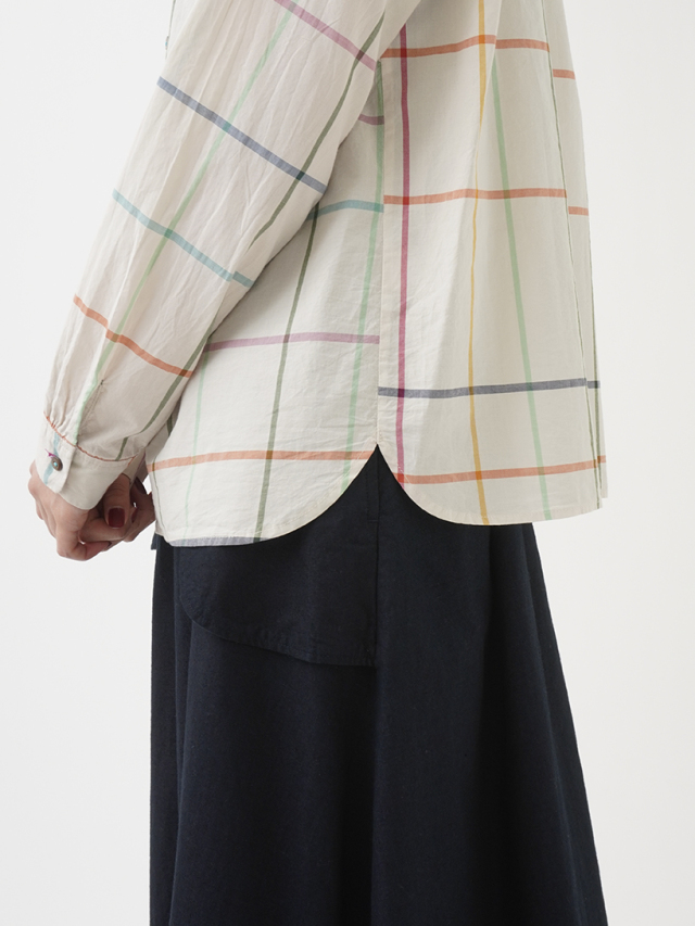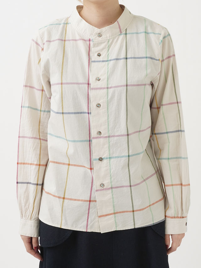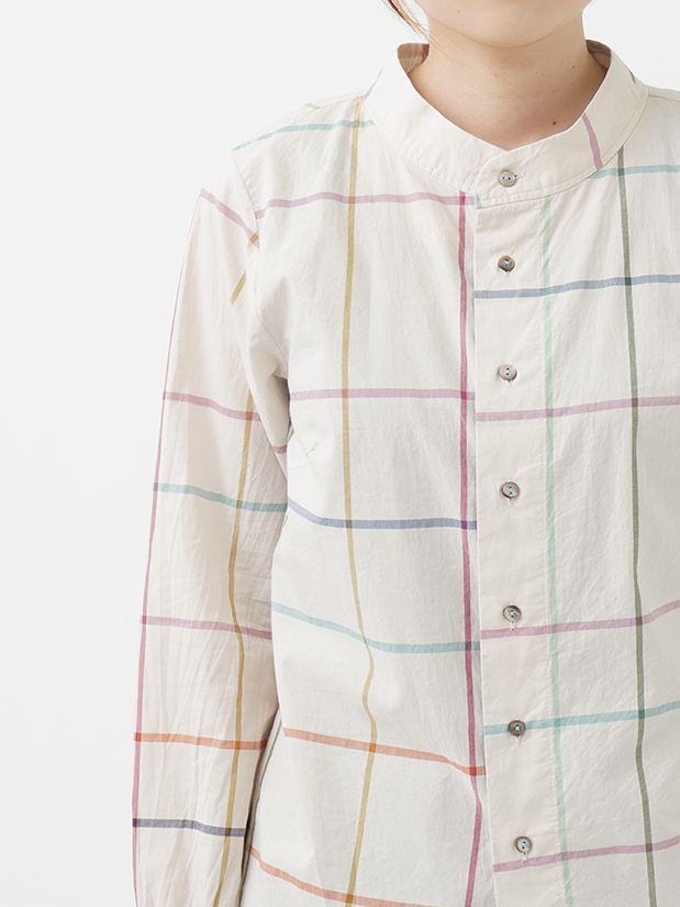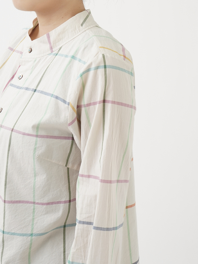 冬の季語「冴ゆ」を12色の糸を使って表現したペンチェック柄のオフスタンド襟シャツ。