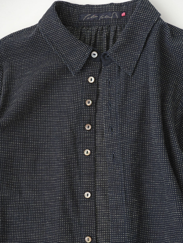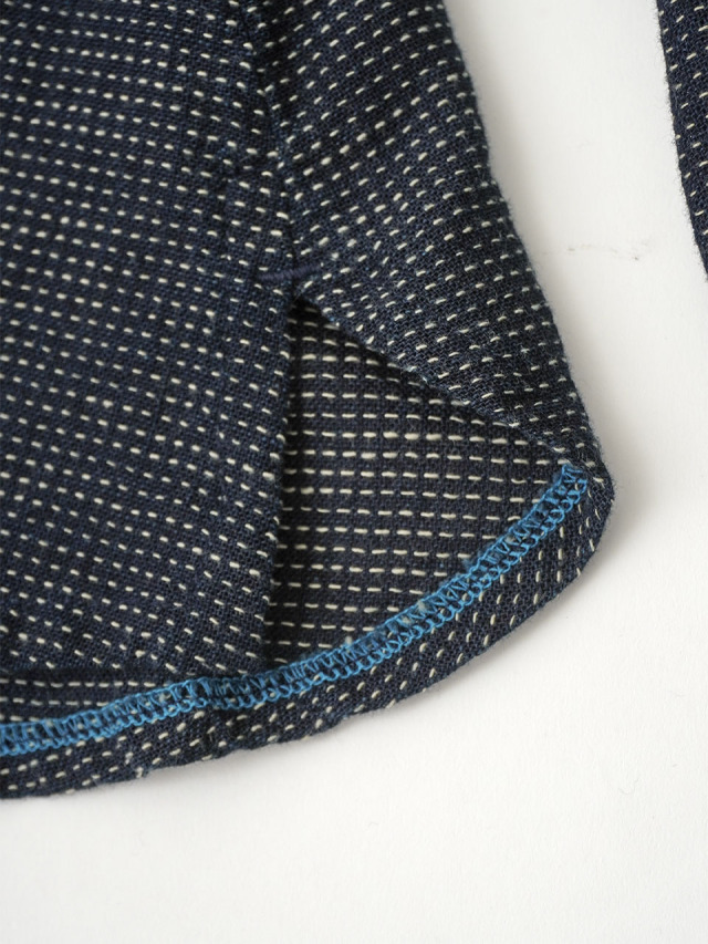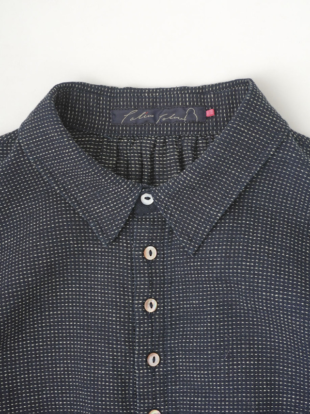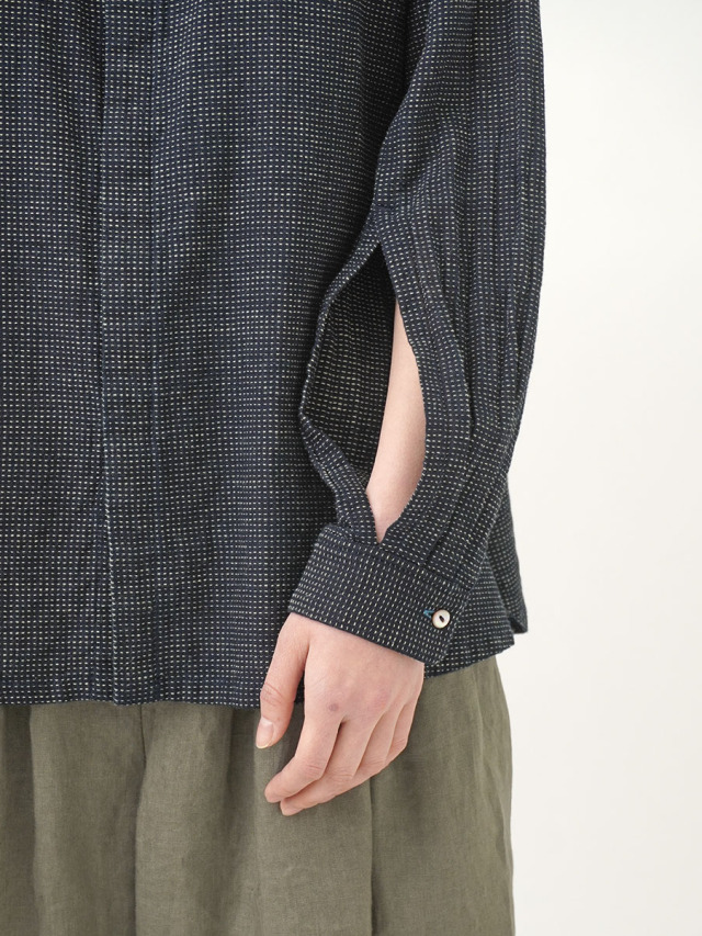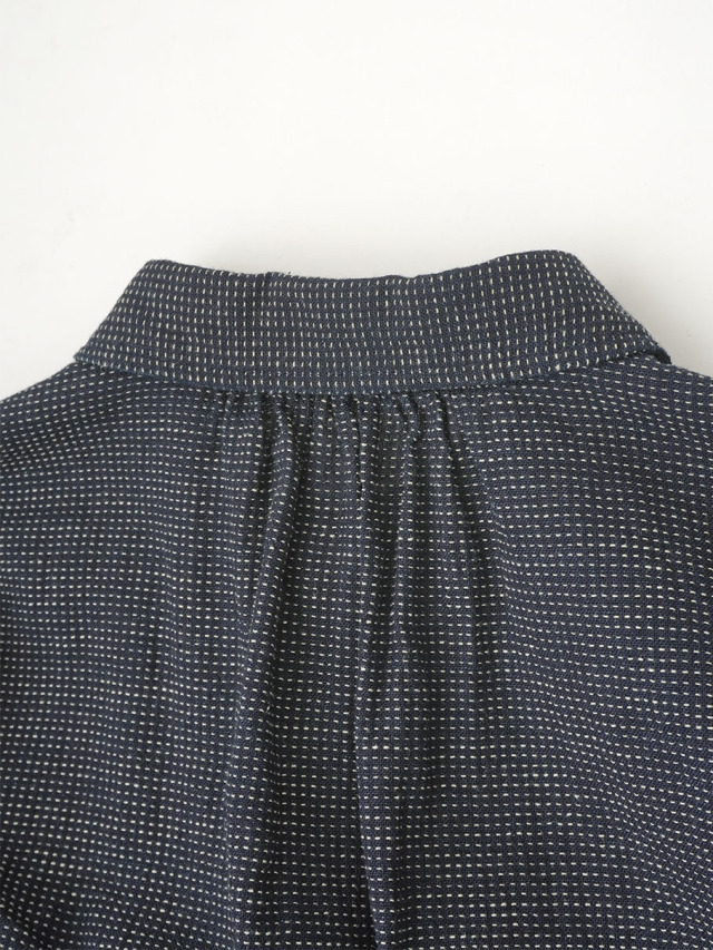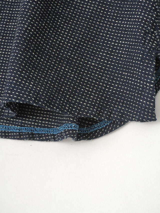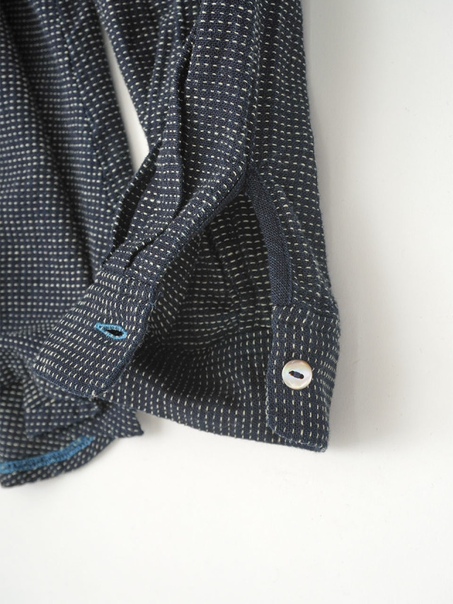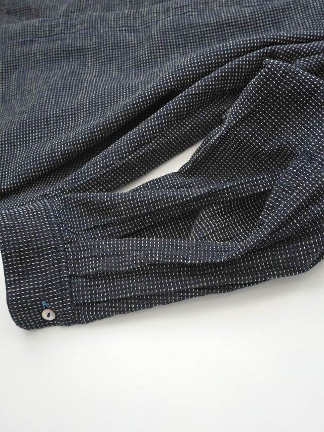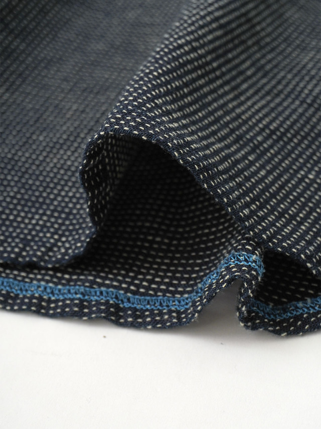 軽やかなインディゴガーゼに、ハケ目という織りの技法でヨコ糸を飛ばし、点描画のような表現をした生地。
