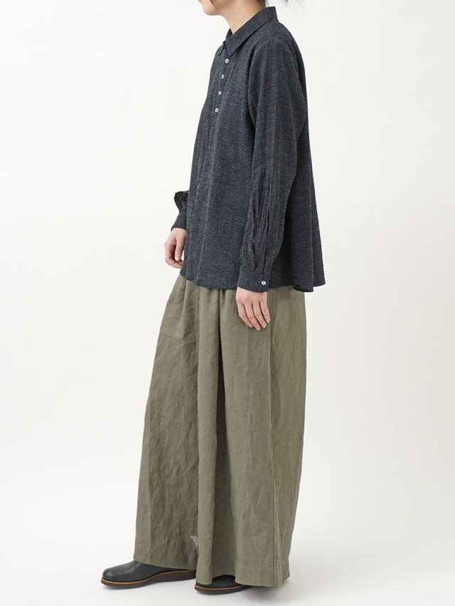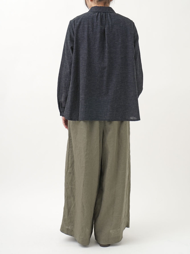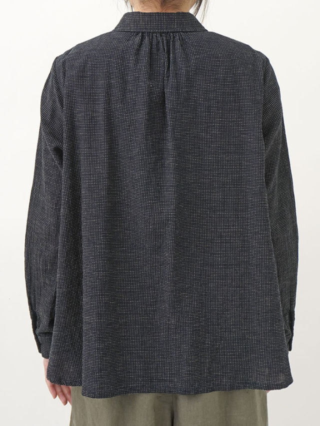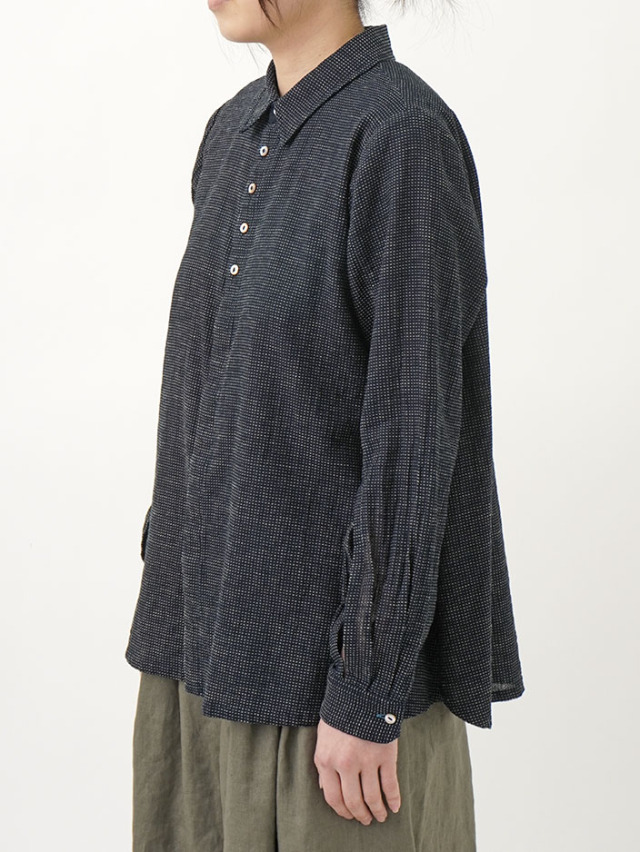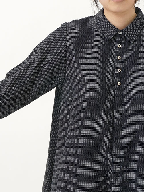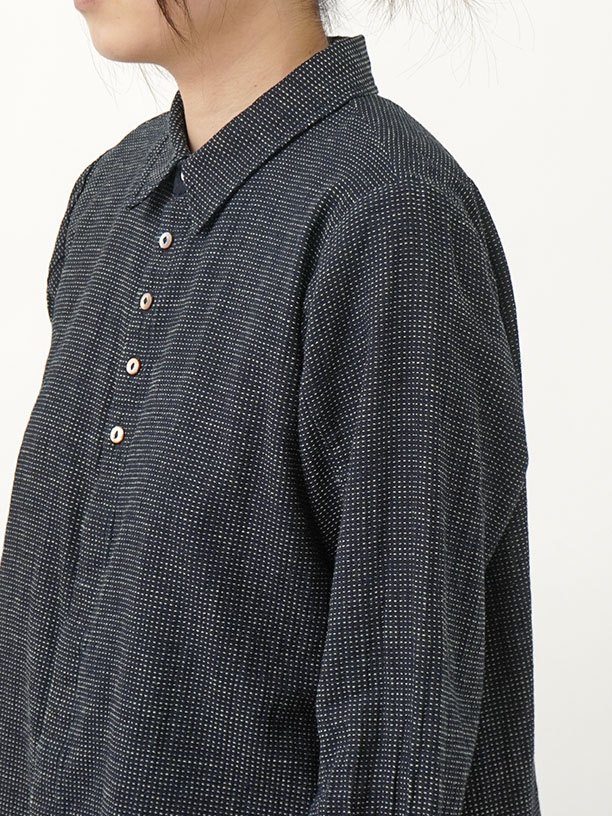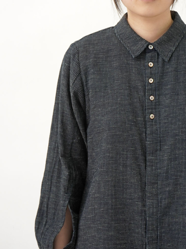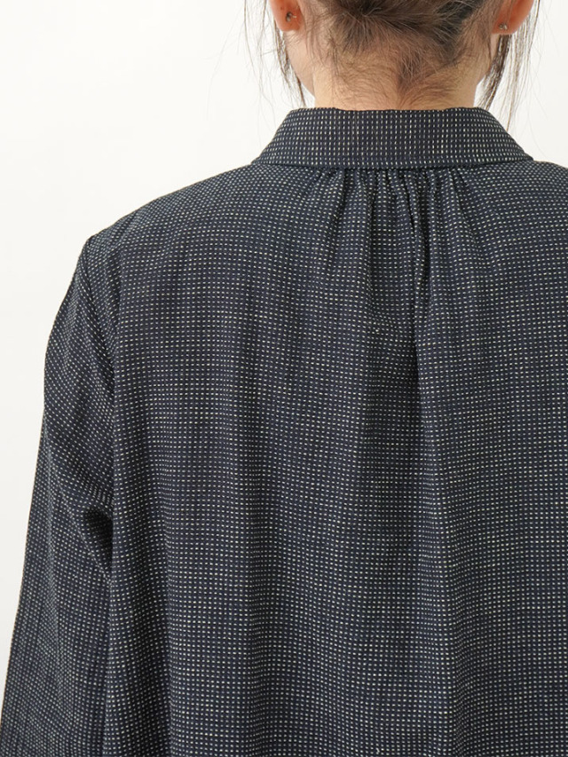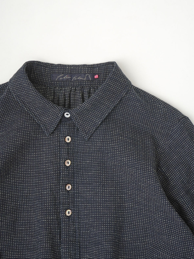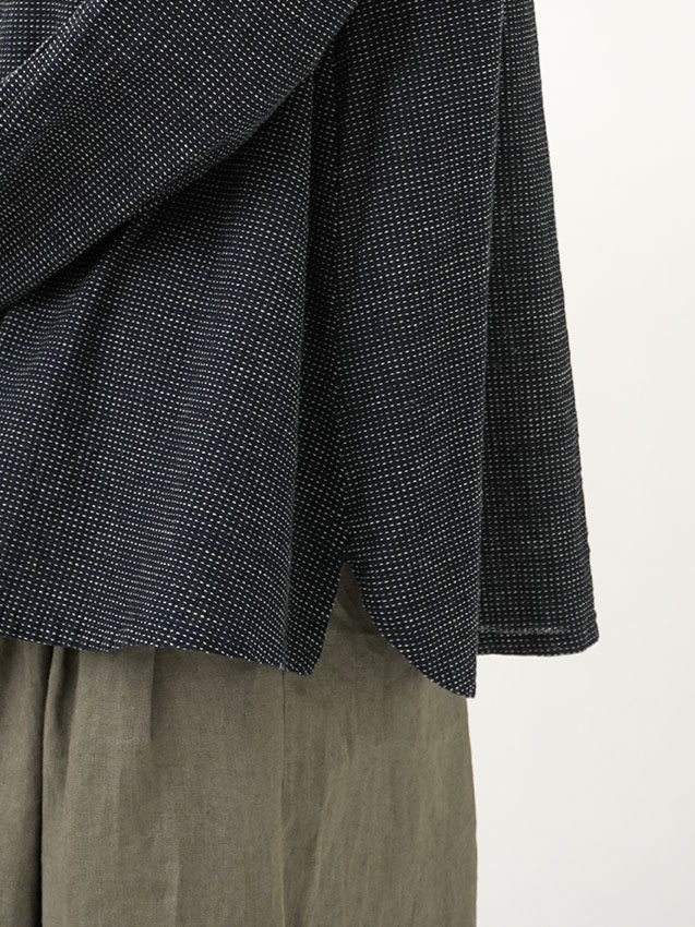 軽やかなインディゴガーゼに、ハケ目という織りの技法でヨコ糸を飛ばし、点描画のような表現をした生地。