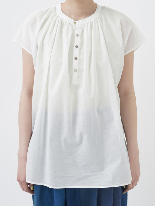 透け感のある柔らかなローンのギャザーフレンチ袖シャツ。