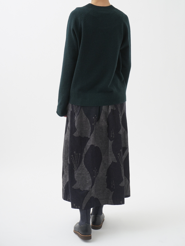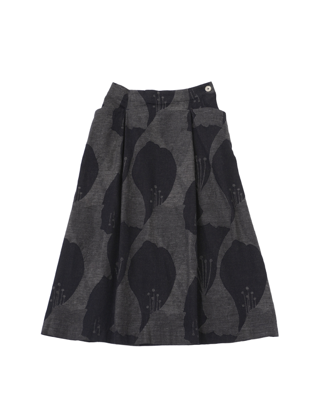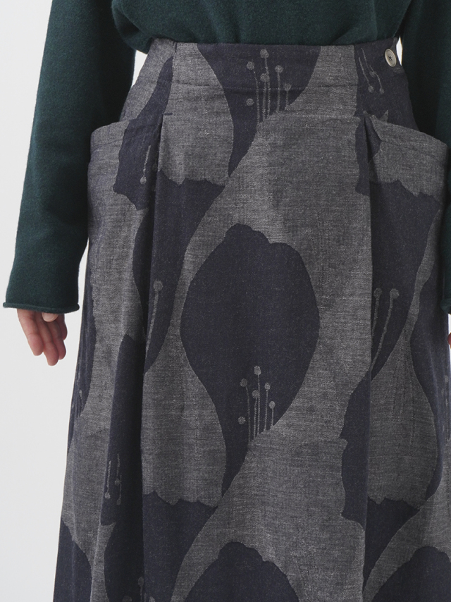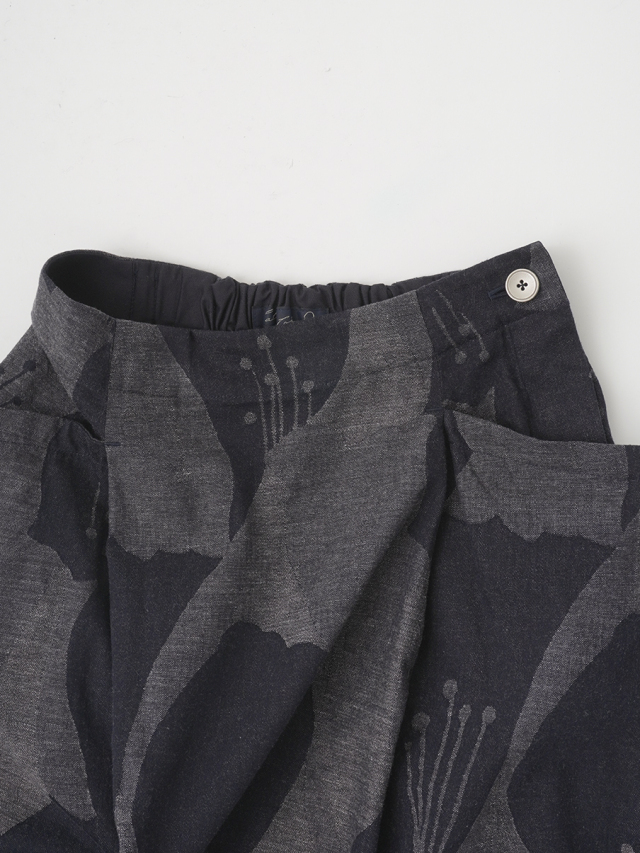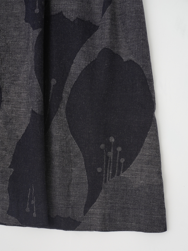 タテ糸にネイビーのラフィ綿染糸、ヨコ糸にブラウンのラフィウール糸を贅沢に使用し、ジャガード織りでケイトウの花を表現しました。