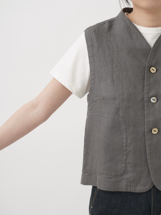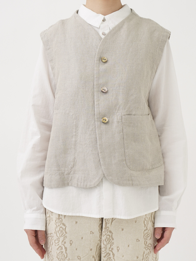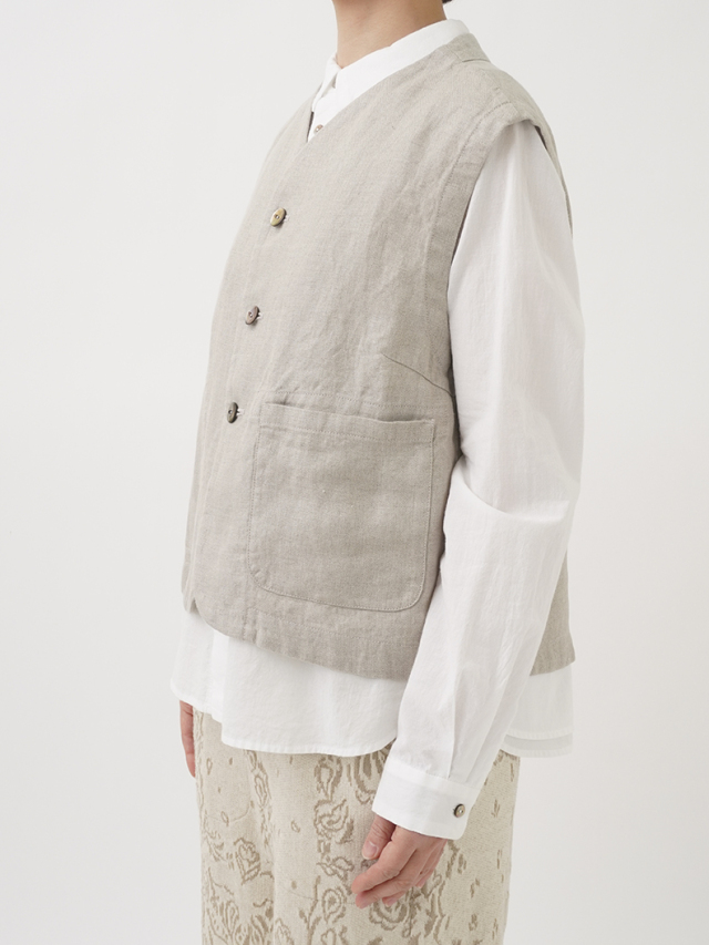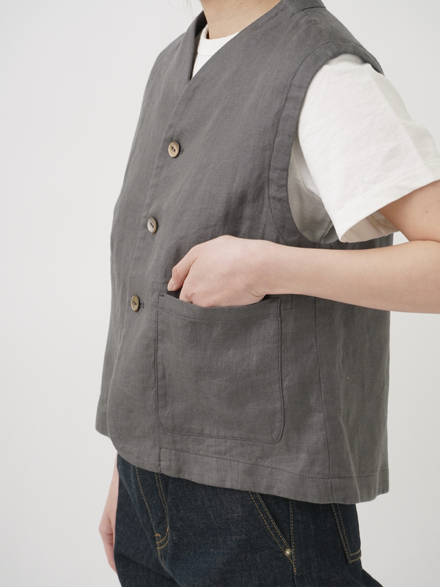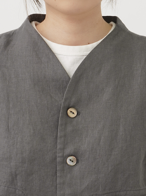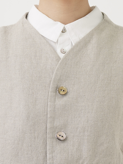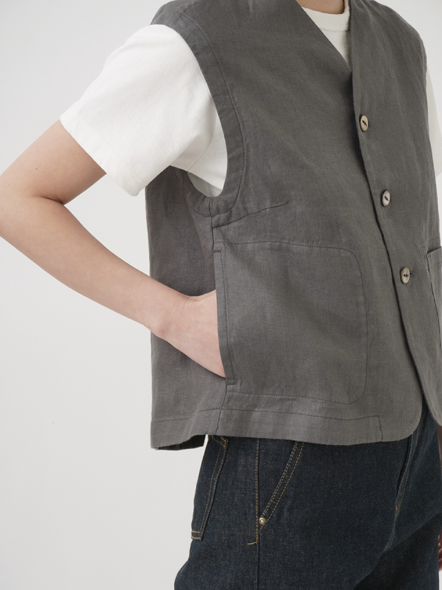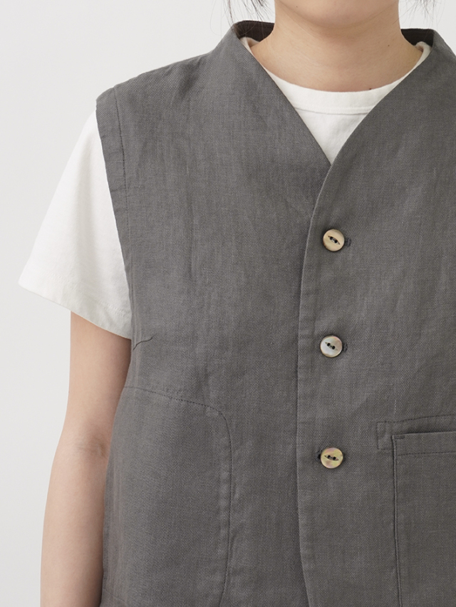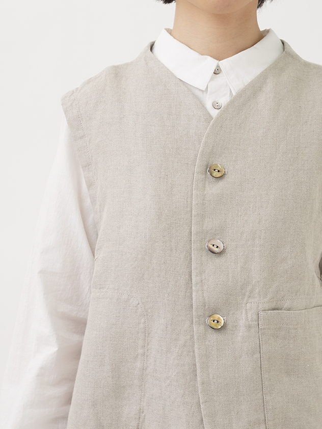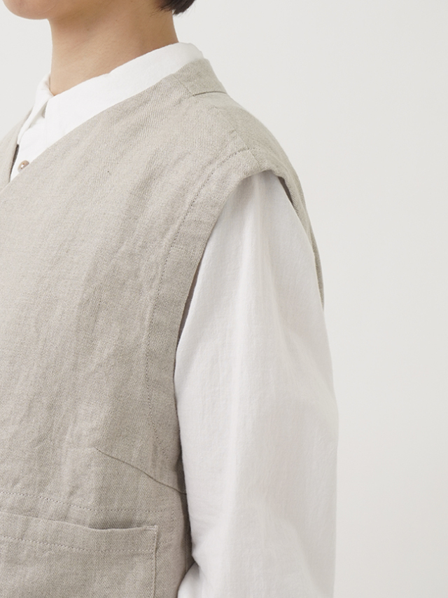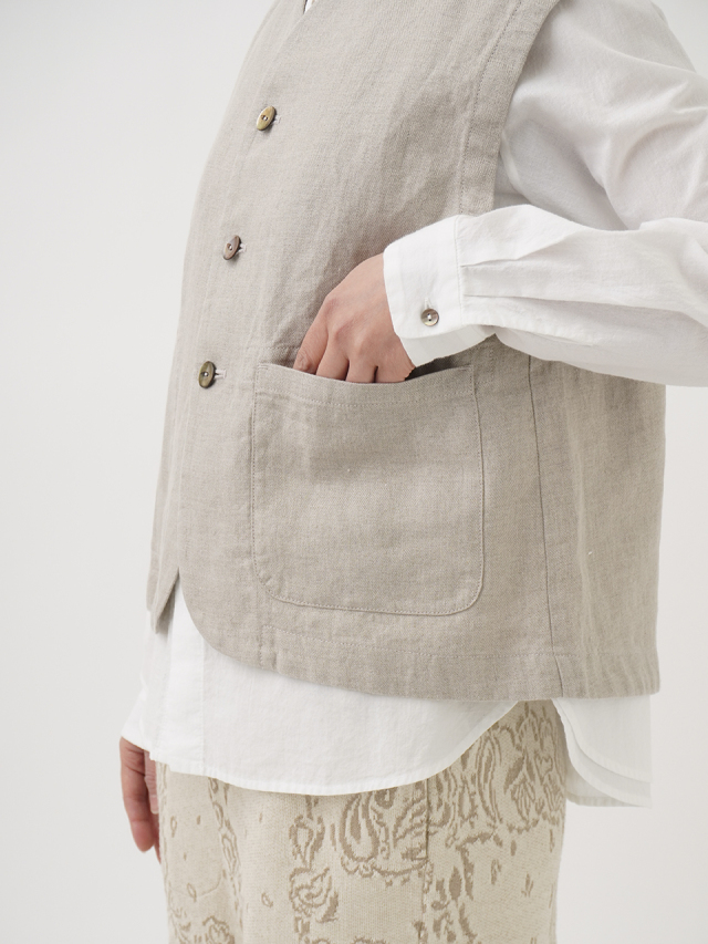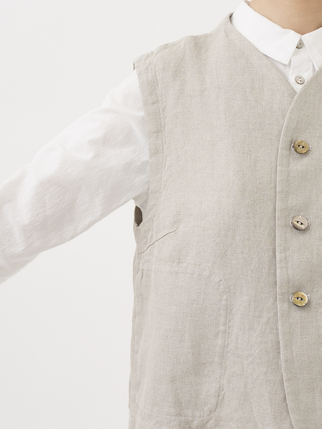 ナチュラルな光沢がある、さらりとした風合いのリネンツイルベスト。