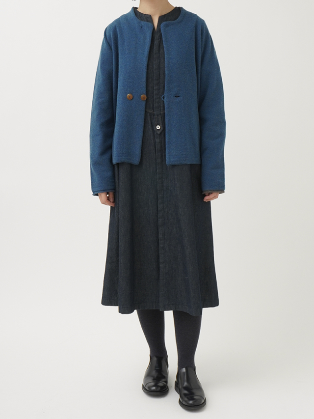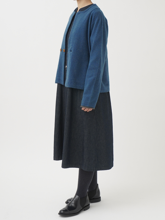 ワンピースやボリュームのあるボトムにバランスよく合わせられる着丈です。