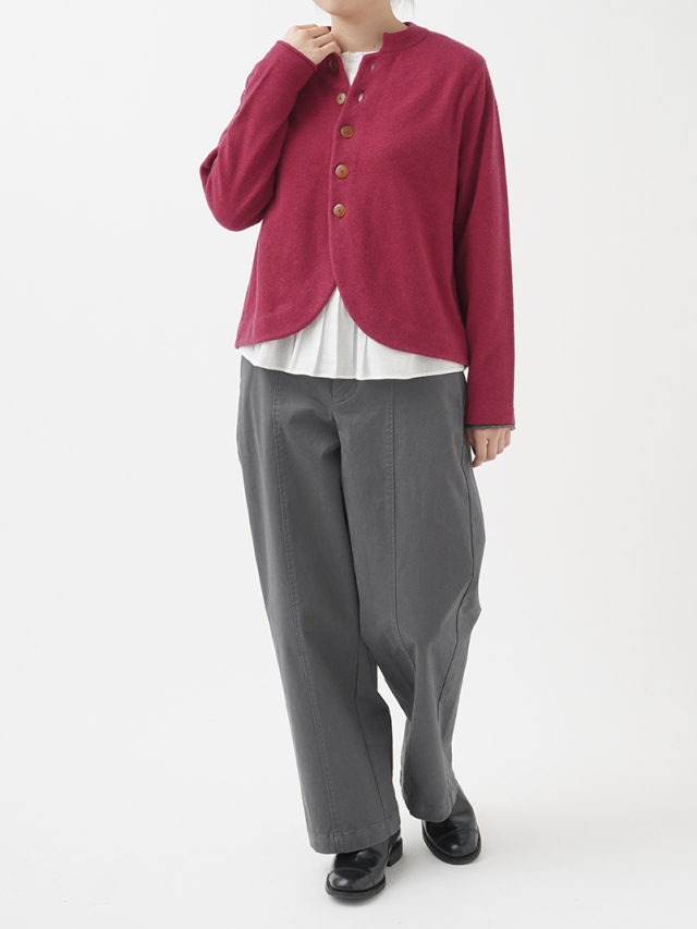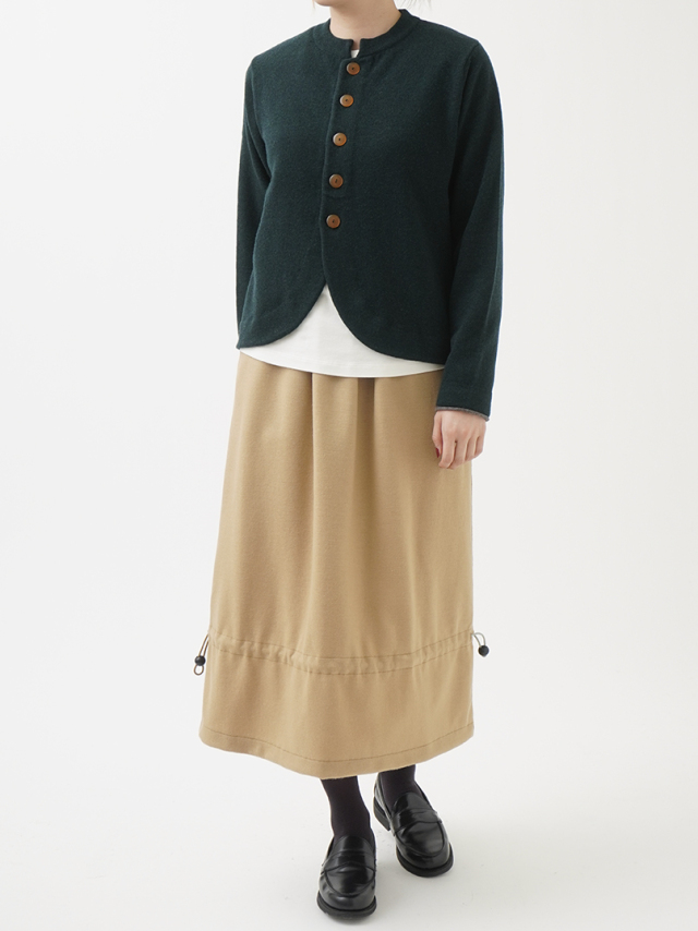 フロント部分の短いラウンドした裾のデザインで、ワンピースやボリュームのあるボトムにバランスよく合わせられます。