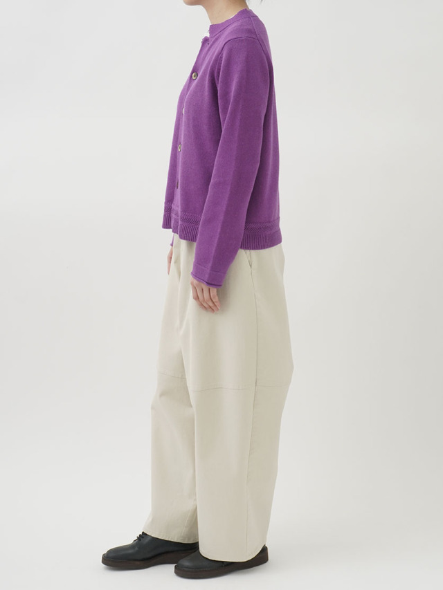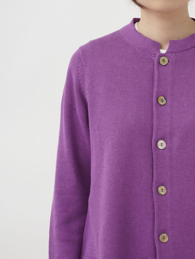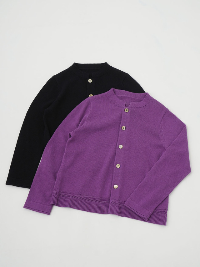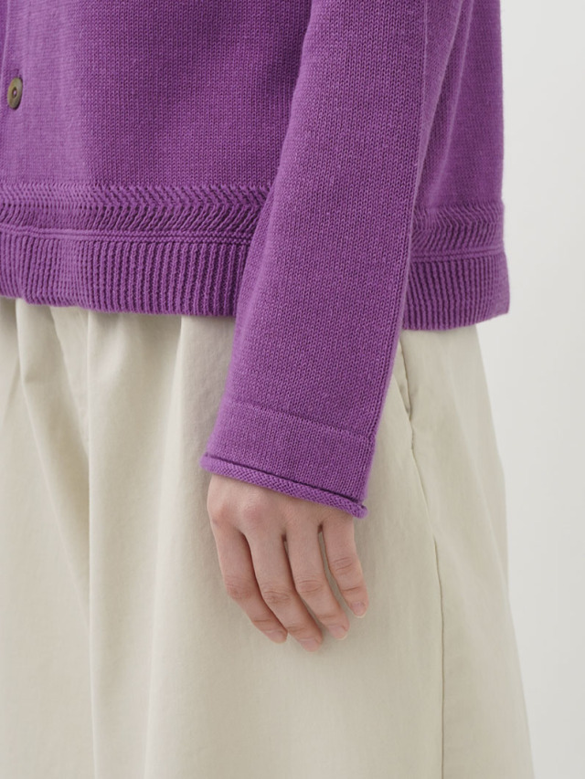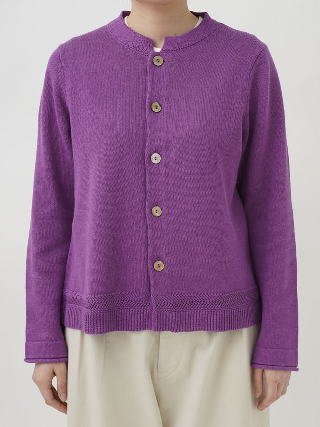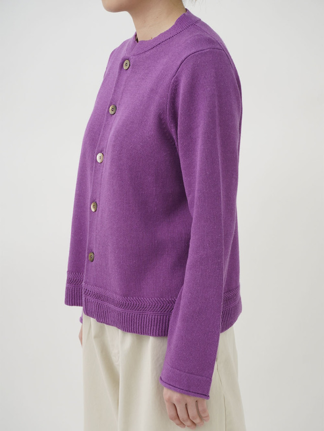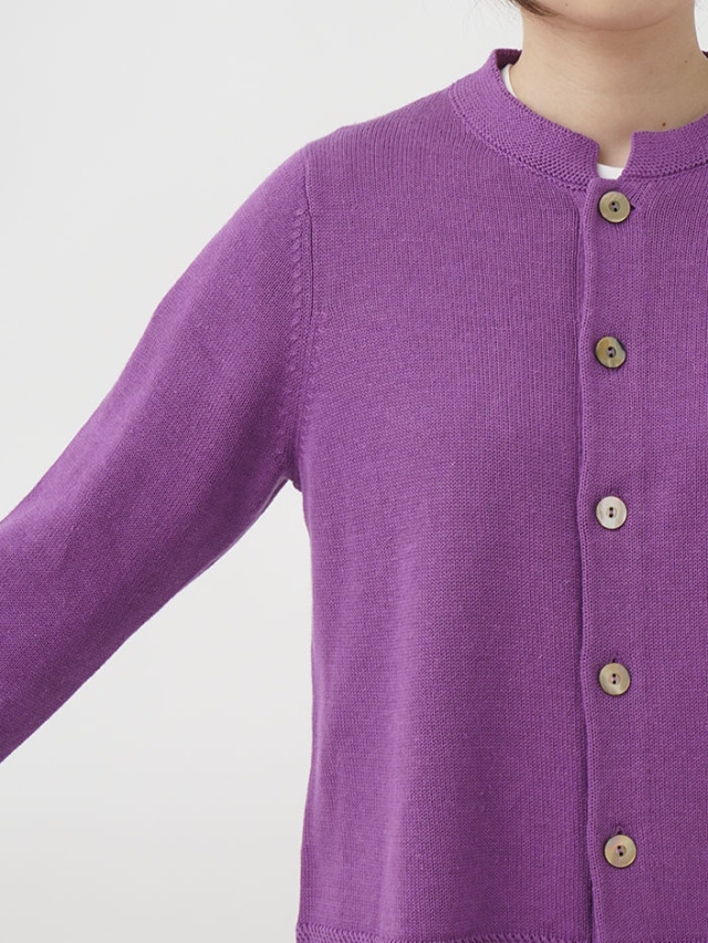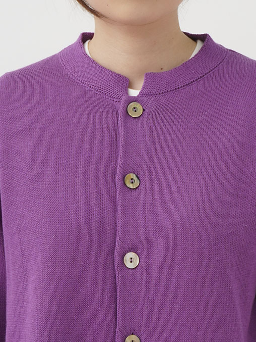 ラミーのさらっとした艶のある風合いと、コットンのなめらかさが混ざったオリジナルカラーのカーディガン。