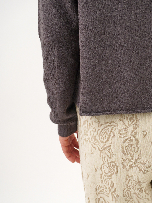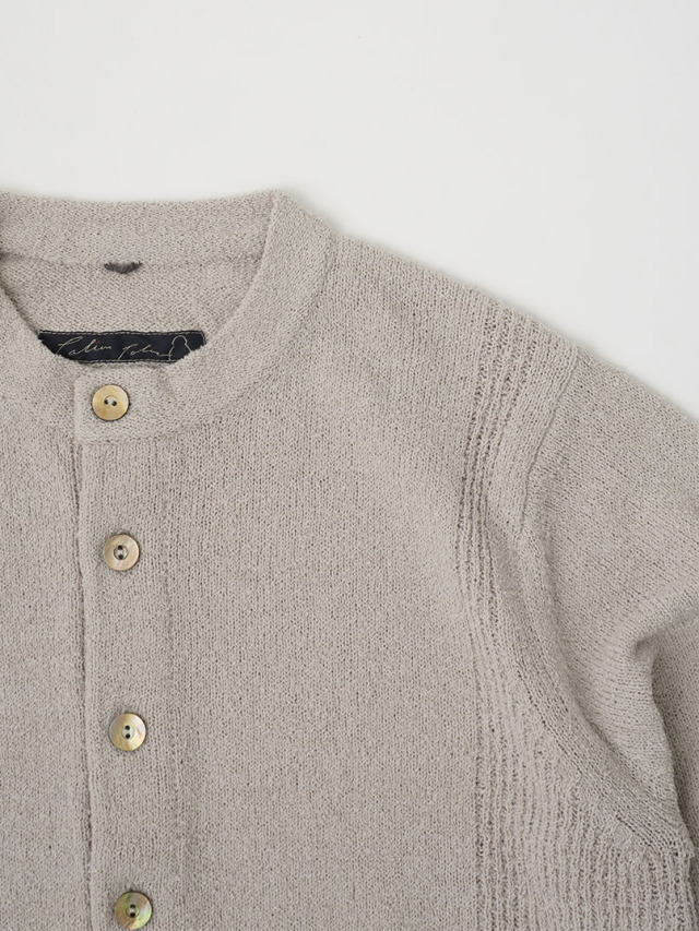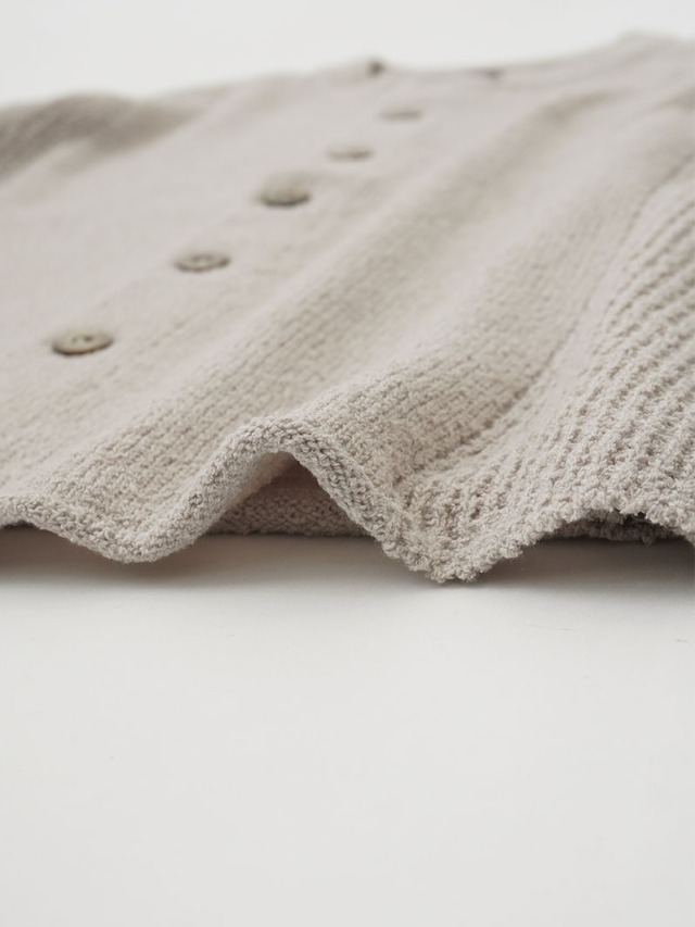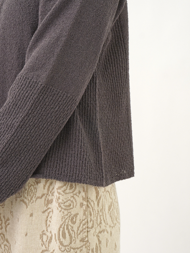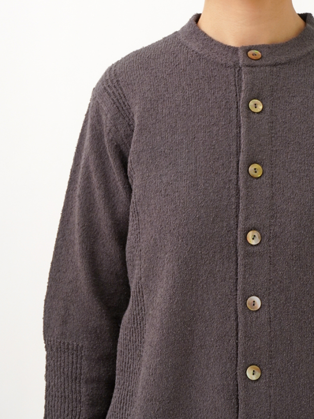 表情のあるループ糸を使用したクルー襟カーディガン。