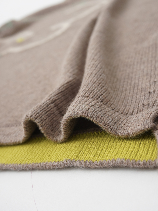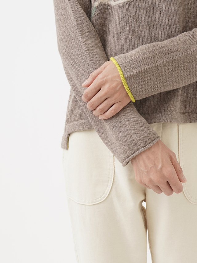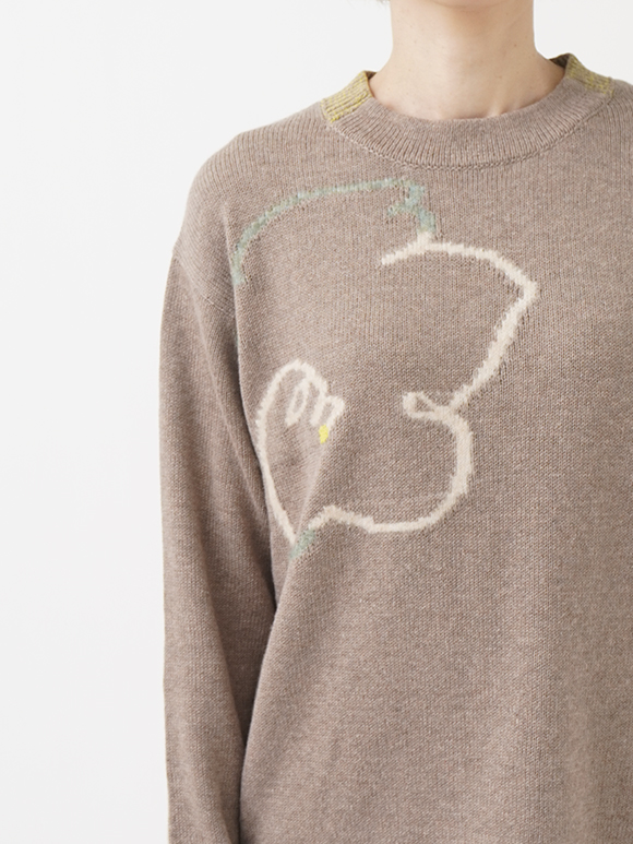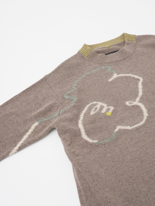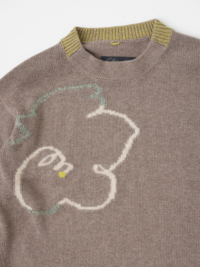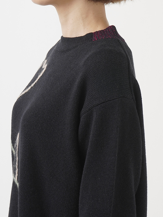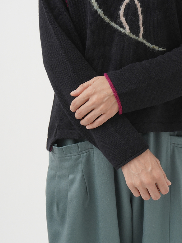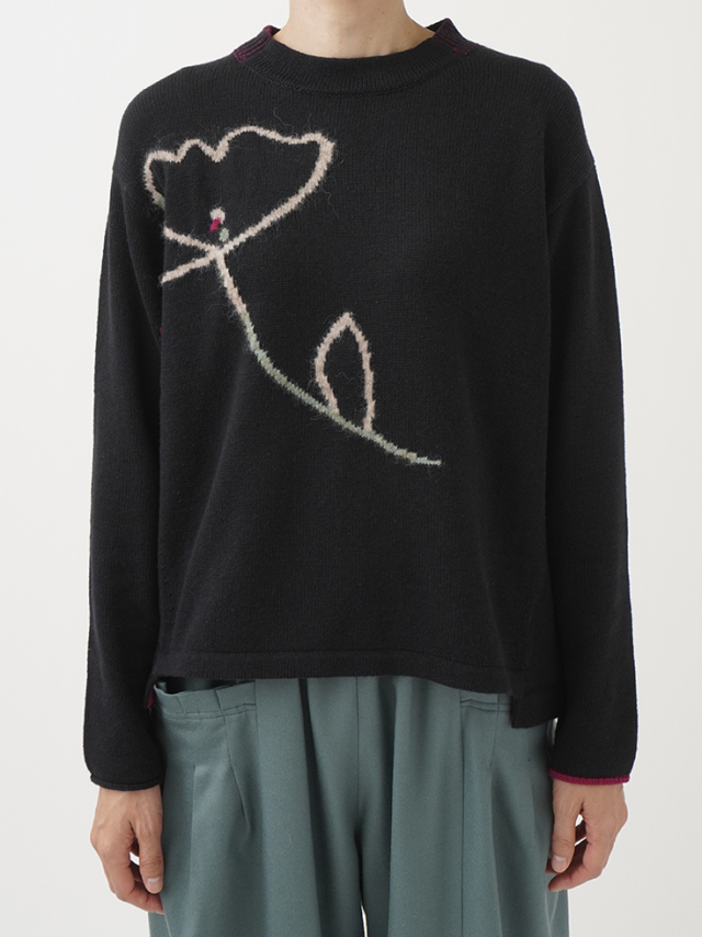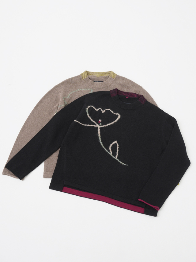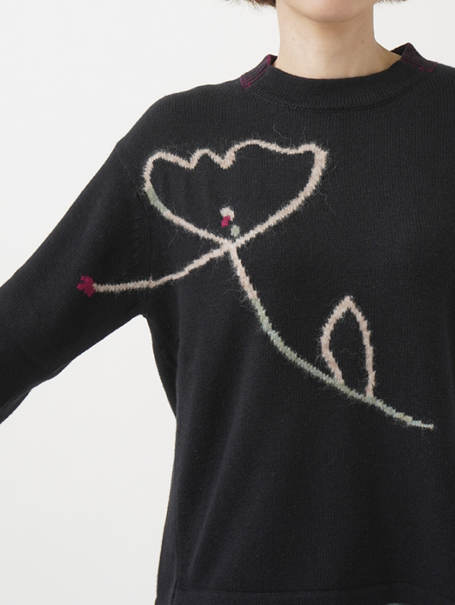 山茶花を一筆書きのような大胆なタッチで描いたニット。
