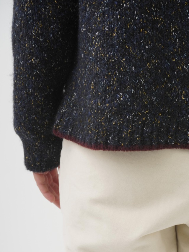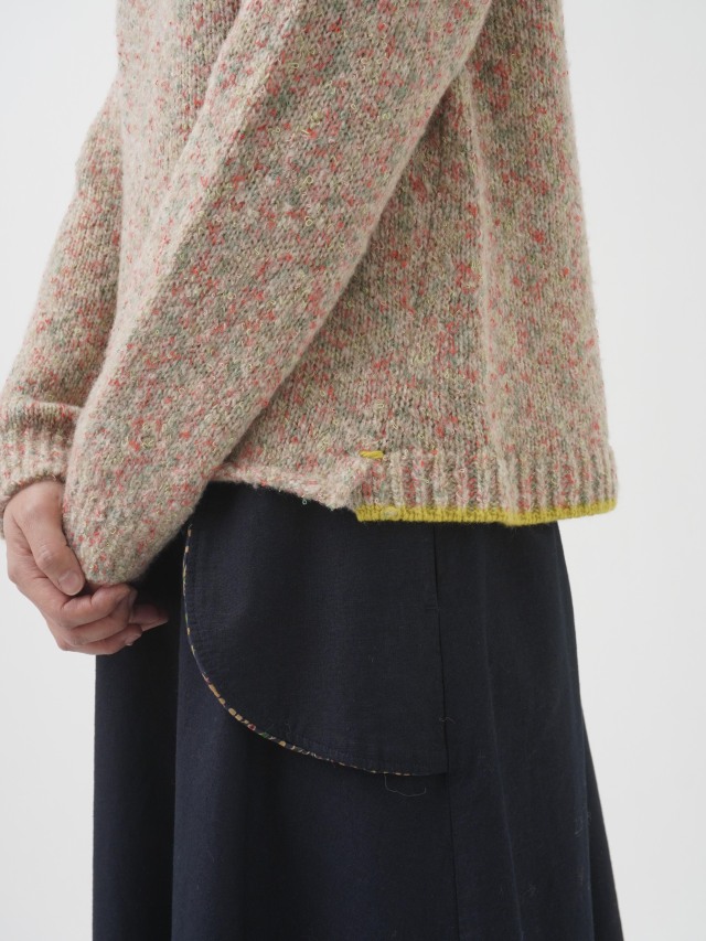 1本の糸の中で色が変わっていくカスリ染糸と、小さな輪がところどころ出ているブークレ糸をかけ合わせ、さらに糸で起毛することで、にじんだような独特のやわらかな風合いがうまれます。