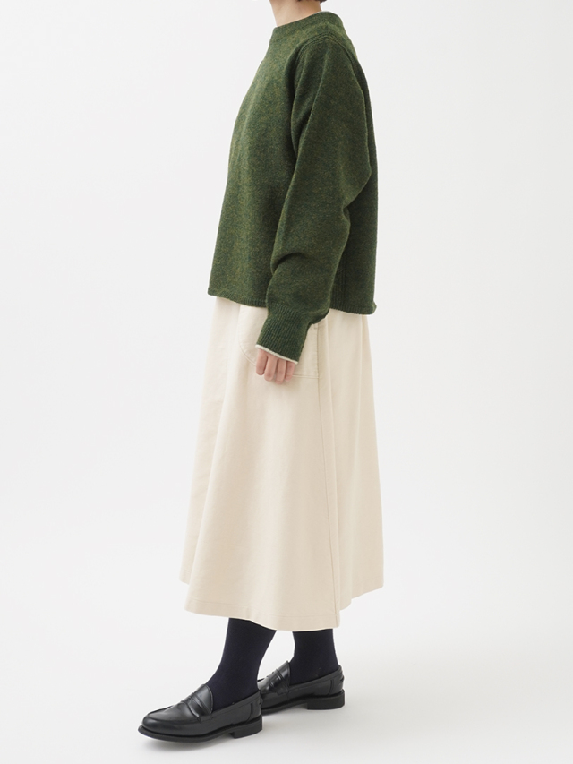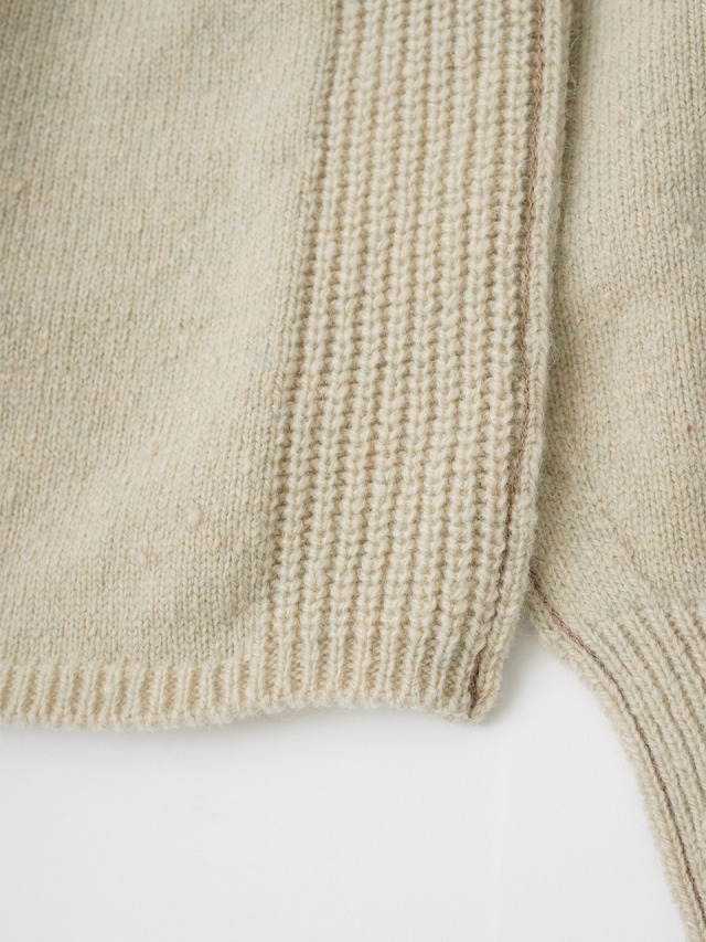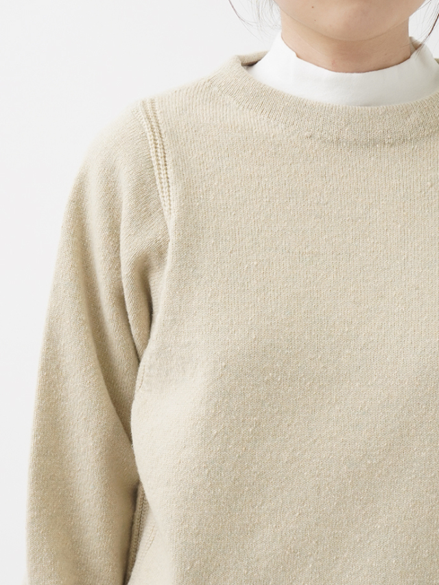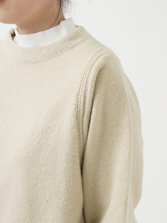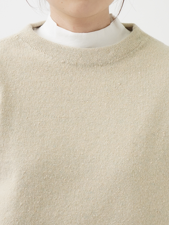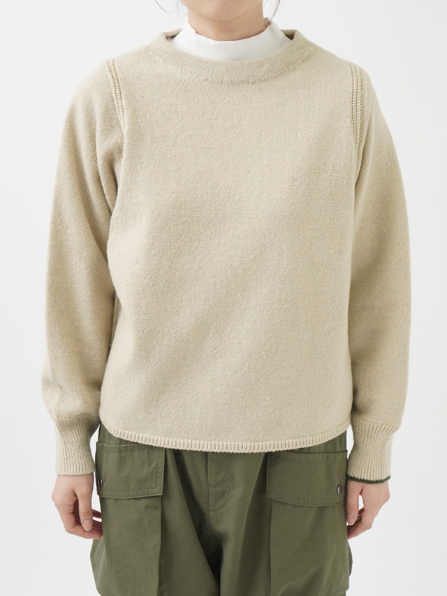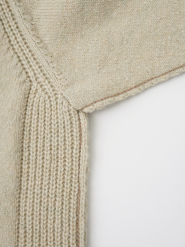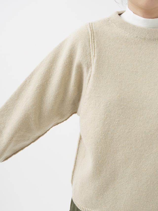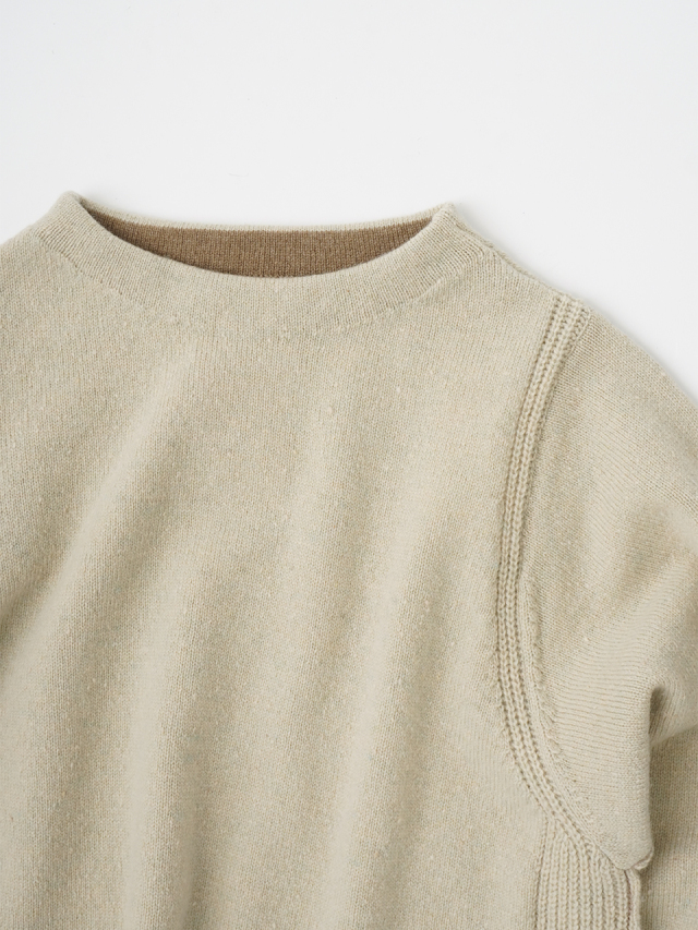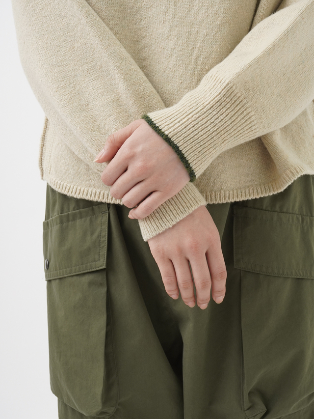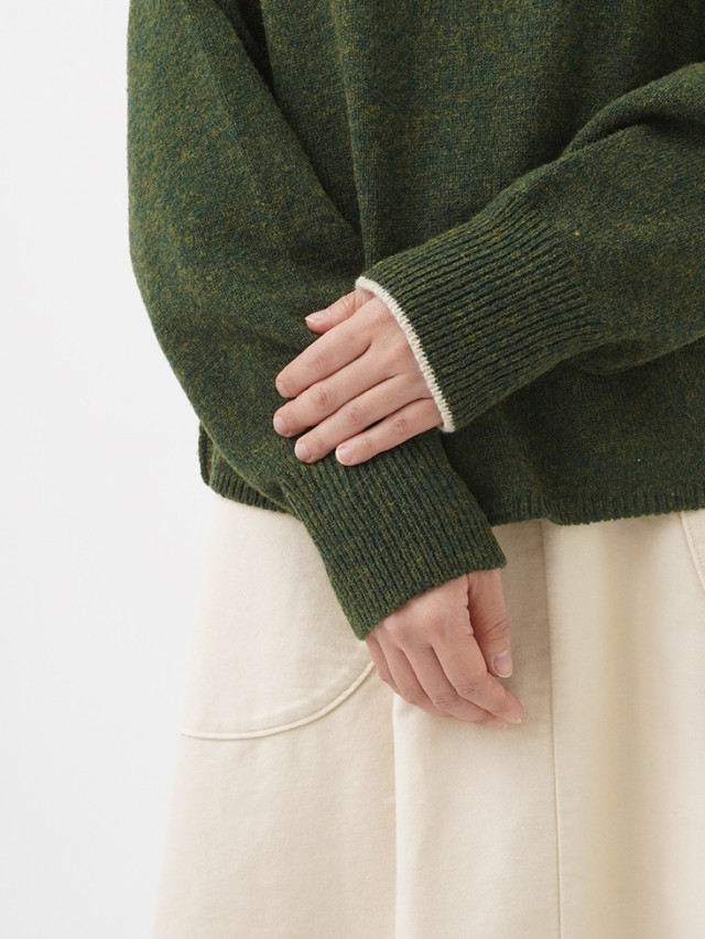 長めの袖口リブと、脇下の片畦編みの切替えがポイント。