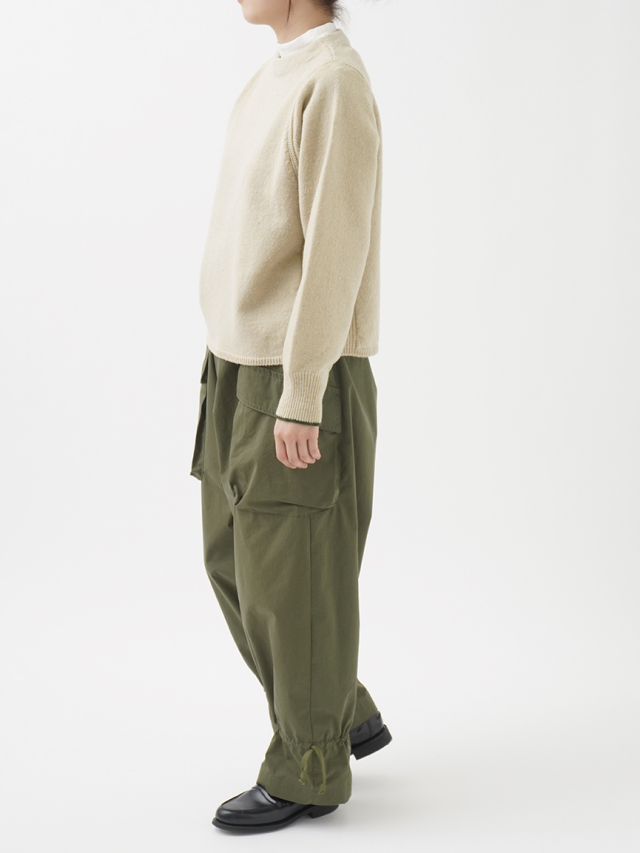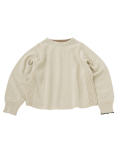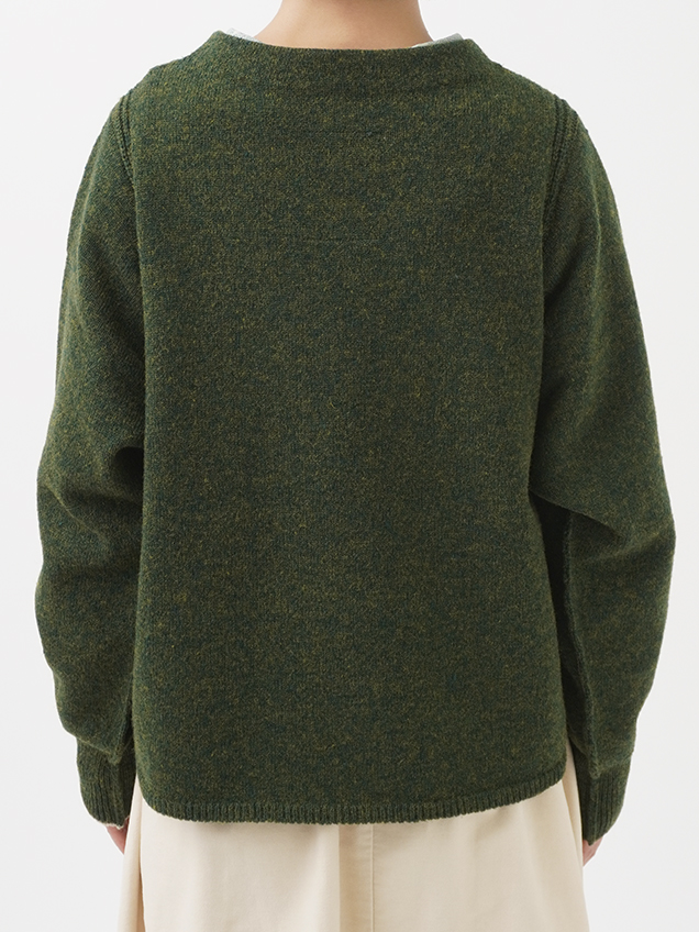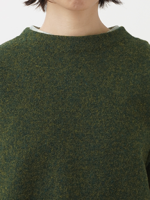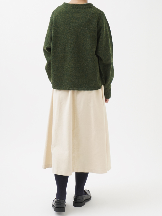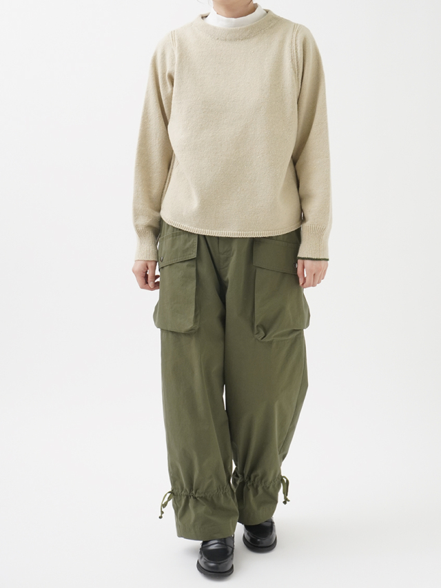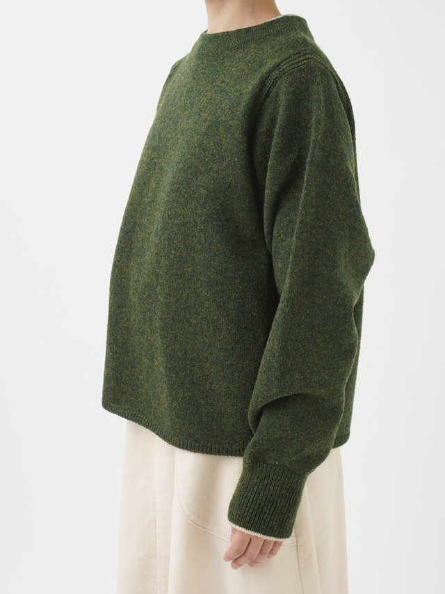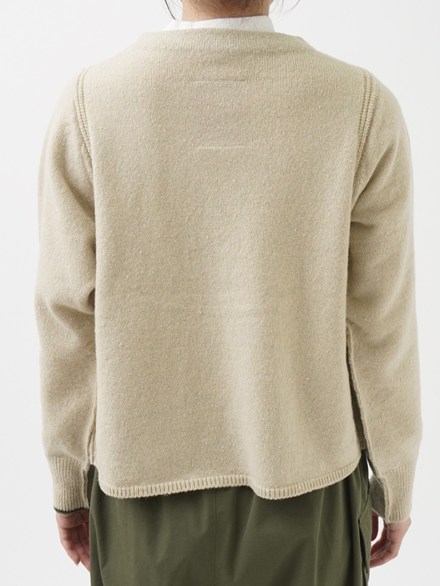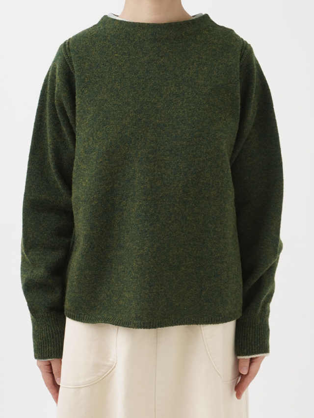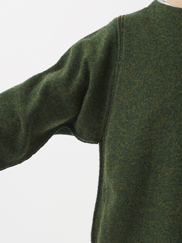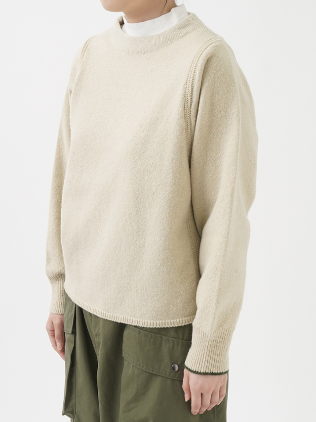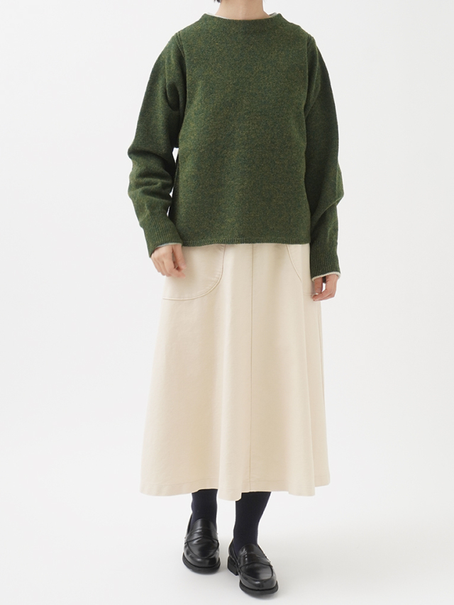 長めの袖口リブと、脇下の片畦編みの切替えがポイント。