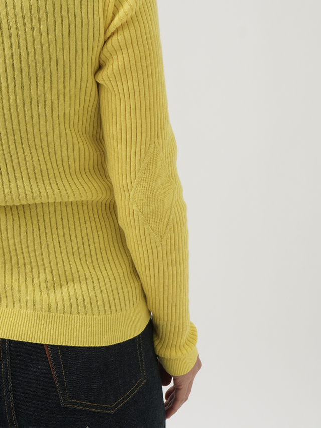 肘あて風のダイヤ型の編模様がアクセント。