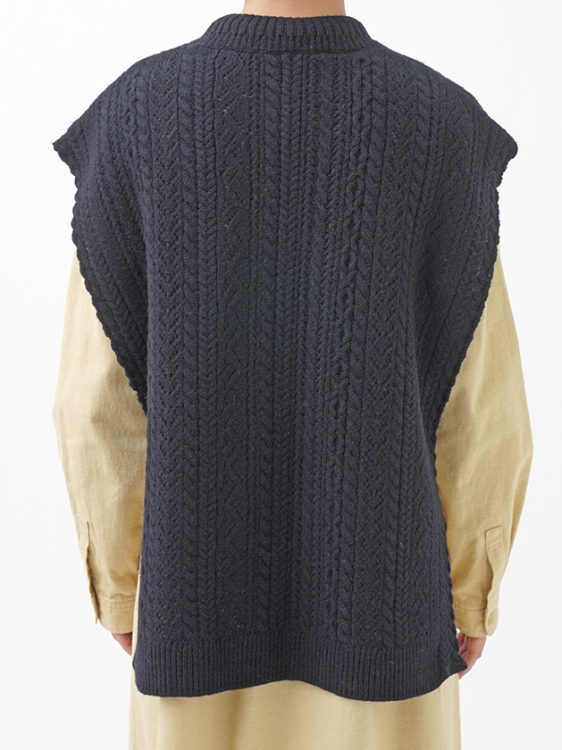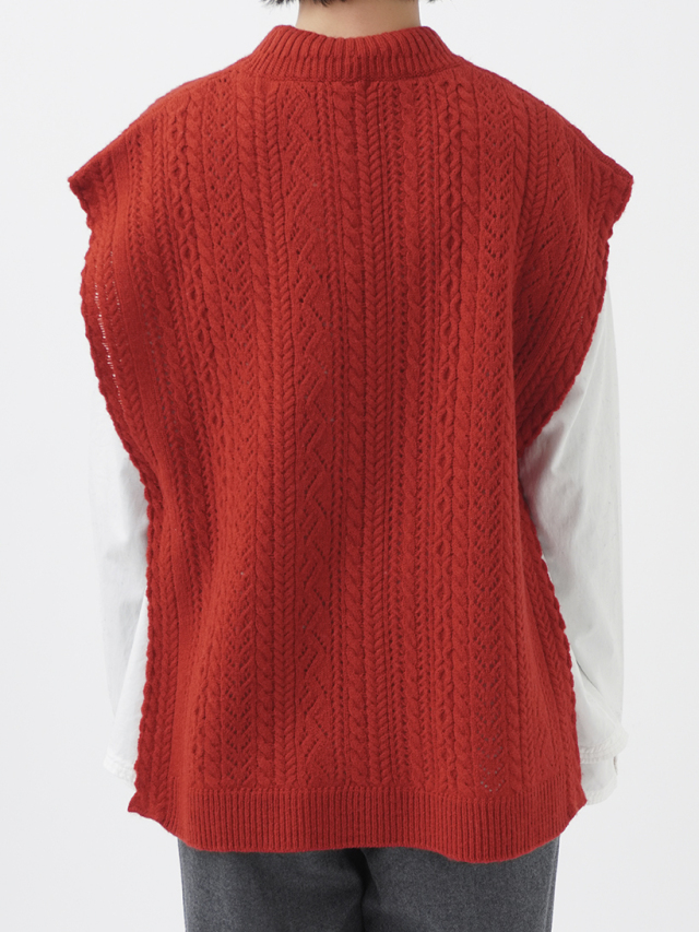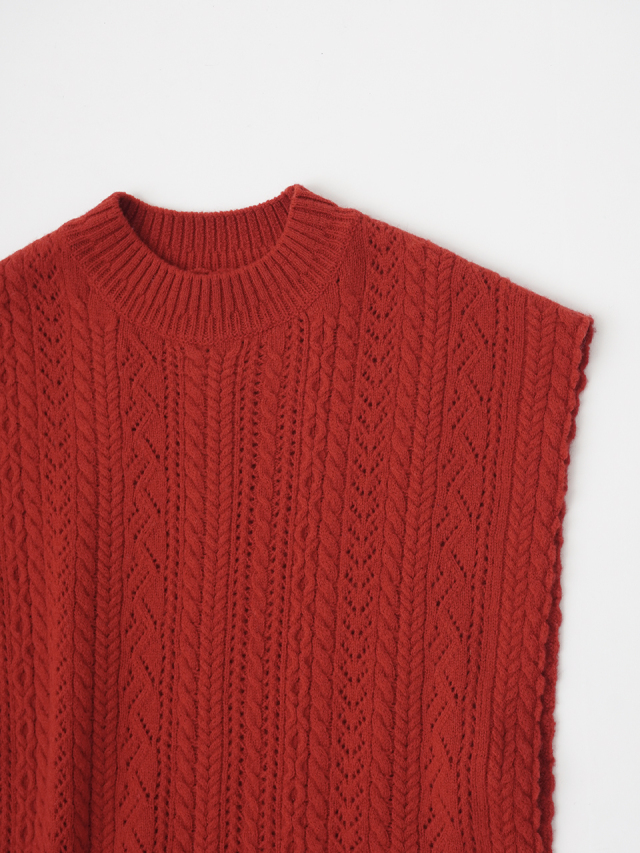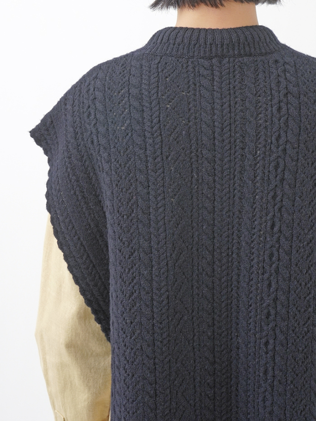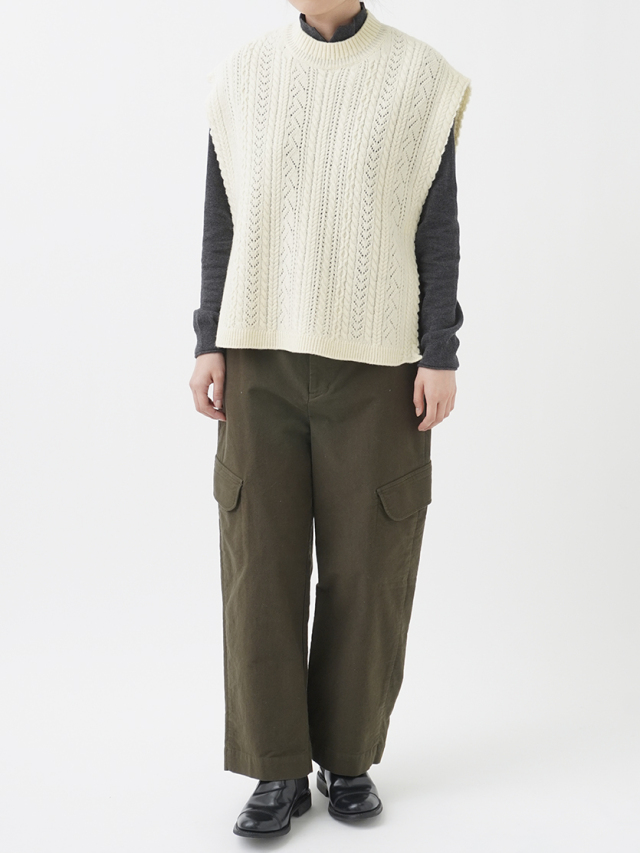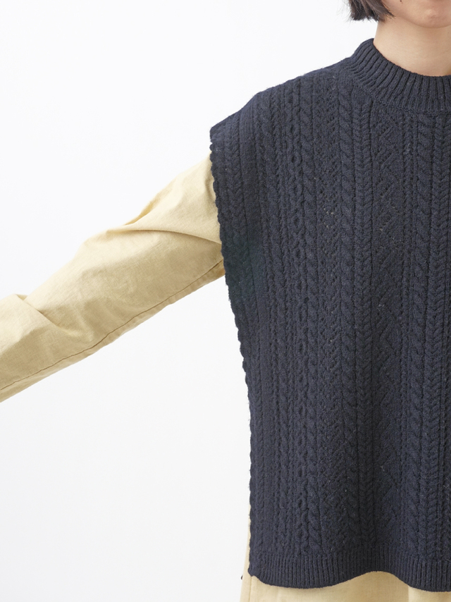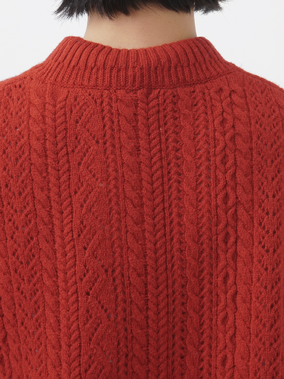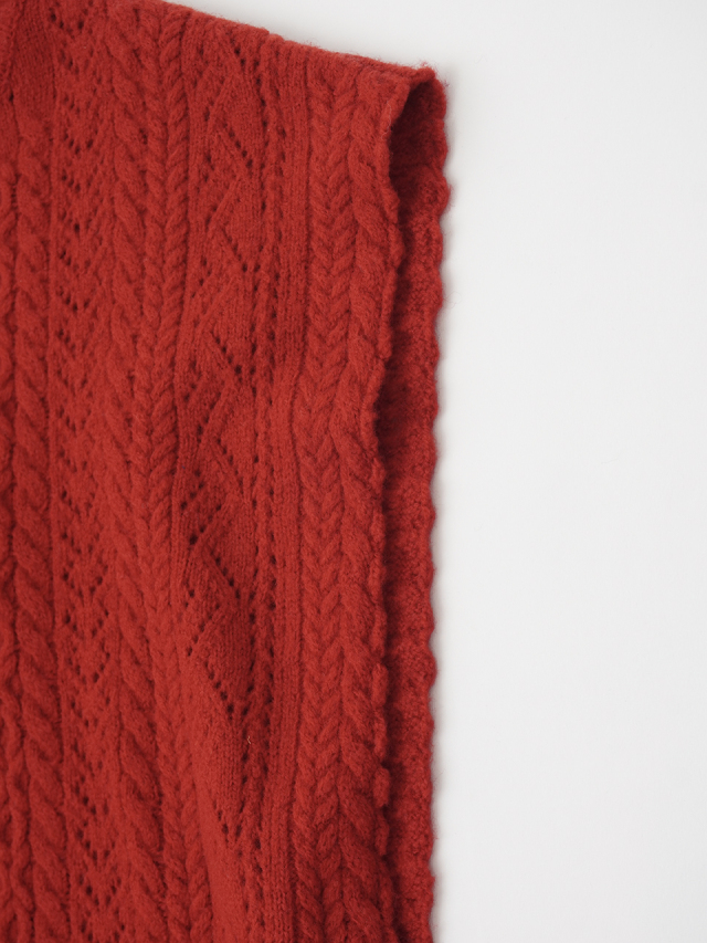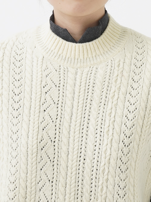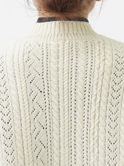 アランニットのような編み柄をいろいろと組み合わせ、レース編みを入れ、優しい雰囲気に。
