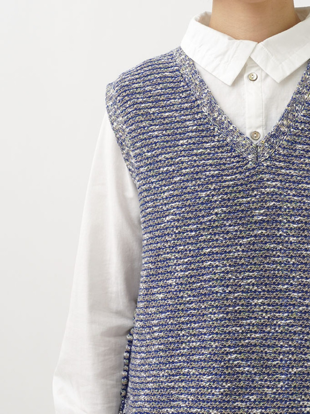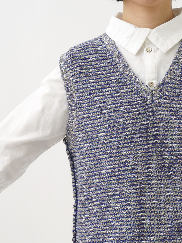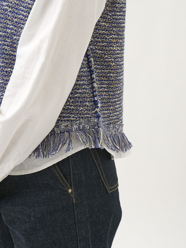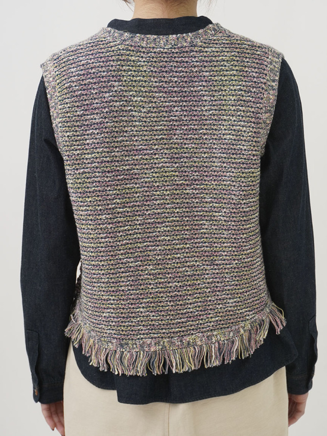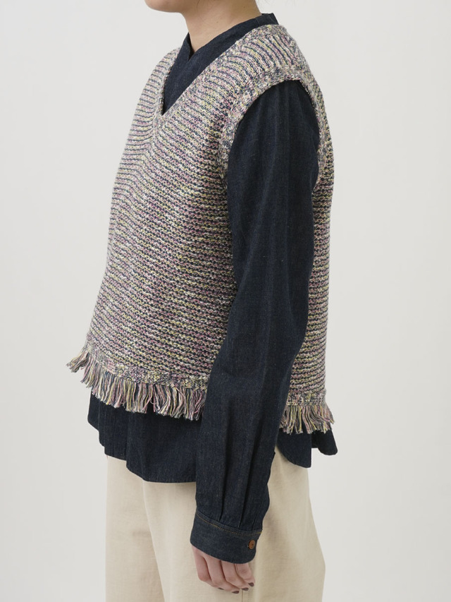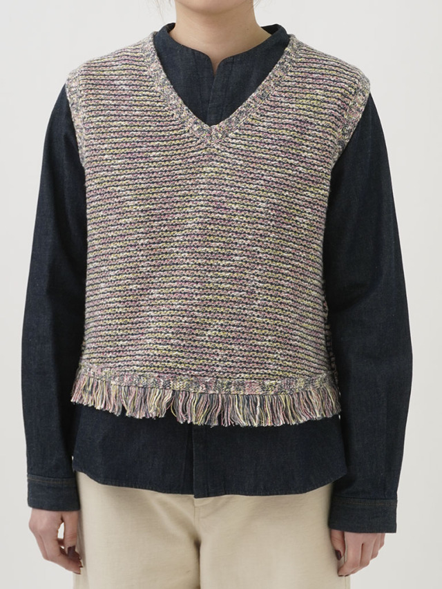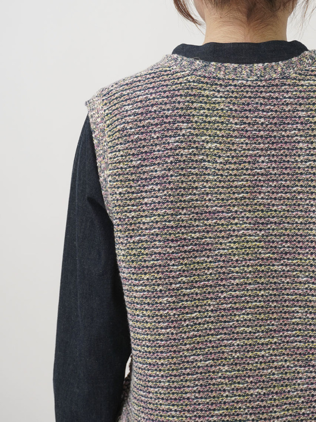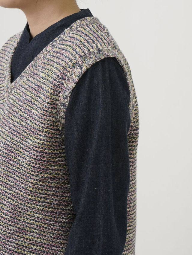 4色に染め分けられたカスリ糸で編んだニットベスト。