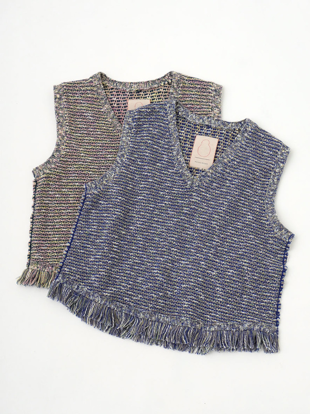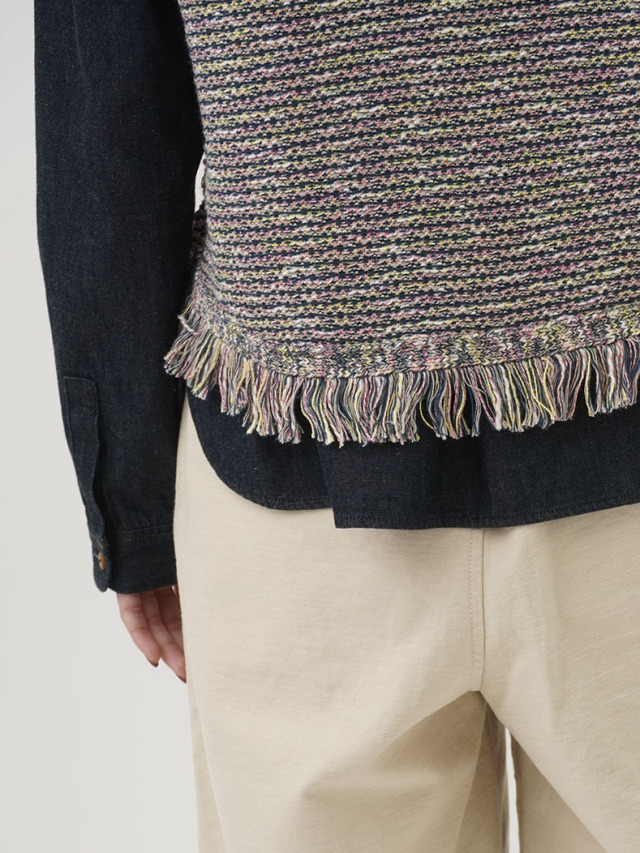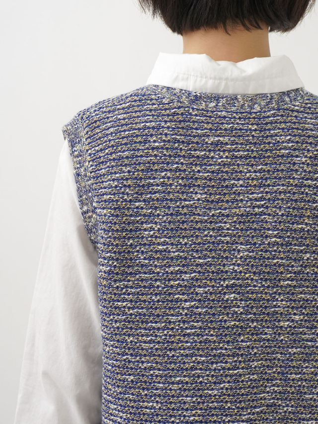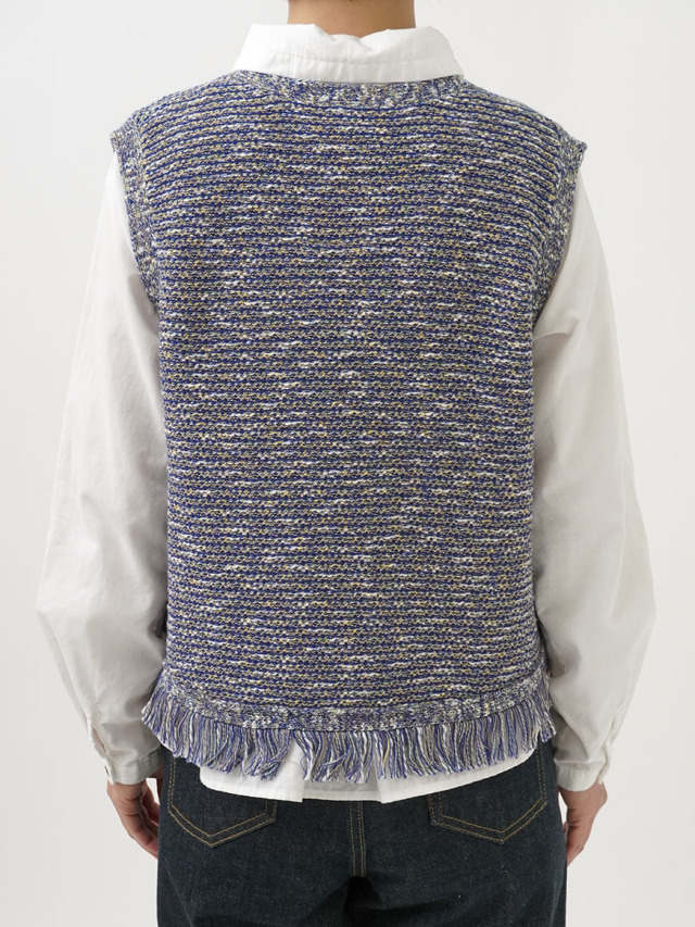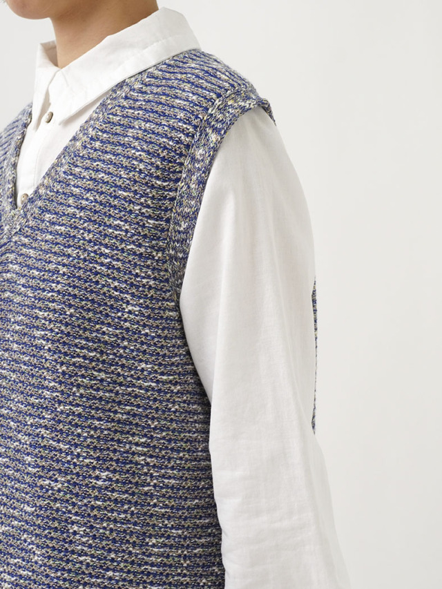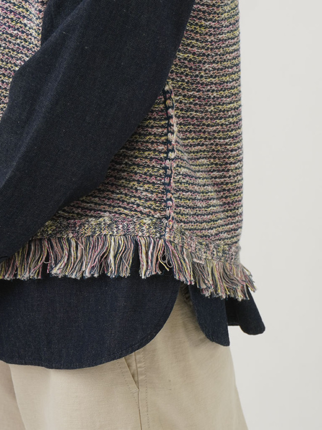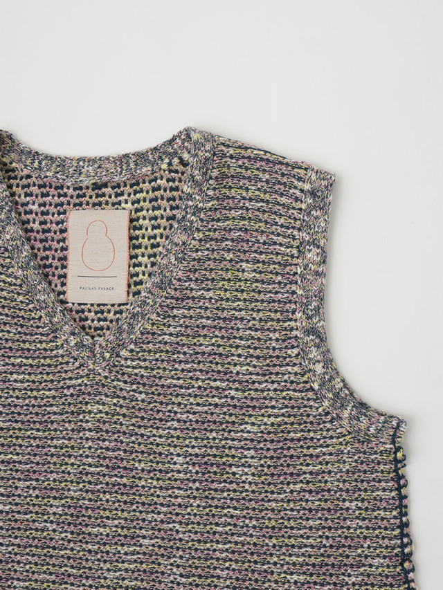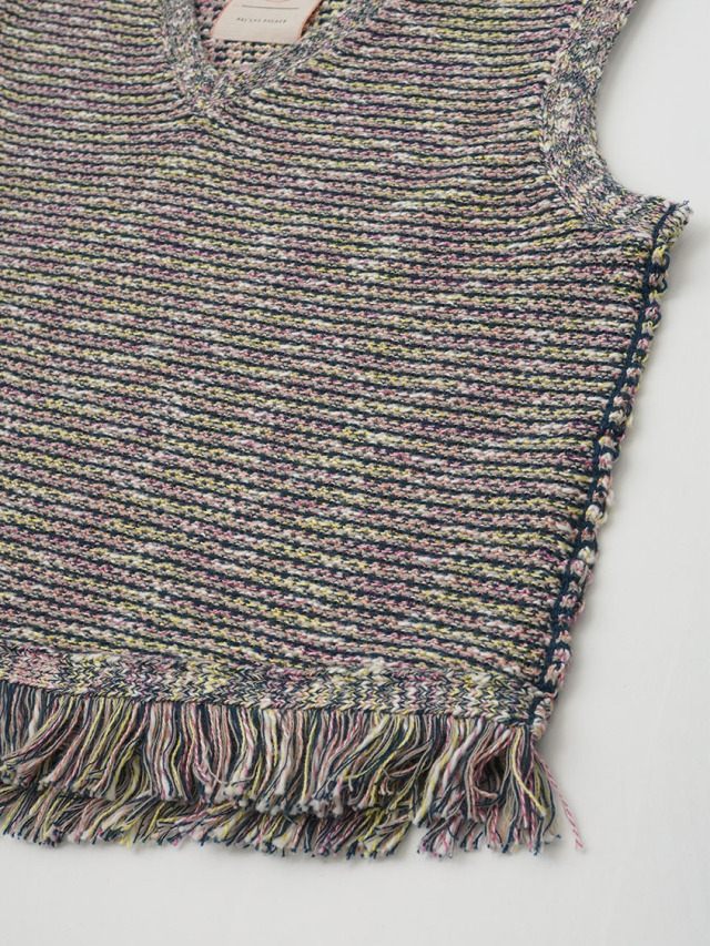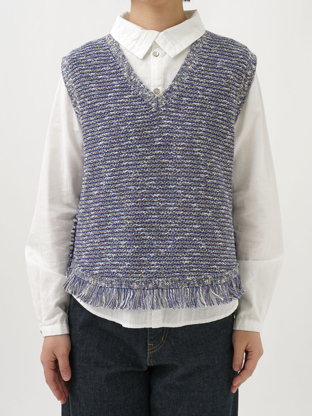 4色に染め分けられたカスリ糸で編んだニットベスト。