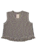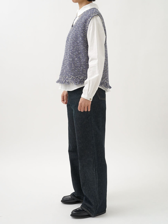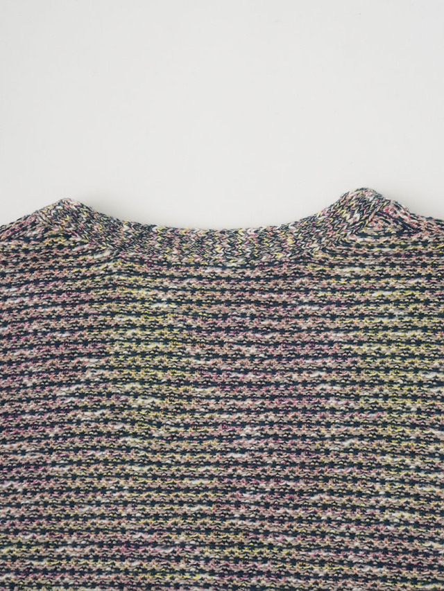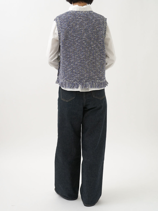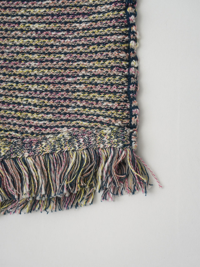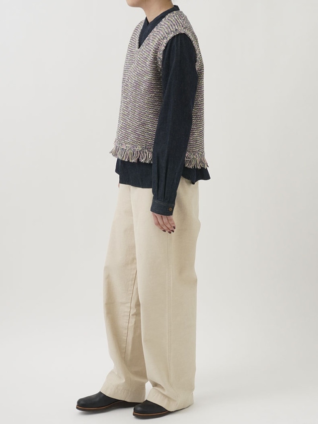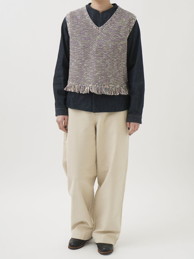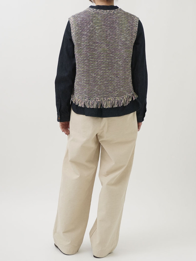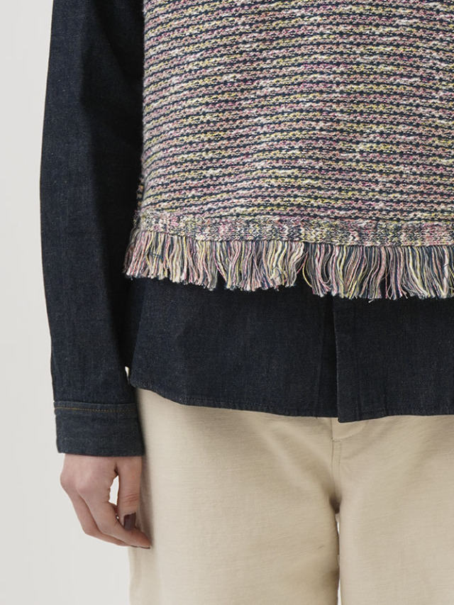 4色に染め分けられたカスリ糸で編んだニットベスト。