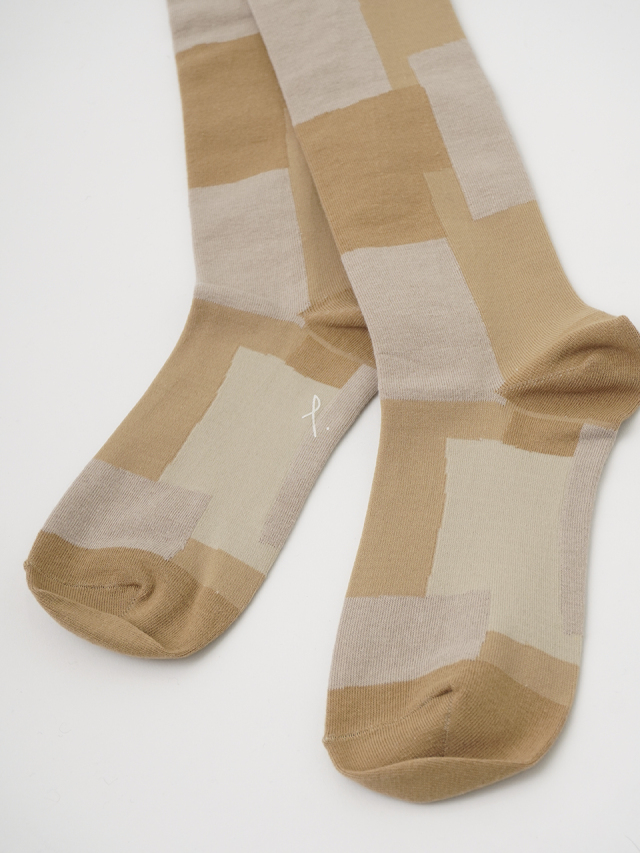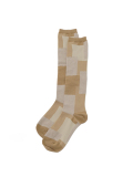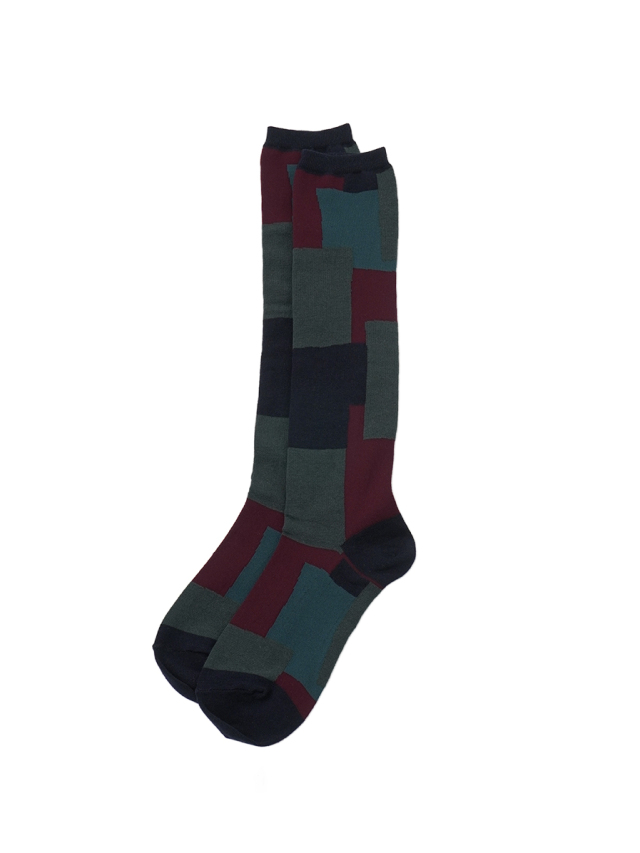 パッチワークのような、リズムのあるブロック柄のハイソックス。